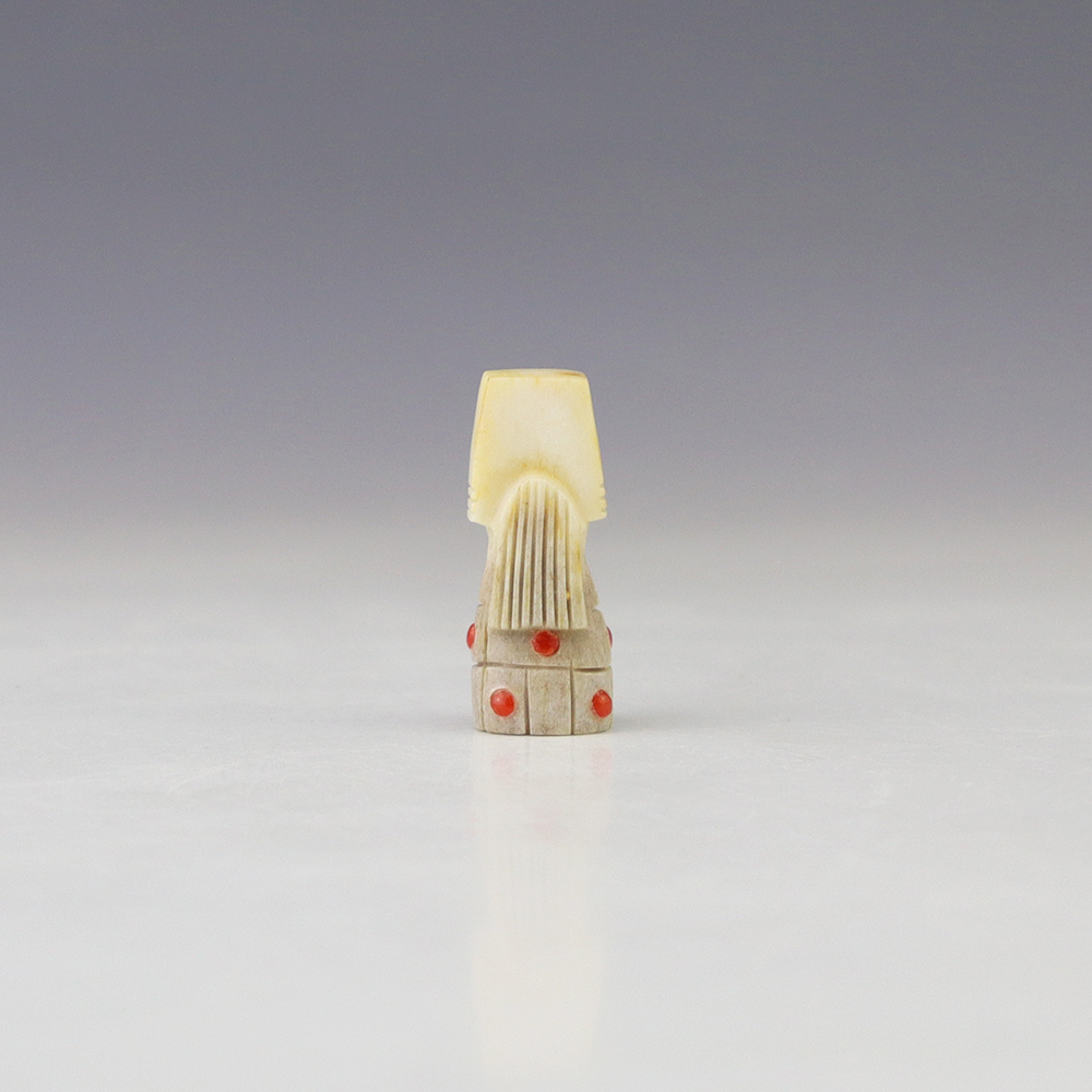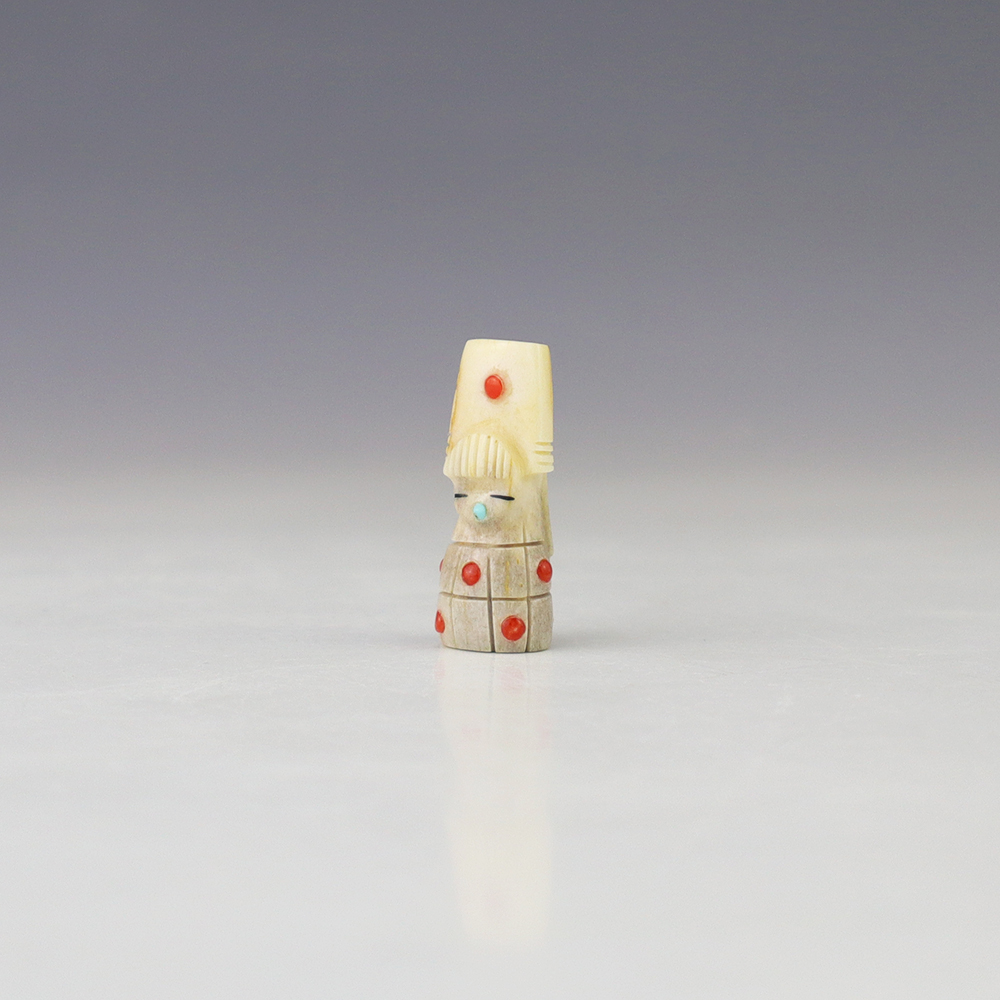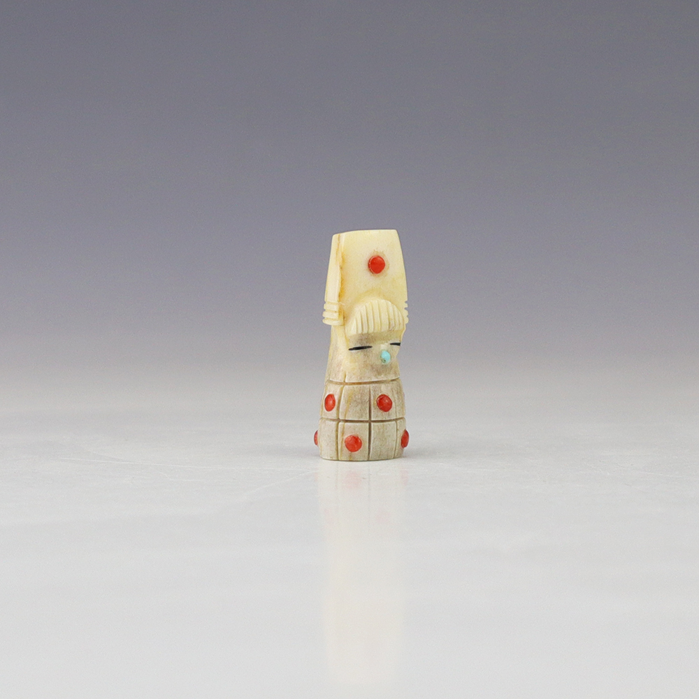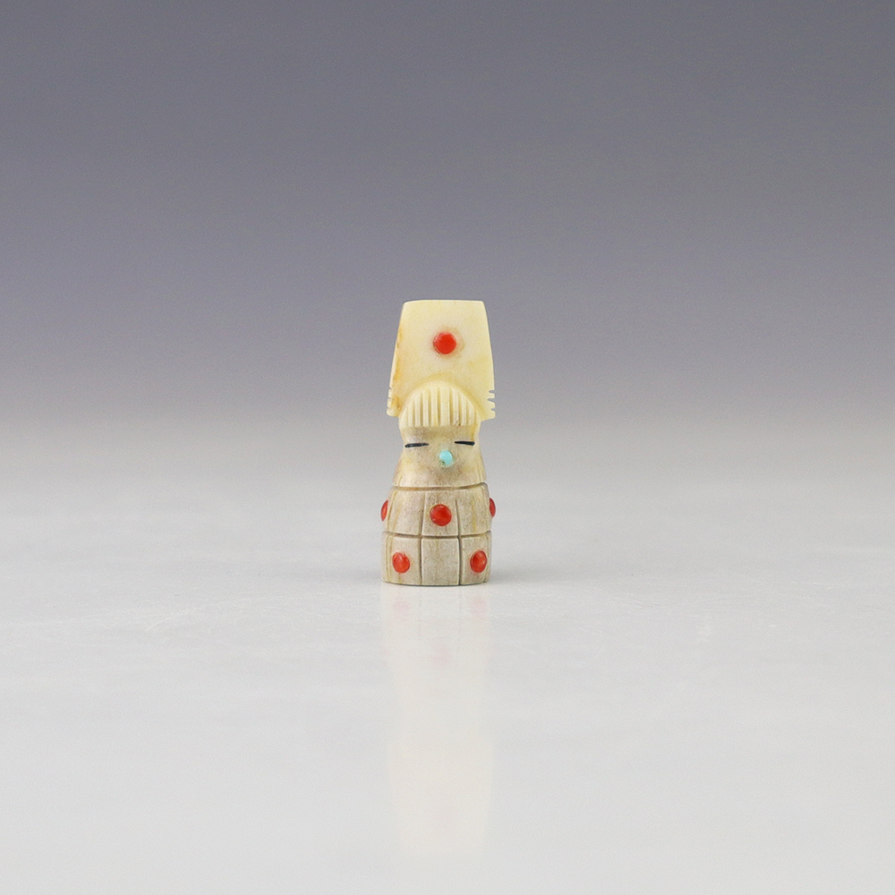 Zuni artist Gabe Sice hand carved this lovely maiden fetish. Made out of antler with intricate detail and inlaid with natural Sleeping Beauty Turquoise, Mediterranean Coral, and Penn Shell. This maiden would make a great addition to your Native American or Zuni fetish collection. Signed 2 3/8” tall x 3/4”...