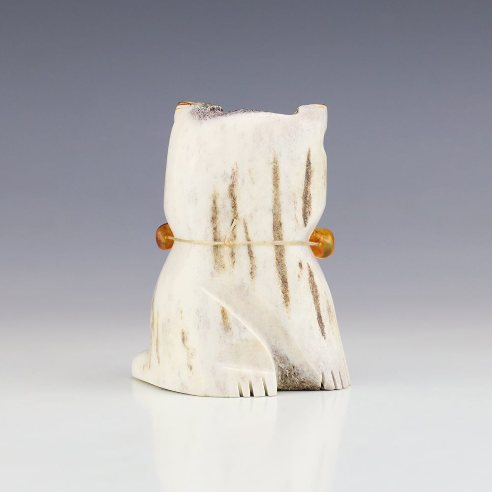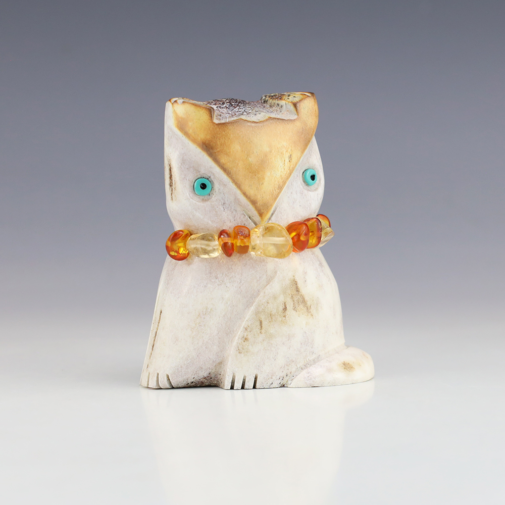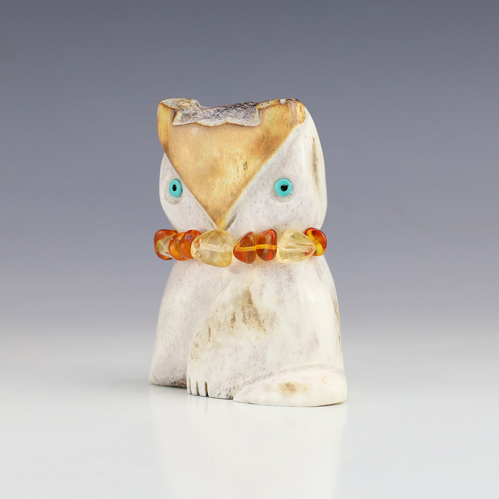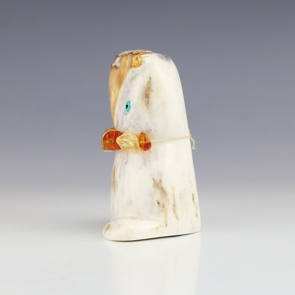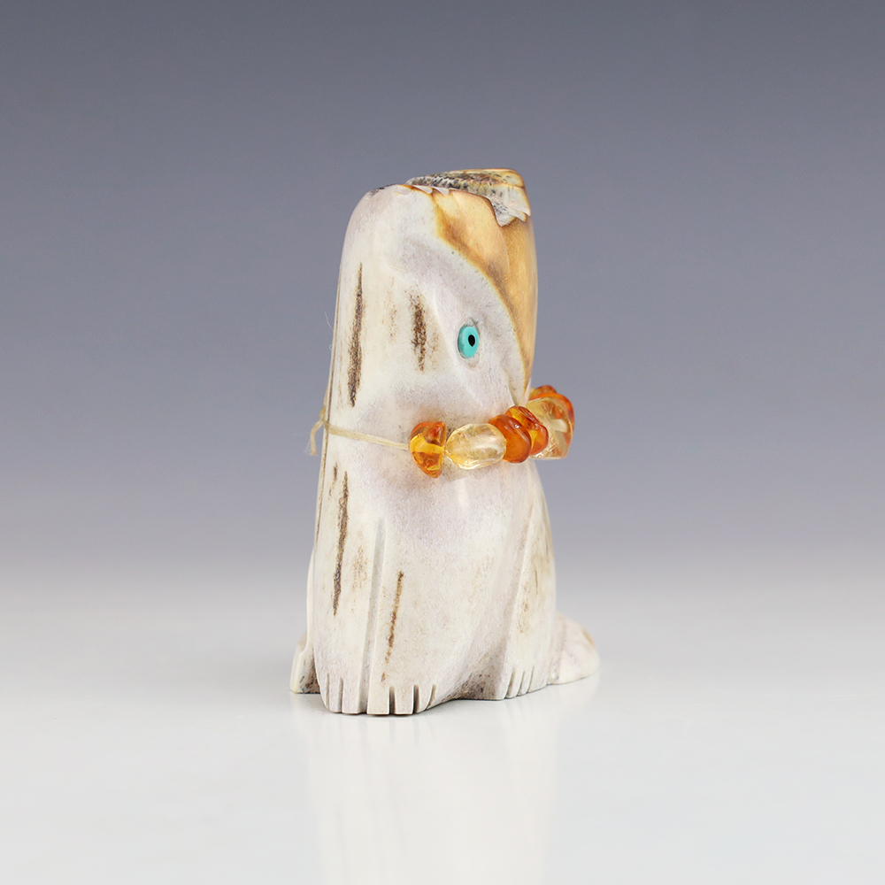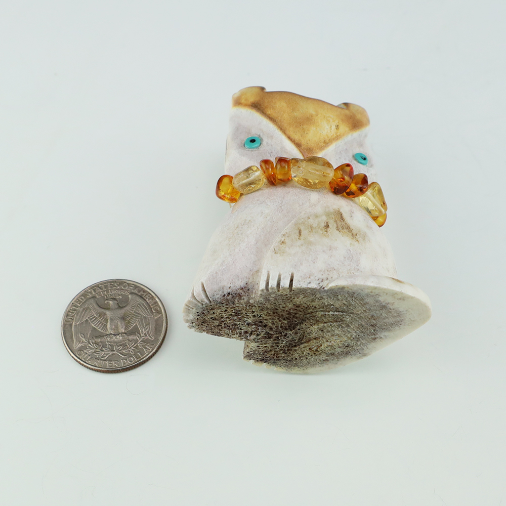 The Owl is the protector of the home. He represents wisdom and truth, and has the ability to see what others cannot. Zuni artist Robert Weahkee made this wonderful owl fetish. Hand carved out of Antler. This great carving would make a great addition to your Native American art or Zuni fetish collection. Signed