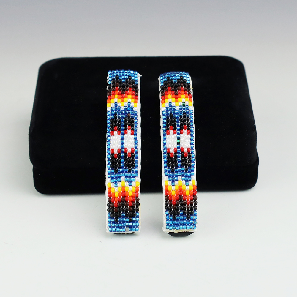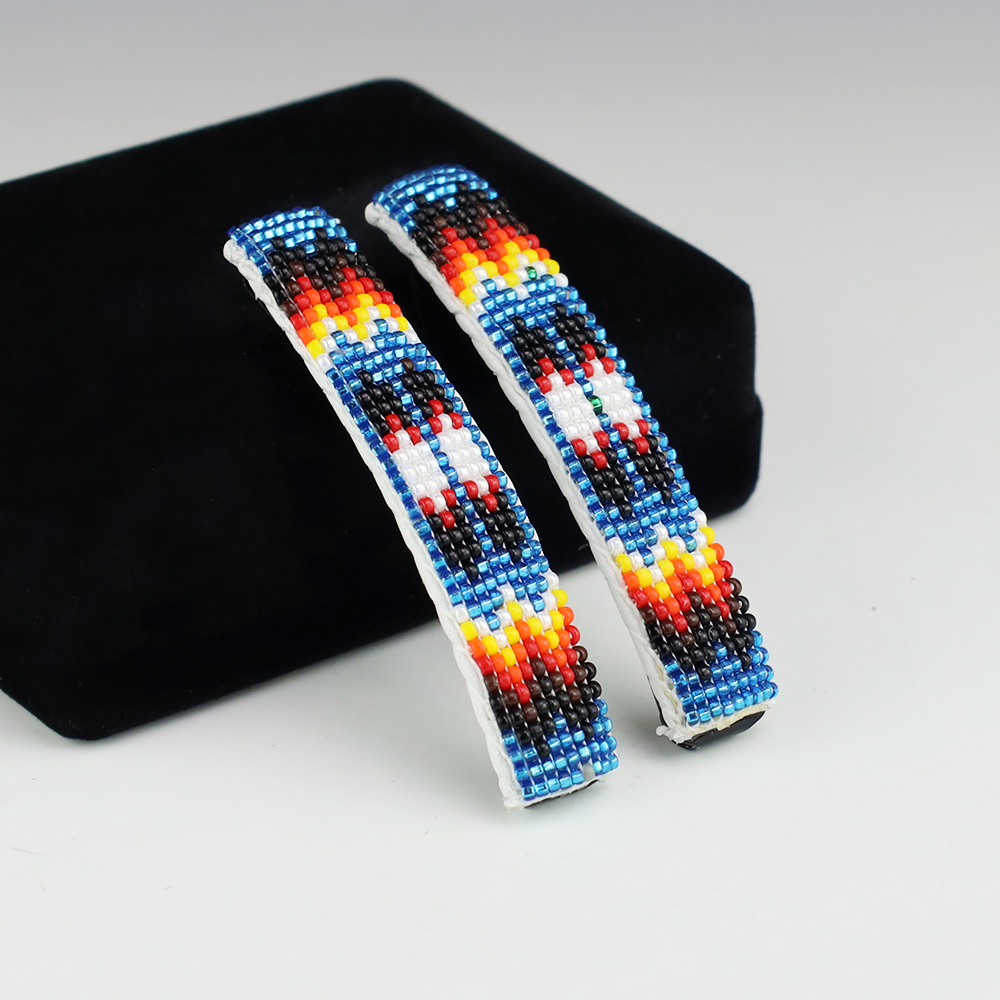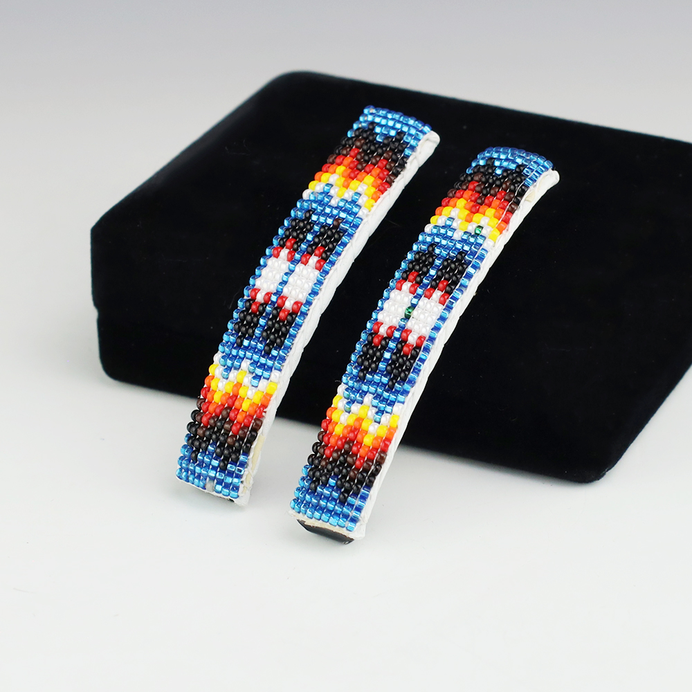 Navajo artist Sharon Hunt hand beaded these beautiful barrettes. Great colors that compliment the design. Sharon uses tiny seed beads to create his jewelry and backs it with soft leather.