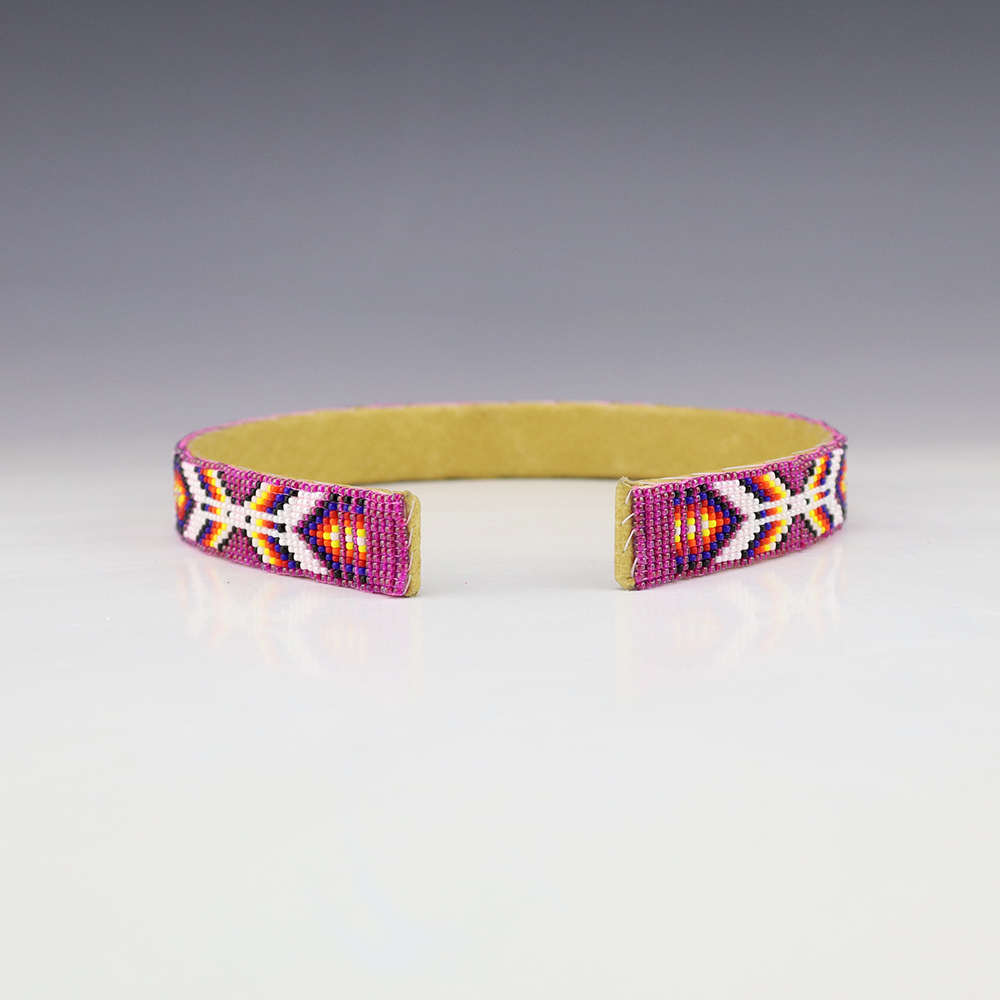 Lovely hand beaded baby bracelet with by Charlene Jackson. Great patterns and colors! The entire inner circumference is about 4 7/8″ including opening of 5/8″. The bracelet is beaded over copper, so you adjust the size. 1/2″ wide When trade beads were introduced to Native Americans, they made these colorful...