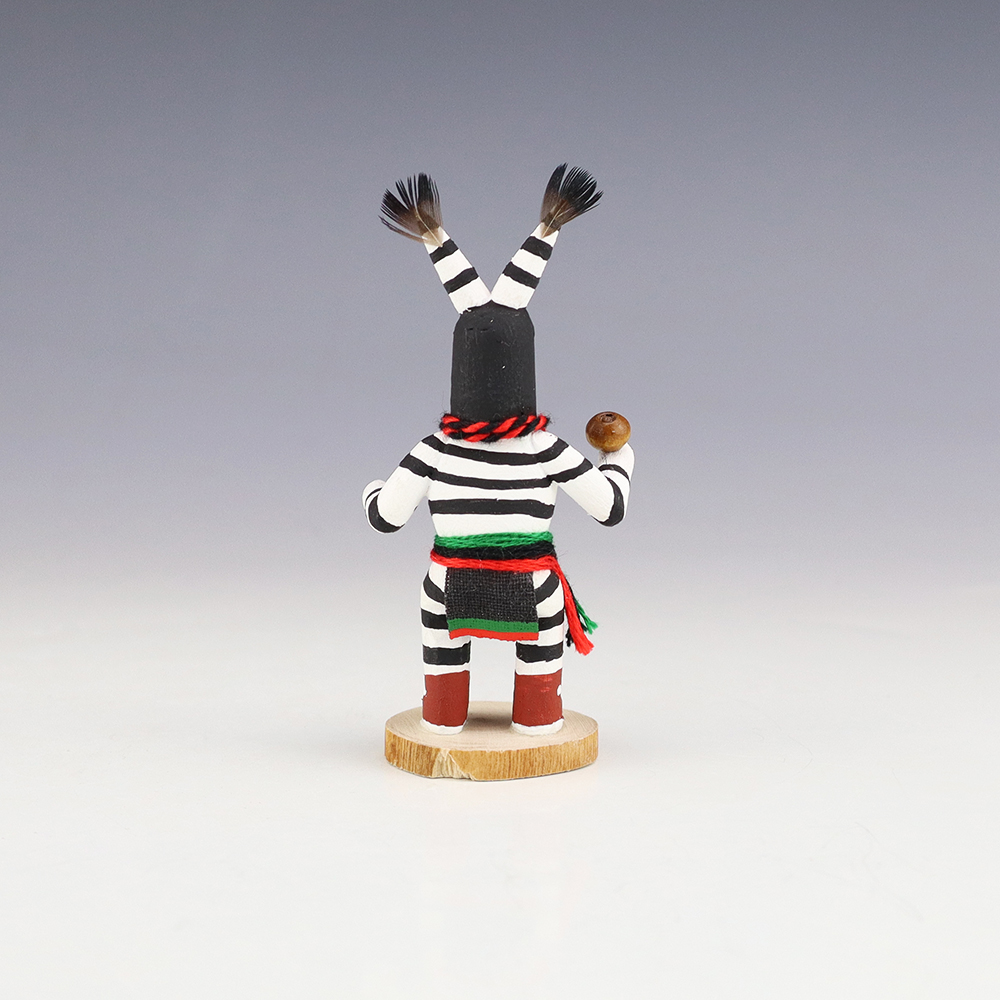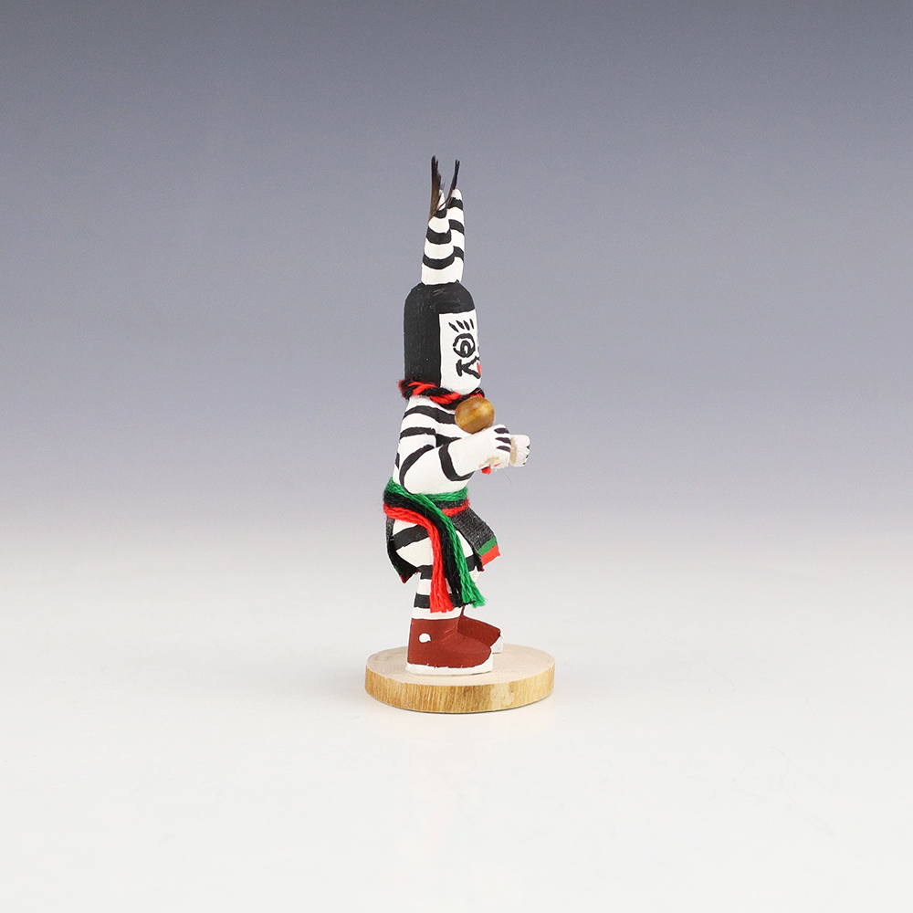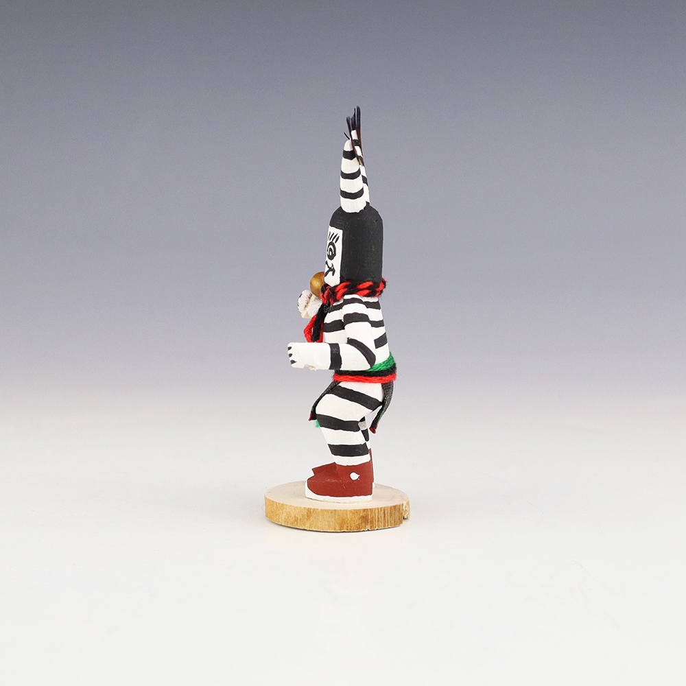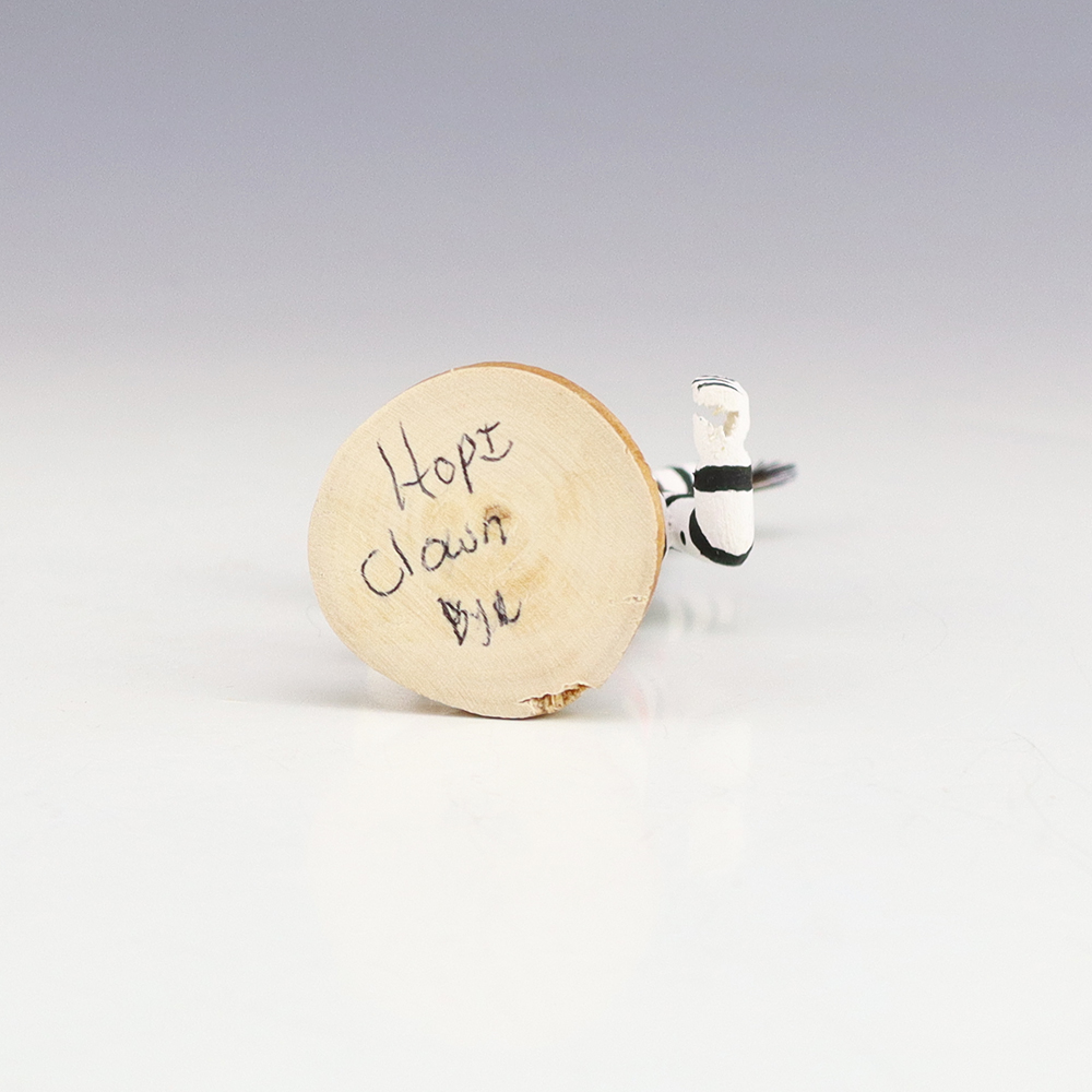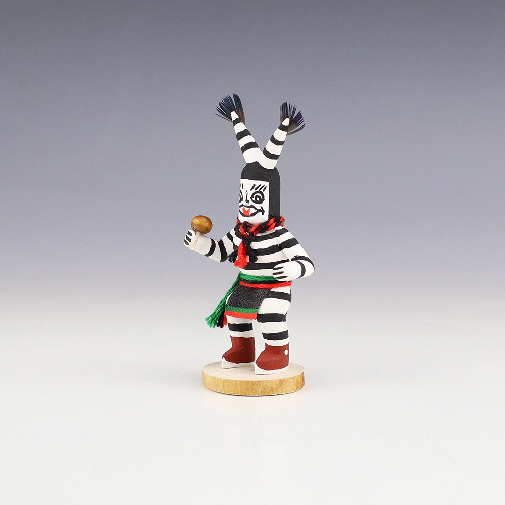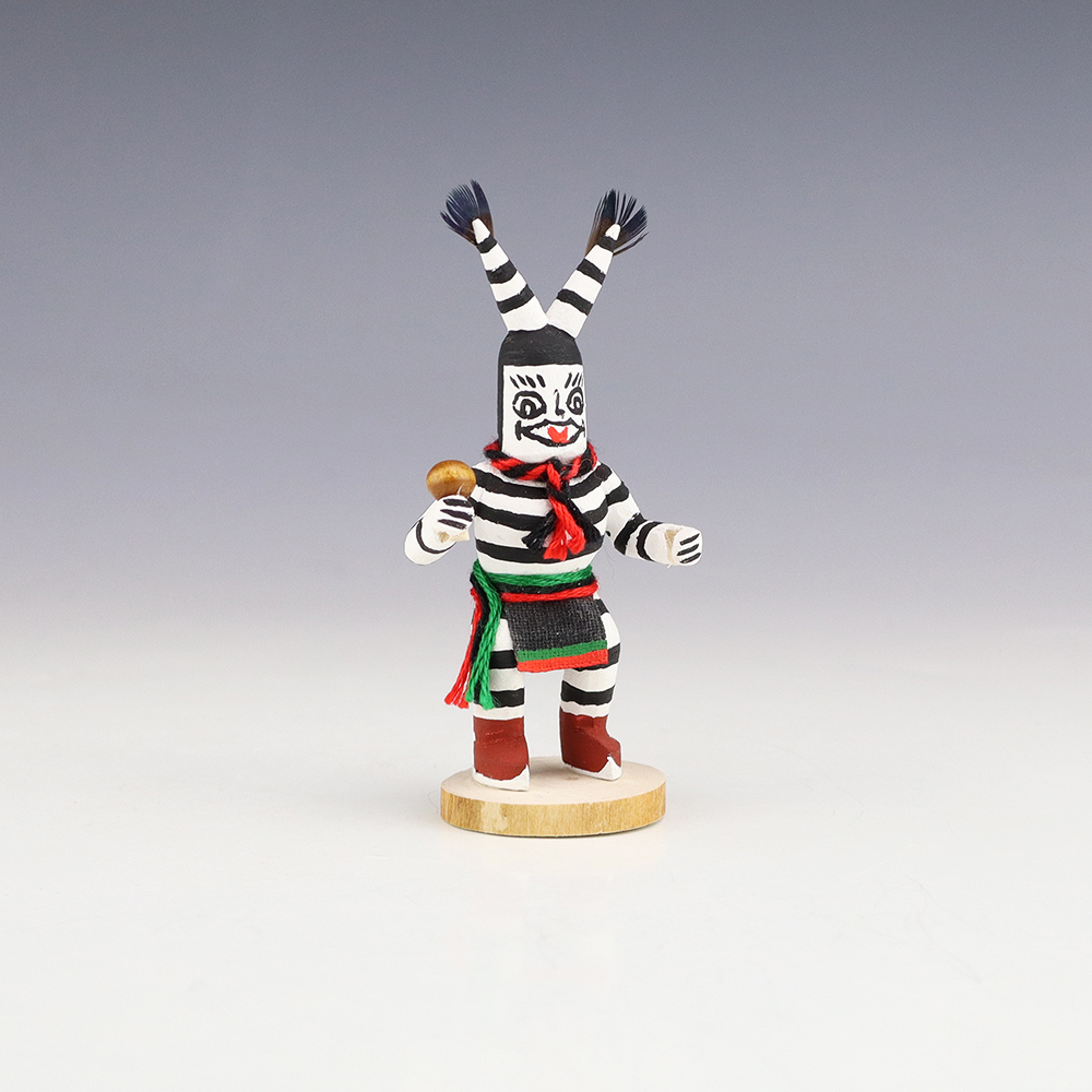 Hopi/Acoma artist Adrian Leon creates wonderful miniature kachinas, and this Clown Kachina is no exception. Delicately carved and painted, this marvelous carving would be a great addition to your kachina or Native American art collection. Signed