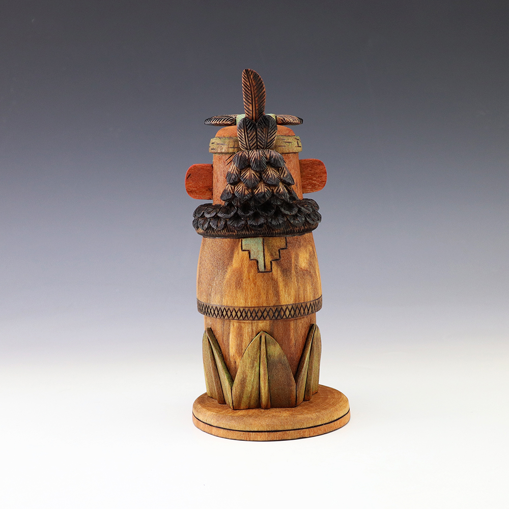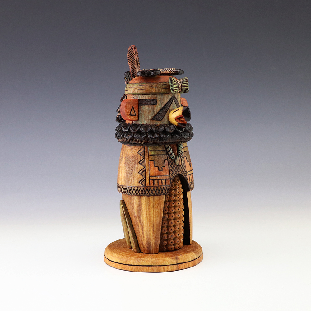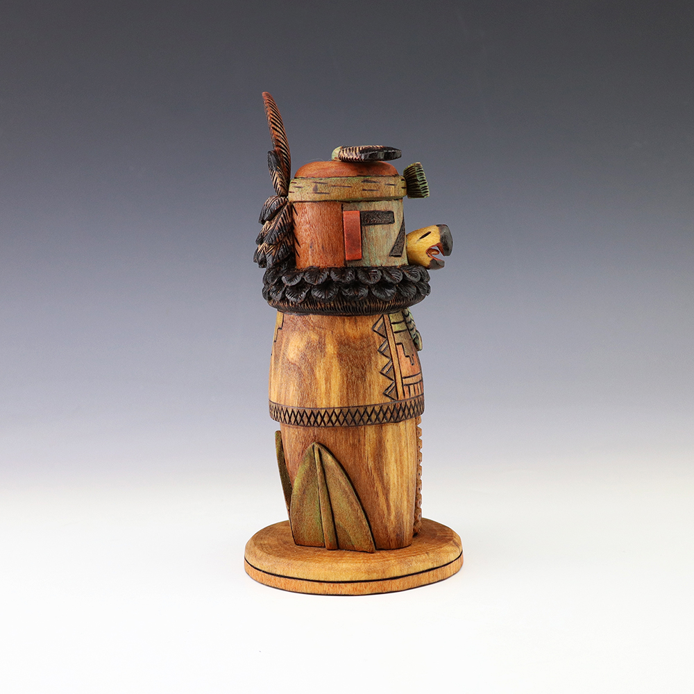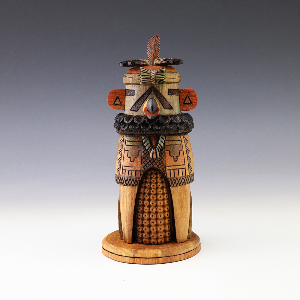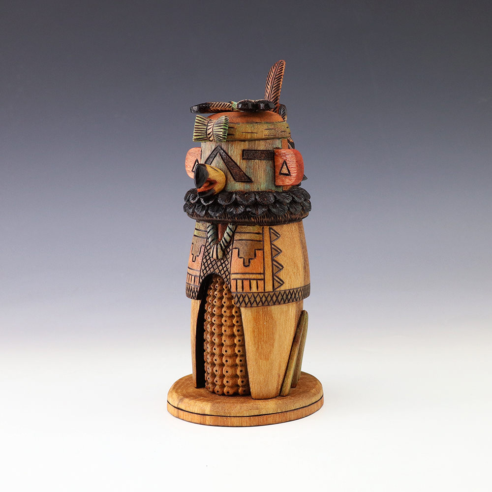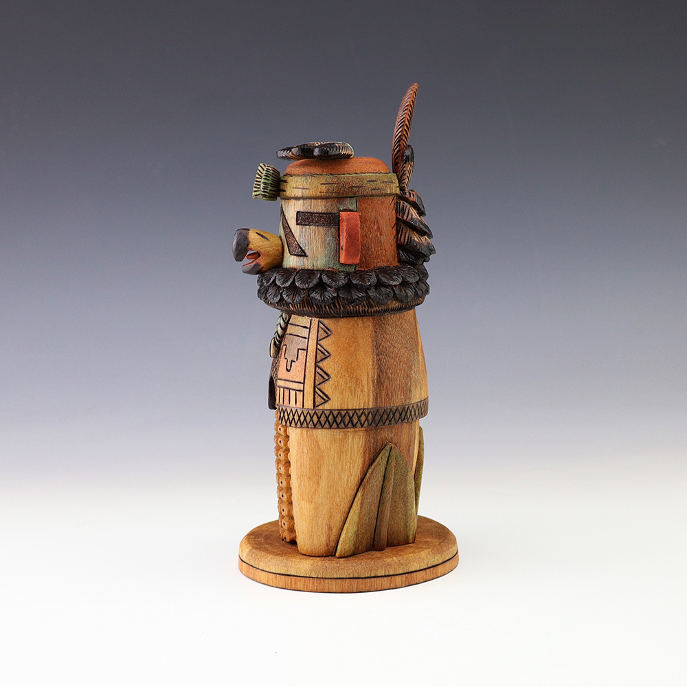 Hopi Kachina carver, Tyson Nequatewa has been creating kachinas for over 50 years. Over the years, he has won many awards for his work. Tyson expertly carves each kachina out of the root of a cottonwood tree with an amazing amount of detail and precision. Each kachina that Tyson carves, has a highly detailed corn body.