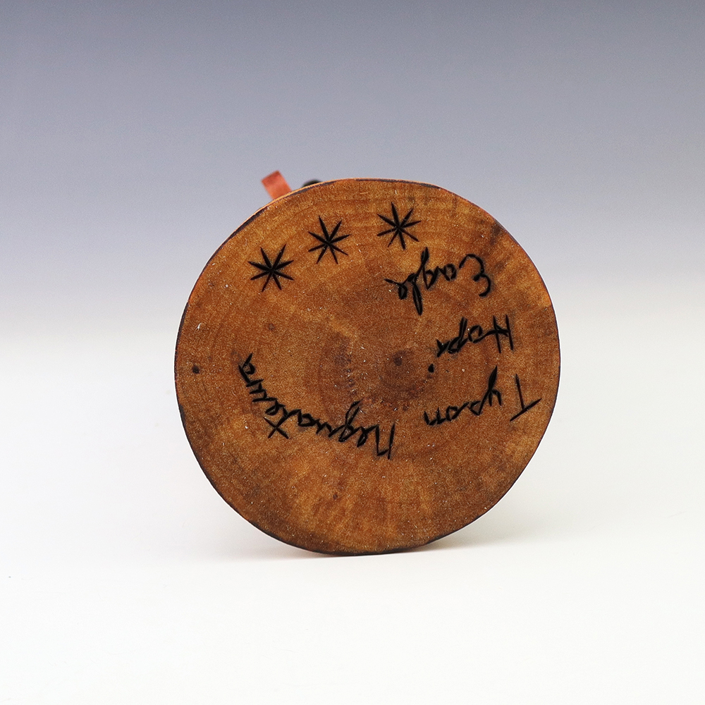 This White Bear Kachina is wonderfully carved out of cotton wood. Hand made by Navajo artist Alfred Benally. A great addition to your Native American art or kachina collection. Signed 7 1/8″ tall x 4 1/8″ long x 3 5/8” wide Artist card included The Bear Kachina appears in the...