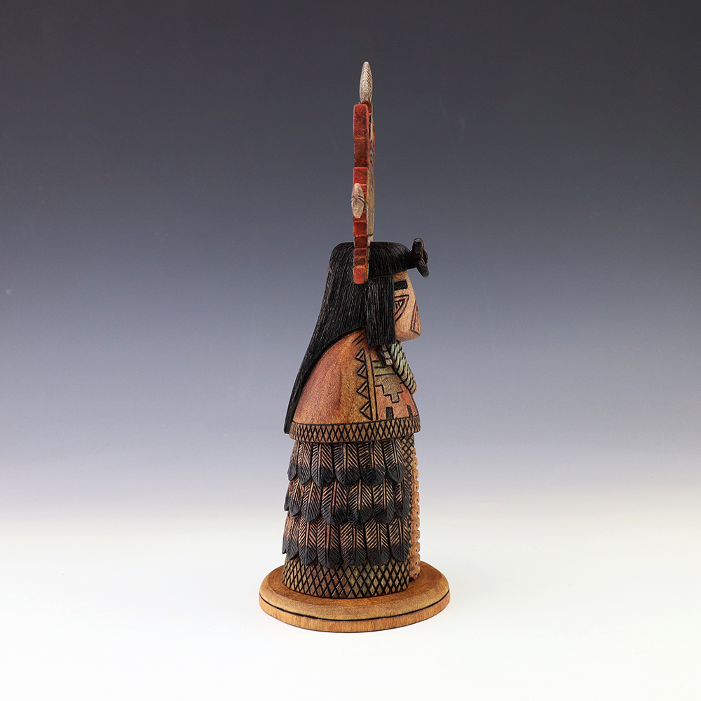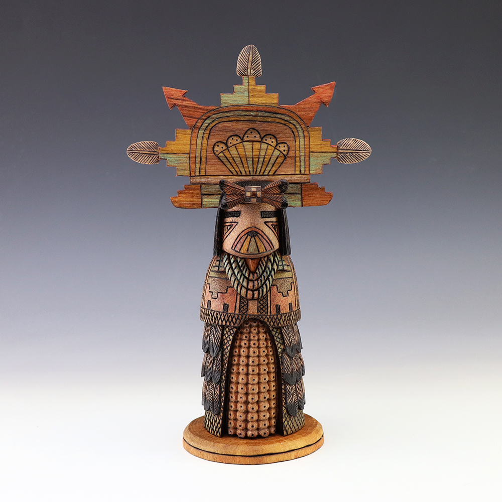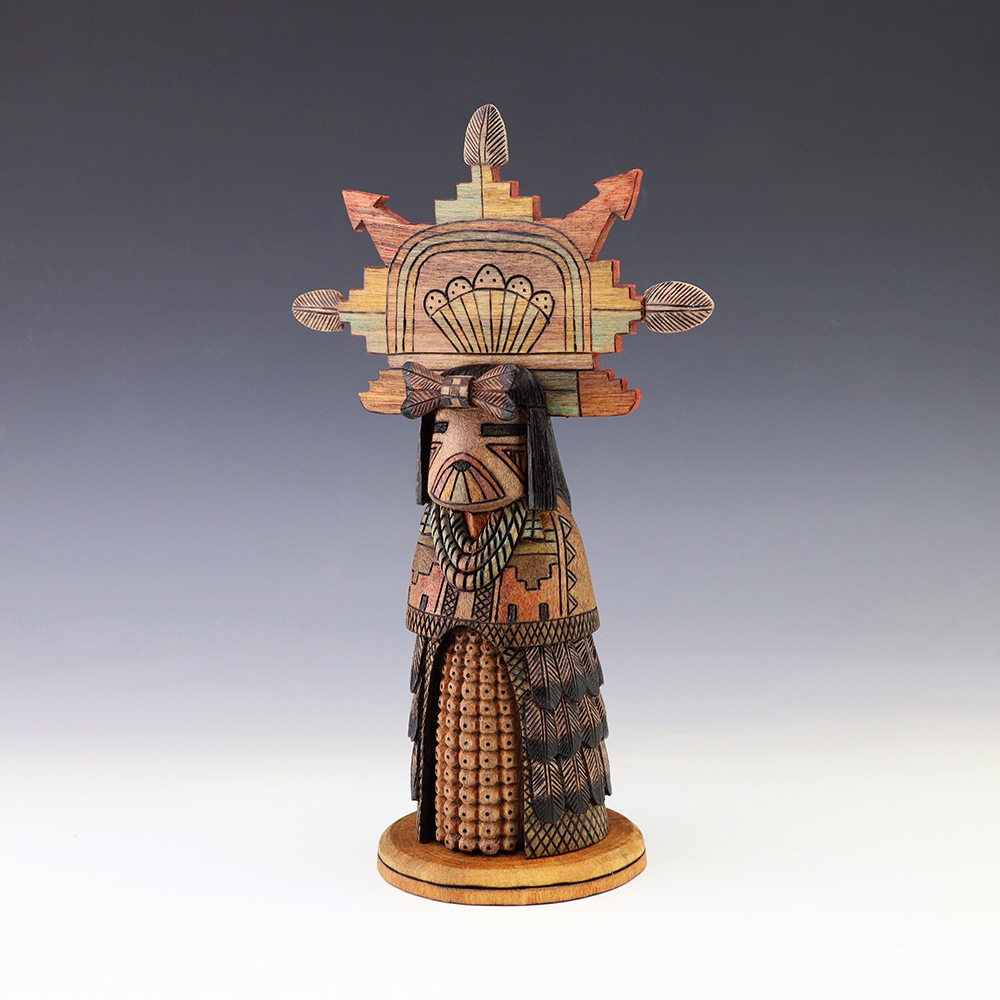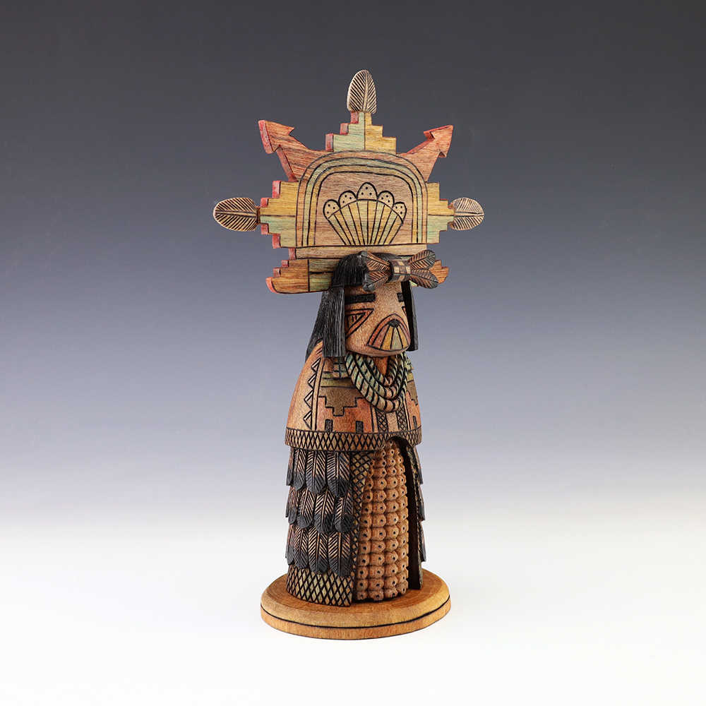 Hopi Kachina carver, Tyson Nequatewa has been creating kachinas for over 50 years. Over the years, he has won many awards for his work. Tyson expertly carves each kachina out of the root of a cottonwood tree with an amazing amount of detail and precision. Each kachina that Tyson carves, has a highly detailed corn body.