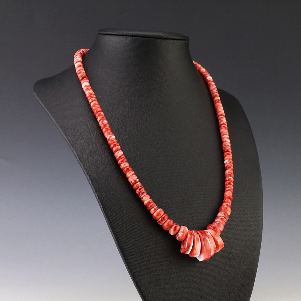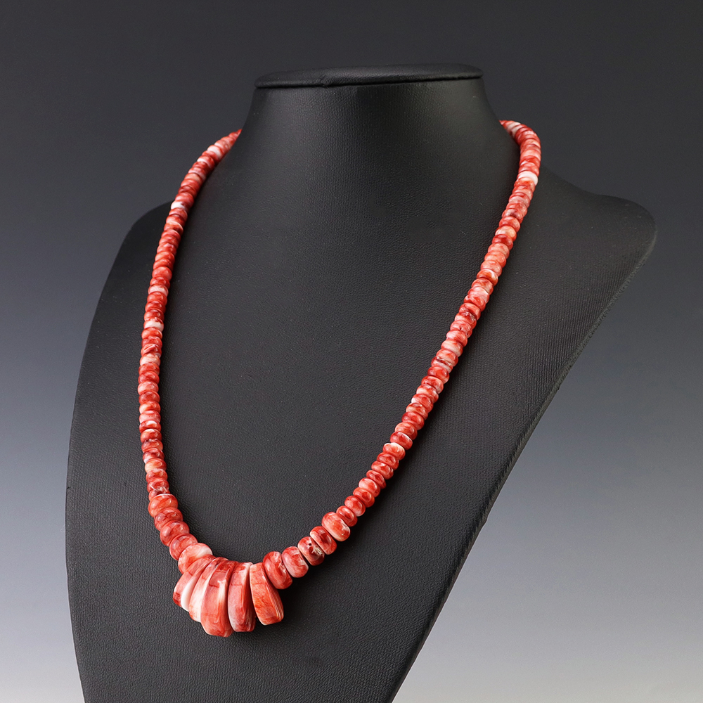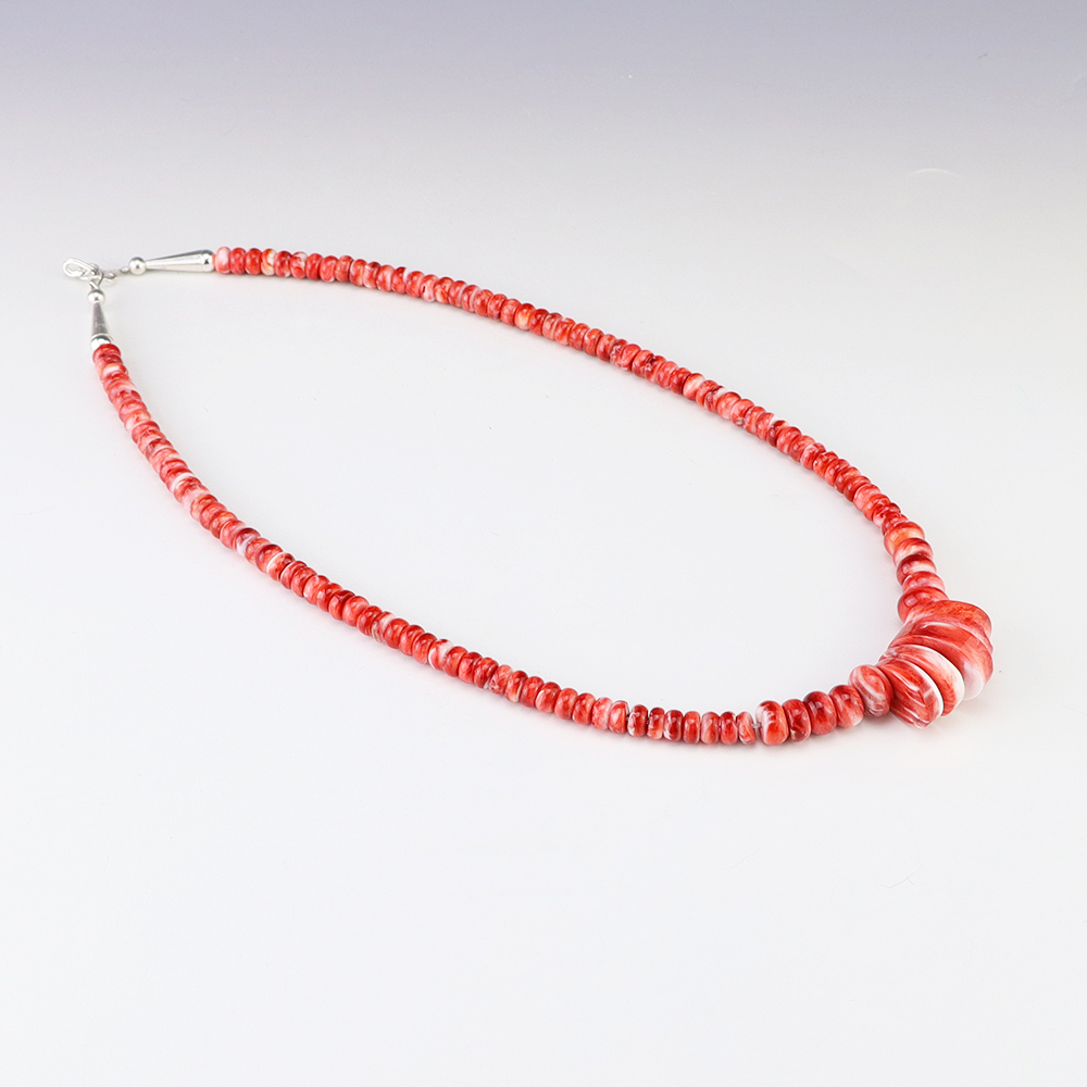 Kewa (Santo Domingo) artists are known for their heishi. The word “heishi“ means “shell” in the Keresan language. Traditionally Santo Domingo jewelry makers created their heishi jewelry out of shell. The shell is hand cut into a flat disc. Today, other stones that Santo Domingo artists cut in this manner, are also referred to as heishi. With modern tools and innovations, artists can create different styles of beads and use different gemstones like turquoise, coral, jet, serpentine, and spiny oyster.