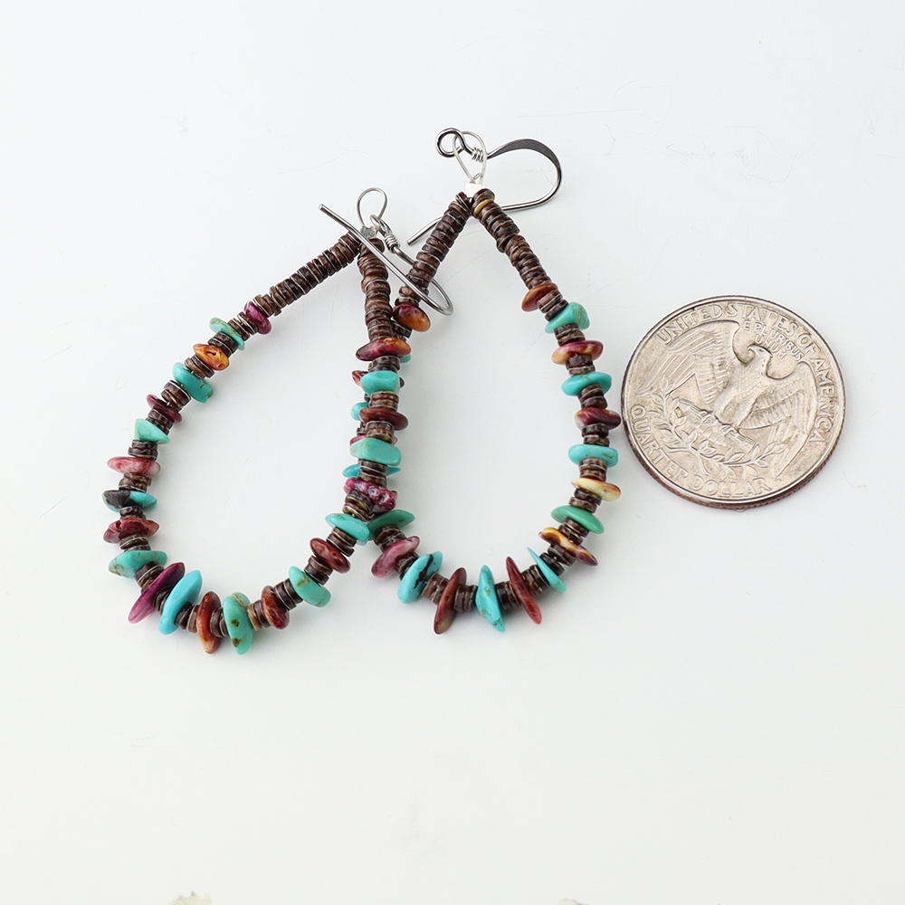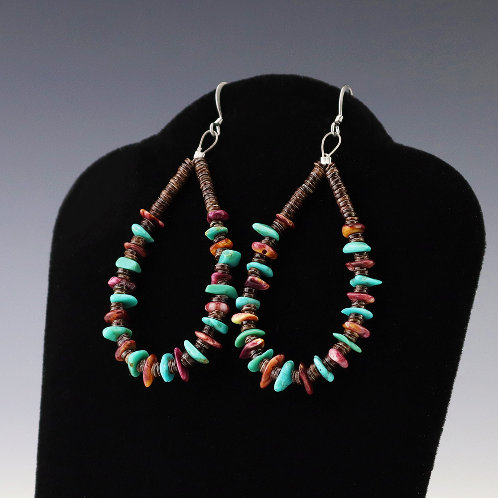 Kewa artist Jeanette Calabaza handcrafted these lovely earrings out of Turquoise, Spiny Oyster, and Olive Shell. These earrings will look fabulous with any outfit. Weighs 6 grams.
