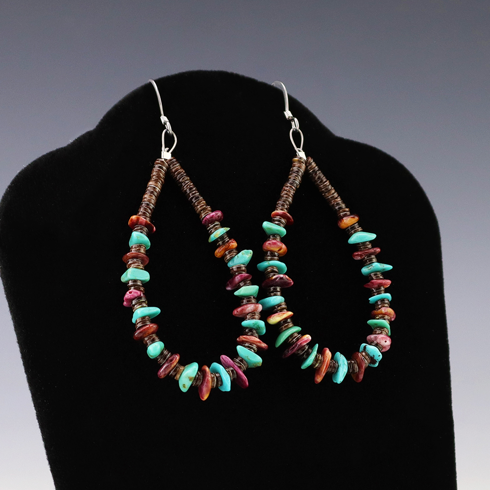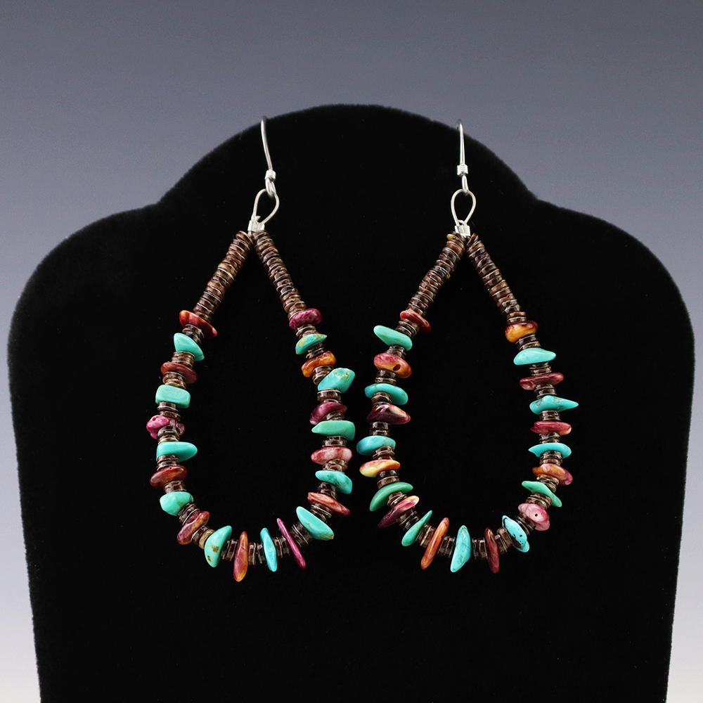 Kewa (Santo Domingo) artists are known for their heishi. The word “heishi“ means “shell” in the Keresan language. Traditionally Santo Domingo jewelry makers created their heishi jewelry out of shell. The shell is hand cut into a flat disc. Today, other stones that Santo Domingo artists cut in this manner, are also referred to as heishi. With modern tools and innovations, artists can create different styles of beads and use different gemstones like turquoise, coral, jet, serpentine, and spiny oyster.