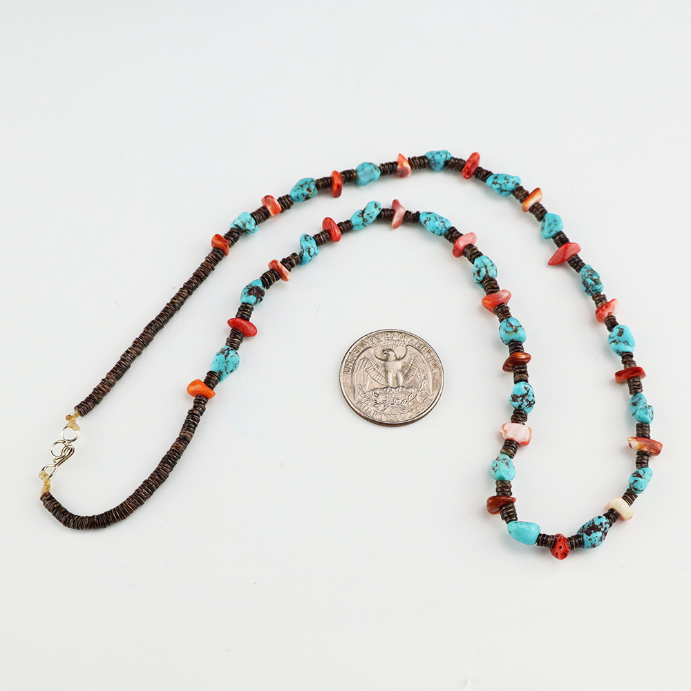 This necklace, hand made by Kewa artist Jeanette Calabaza, is a lovely statement piece. The necklace showcases fine Olive Shell, Turquoise, and Spiny Oyster. The strand of heishi is finished off with a hook and eye. Weighs 14 grams.