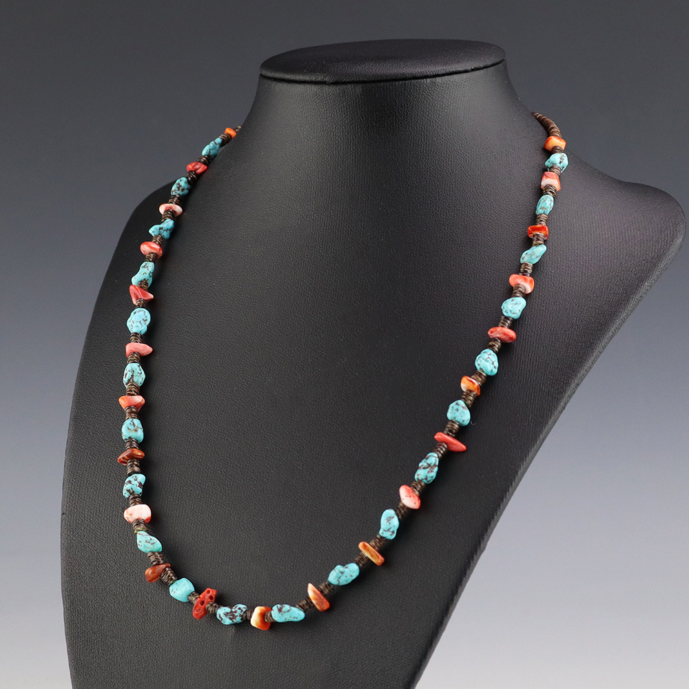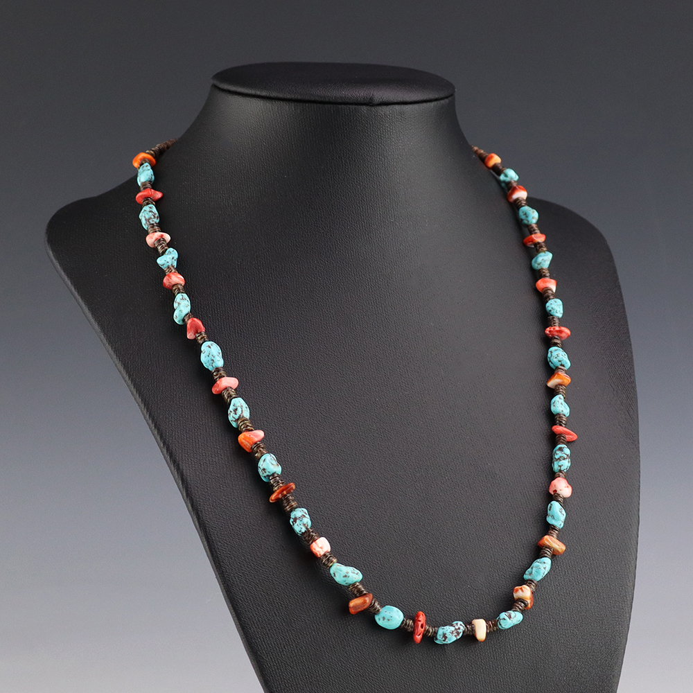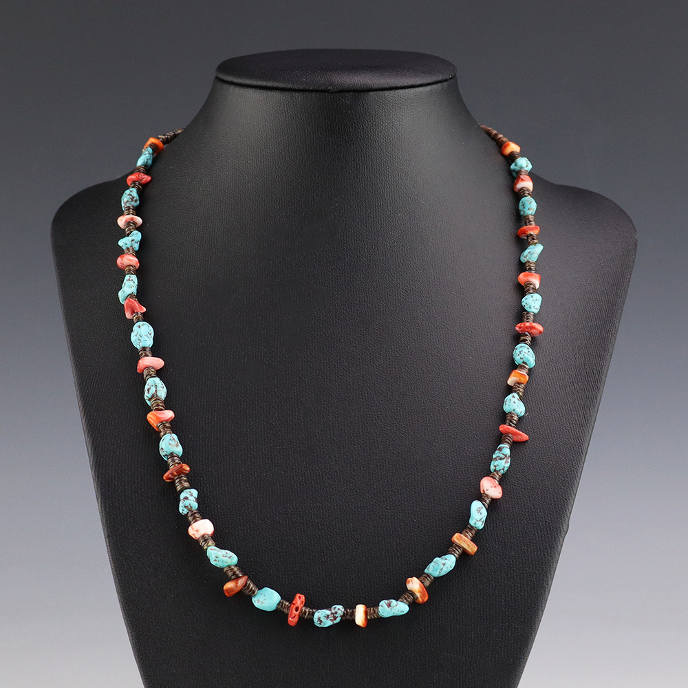 Kewa (Santo Domingo) artists are known for their heishi. The word “heishi“ means “shell” in the Keresan language. Traditionally Kewa jewelry makers created their heishi jewelry out of shell. The shell is hand cut into a flat disc. Today, other stones that Santo Domingo artists cut in this manner, are also referred to as heishi. With modern tools and innovations, artists can create different styles of beads and use different gemstones like turquoise, coral, jet, serpentine, and spiny oyster.