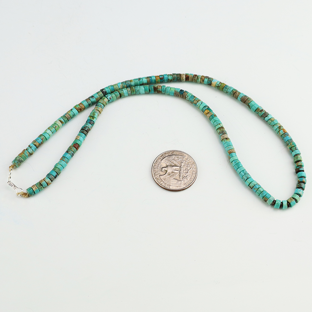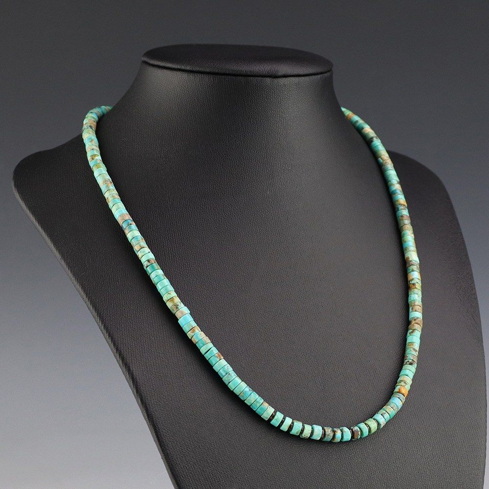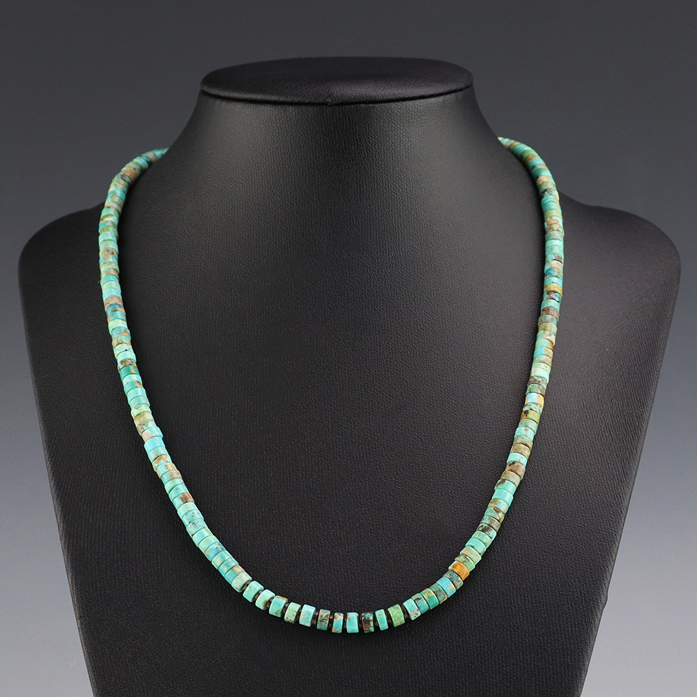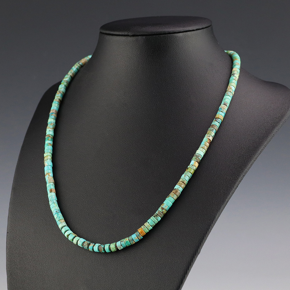Kewa (Santo Domingo) artists are known for their heishi. The word “heishi“ means “shell” in the Keresan language. Traditionally Kewa jewelry makers created their heishi jewelry out of shell. The shell is hand cut into a flat disc. Today, other stones that Santo Domingo artists cut in this manner, are also referred to as heishi. With modern tools and innovations, artists can create different styles of beads and use different gemstones like turquoise, coral, jet, serpentine, and spiny oyster.