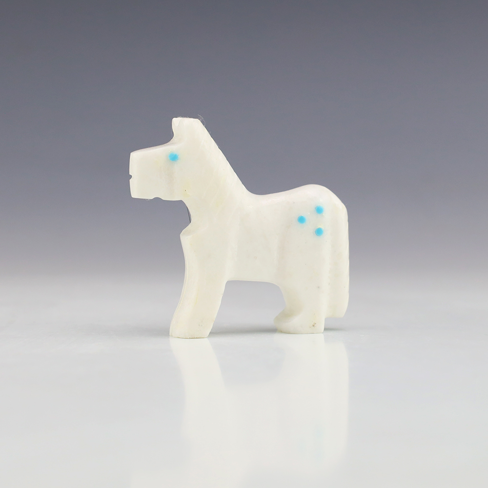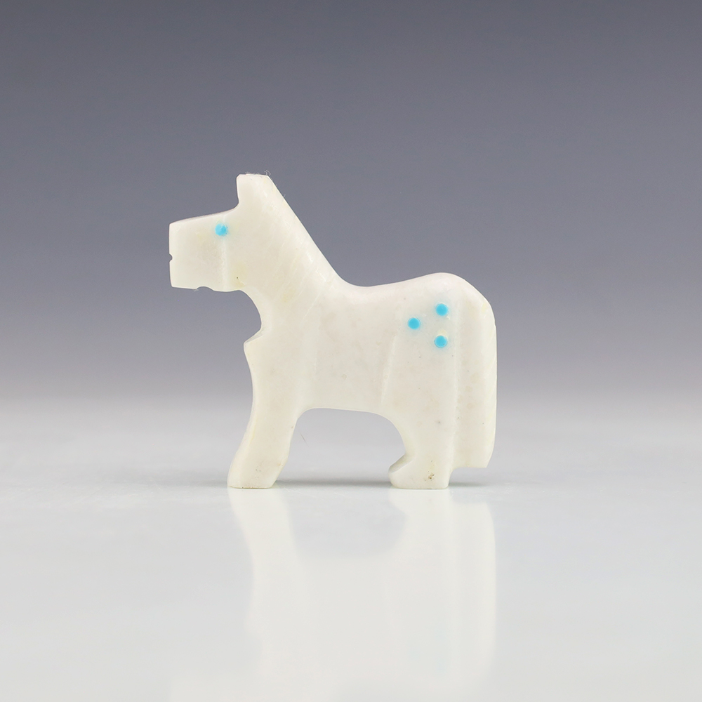 The Horse represents strength, swiftness, and possesses healing powers. Zuni fetish carver, Todd Etsate made this wonderful horse fetish out of Marble and it has Turquoise eyes and spots.