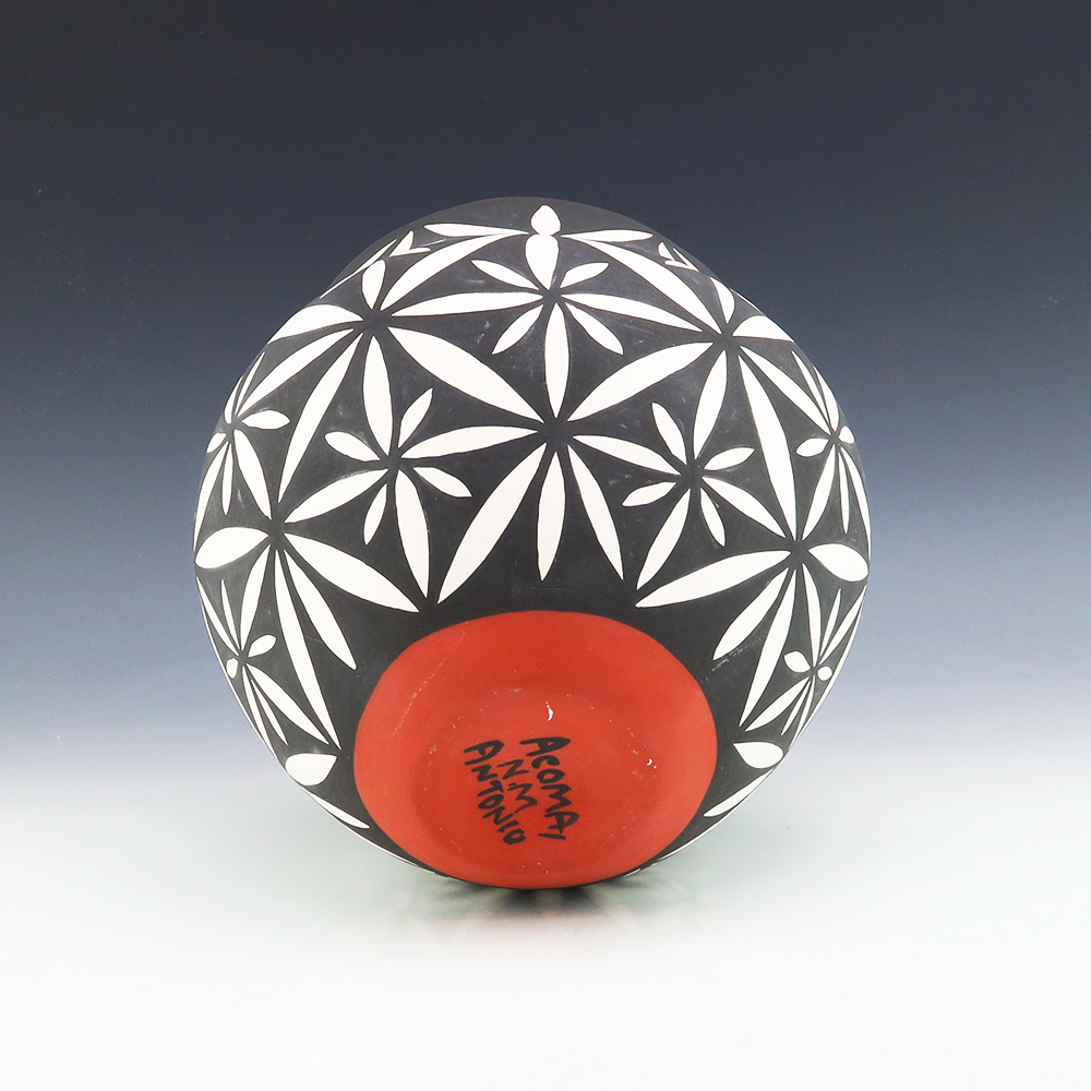 This eye dazzler was hand made by Acoma potter Paula Estevan. Paula was born in Acoma Pueblo in 1967. She learned the art of making pottery in the traditional way from her mother, Patricia Estevan, and from Mary Chino and Victoria Garcia. She’s been producing pottery since 1986. Paula’s hand...