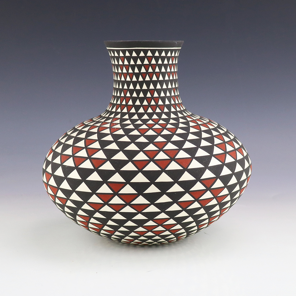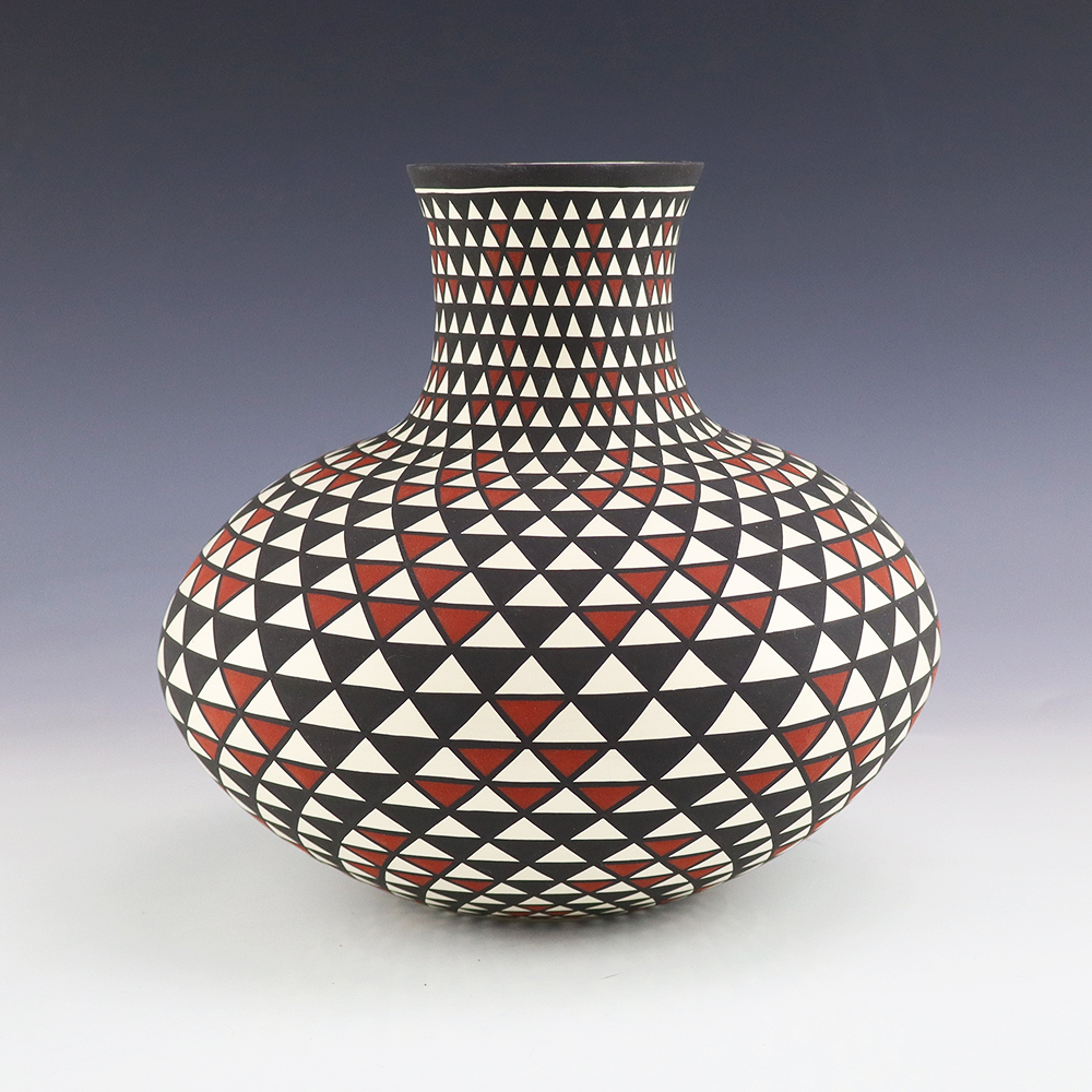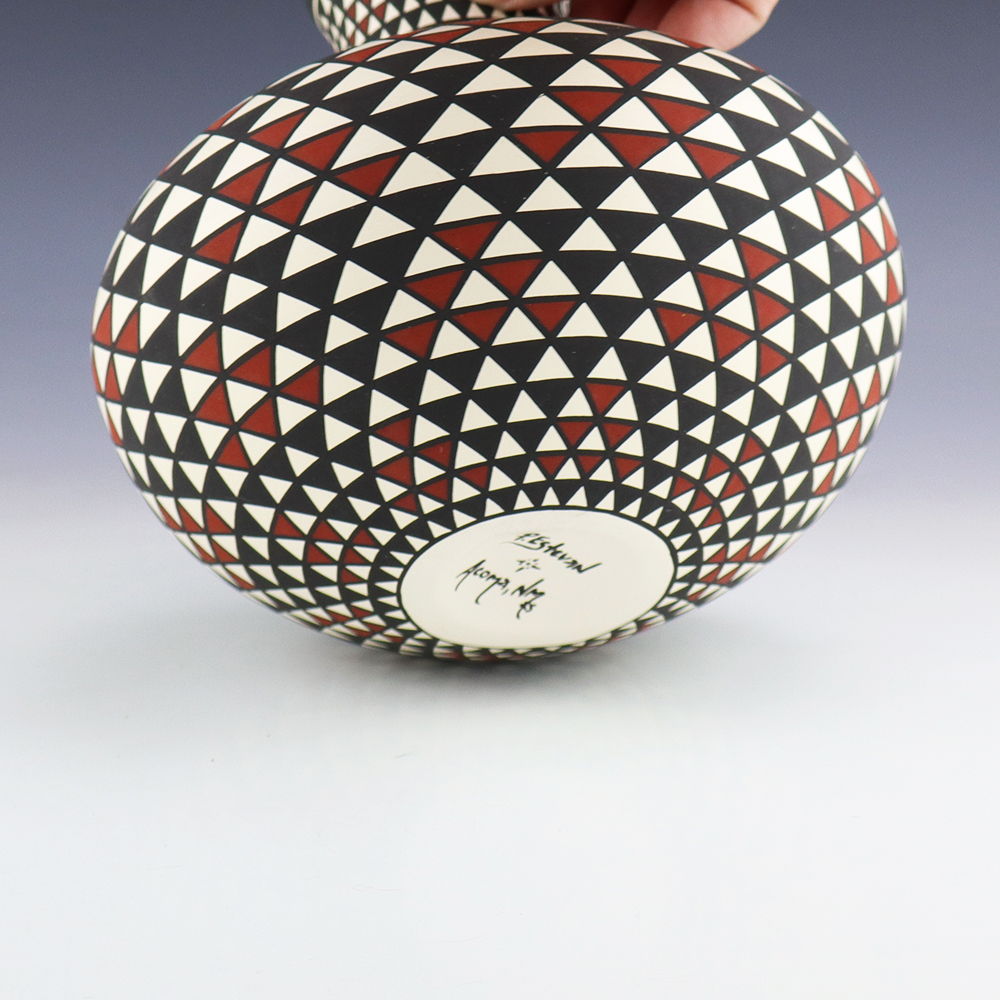 This eye dazzler was hand made by Acoma potter Paula Estevan. Paula was born in Acoma Pueblo in 1967. She learned the art of making pottery in the traditional way from her mother, Patricia Estevan, and from Mary Chino and Victoria Garcia. She’s been producing pottery since 1986. Paula’s hand coiled pots are exceptional examples of Acoma pottery with perfect shape and fine, thin walls. Her design process involves selecting a single Acoma design element and repeating it in an extremely fine progressive pattern across the entire surface of the pot. A unique addition to any pottery or Native American art collection. Signed