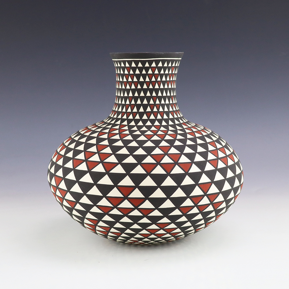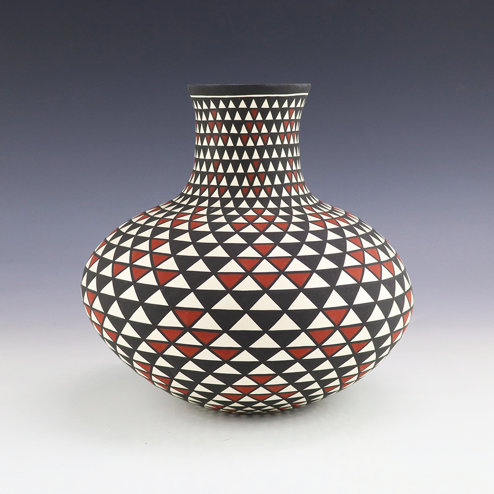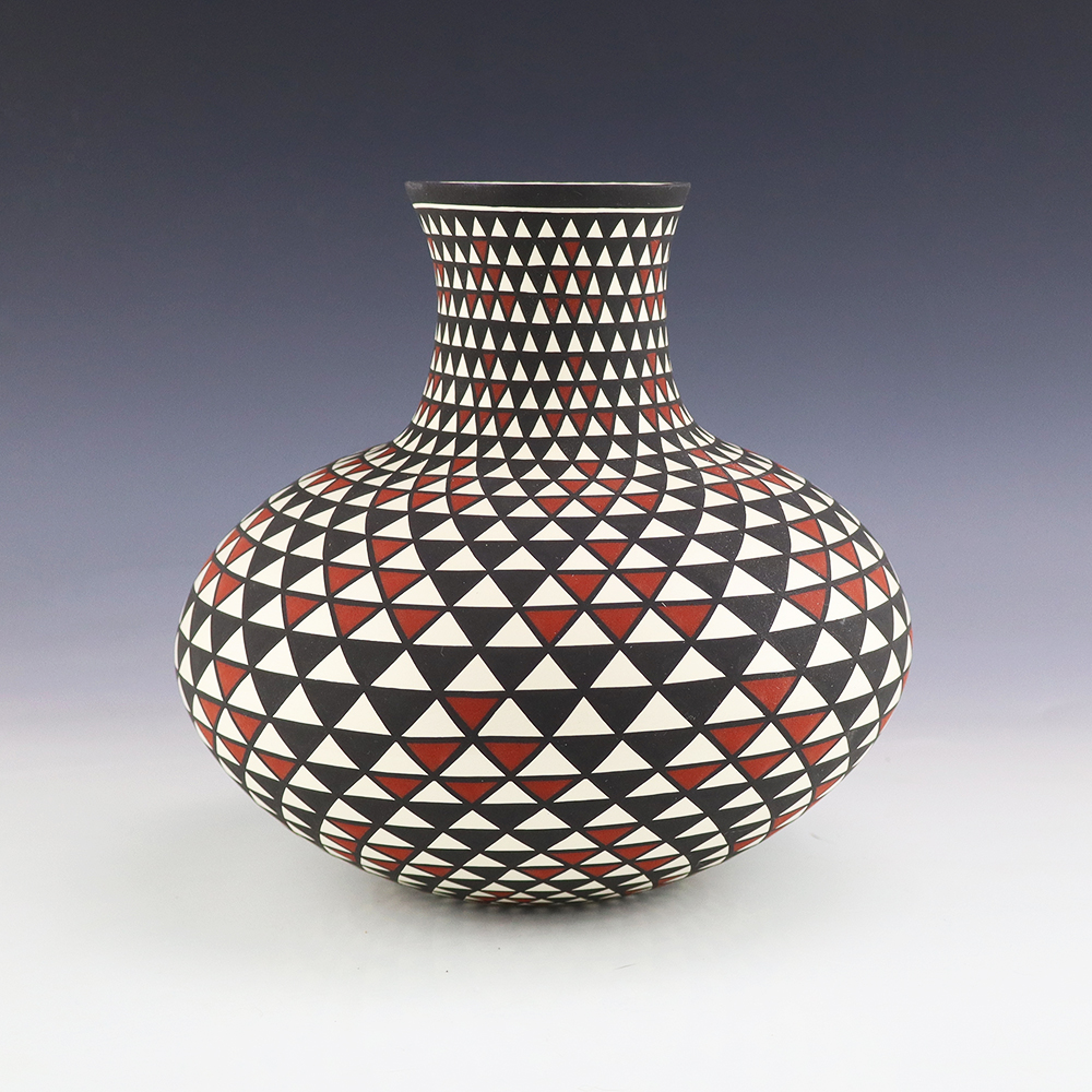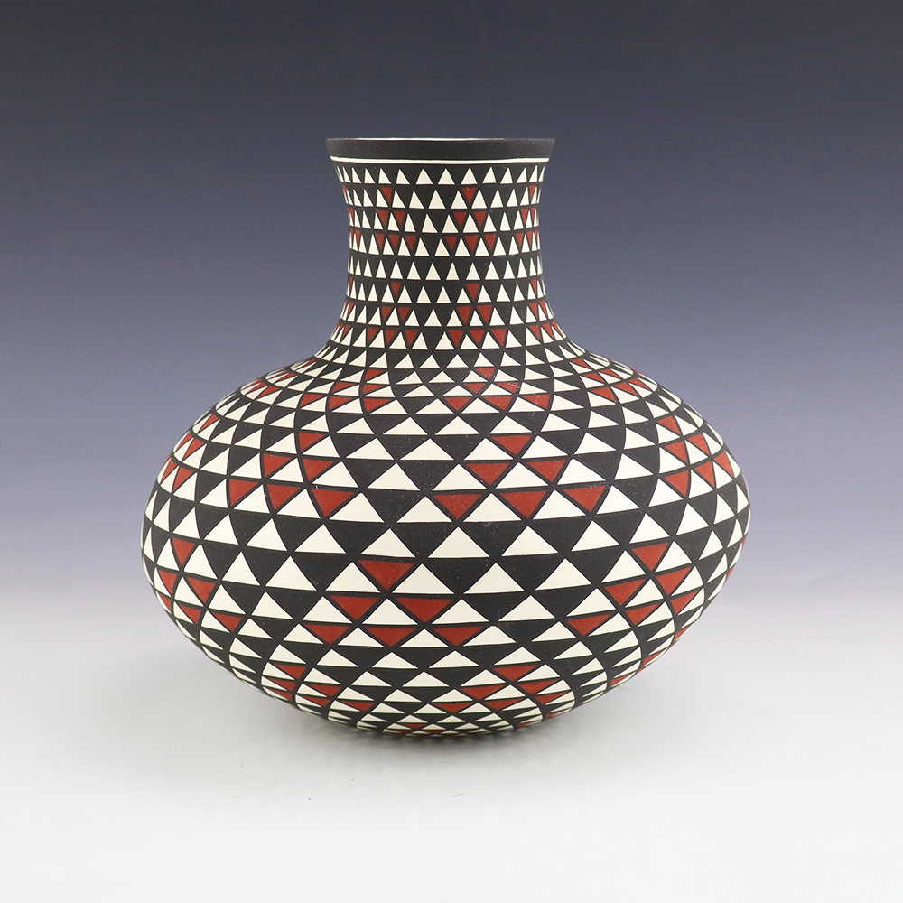 This eye dazzler was hand made by Acoma potter Paula Estevan. Paula was born in Acoma Pueblo in 1967. She learned the art of making pottery in the traditional way from her mother, Patricia Estevan, and from Mary Chino and Victoria Garcia. She’s been producing pottery since 1986. Paula’s hand coiled pots are exceptional examples of Acoma pottery with perfect shape and fine, thin walls. Her design process involves selecting a single Acoma design element and repeating it in an extremely fine progressive pattern across the entire surface of the pot. A unique addition to any pottery or Native American art collection. Signed