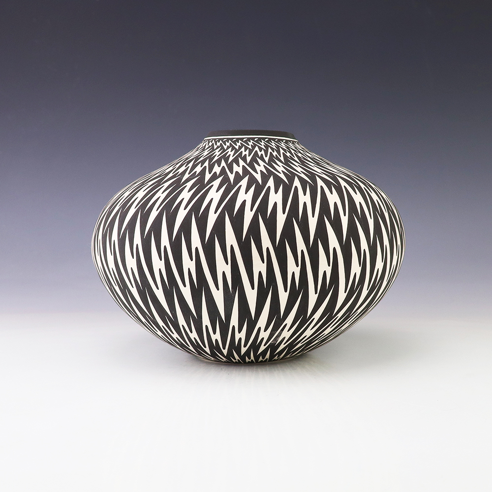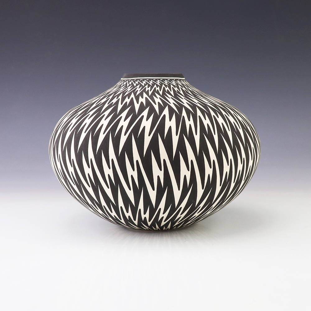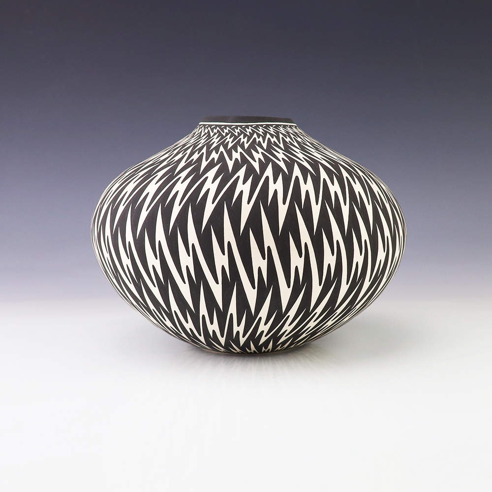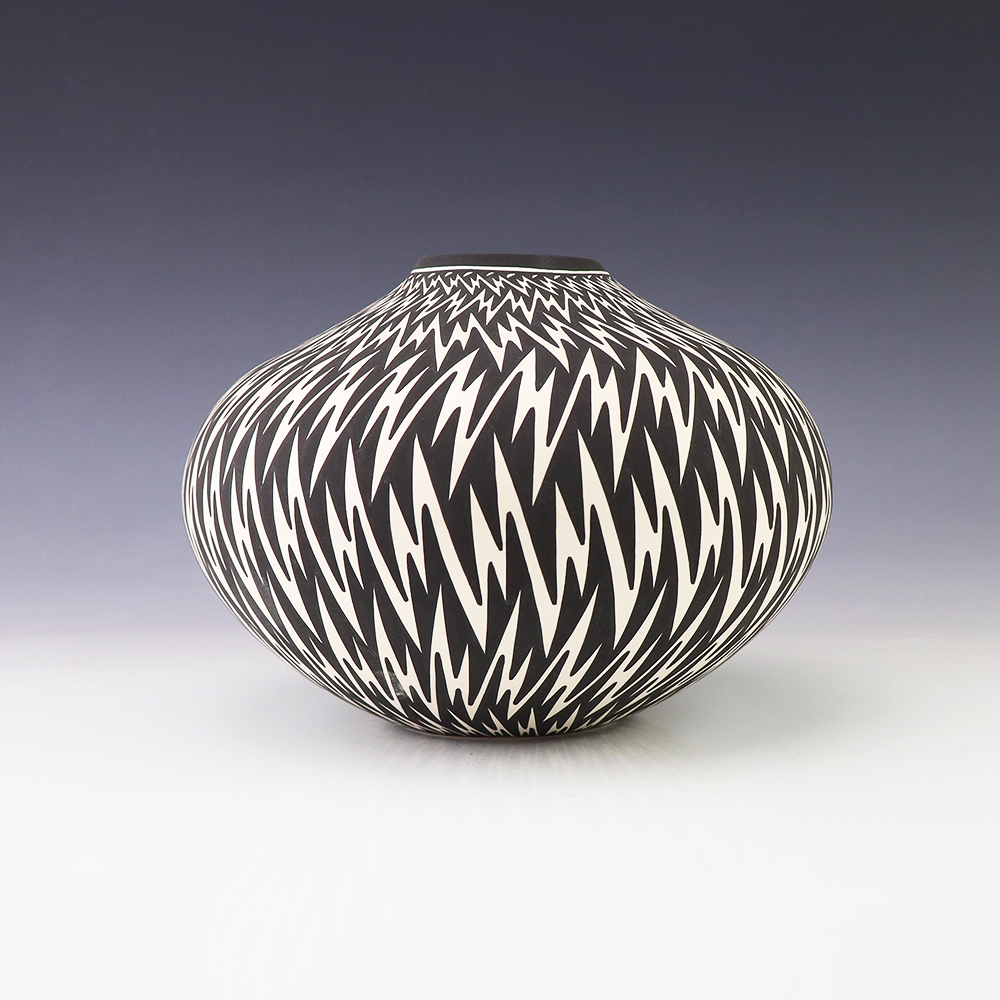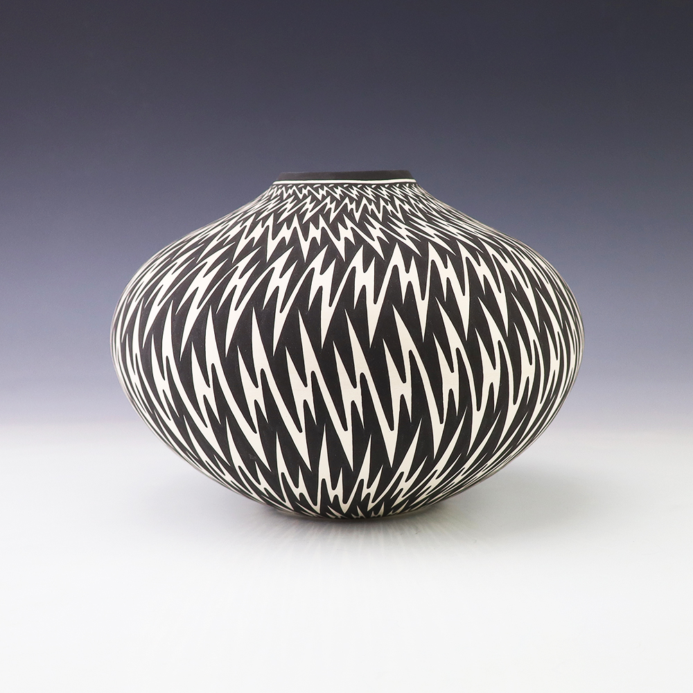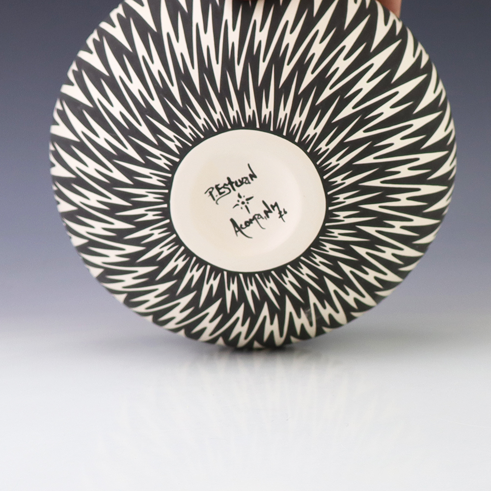 This eye dazzler was hand made by Acoma potter Paula Estevan. Paula was born in Acoma Pueblo in 1967. She learned the art of making pottery in the traditional way from her mother, Patricia Estevan, and from Mary Chino and Victoria Garcia. She’s been producing pottery since 1986. Paula’s hand coiled pots are exceptional examples of Acoma pottery with perfect shape and fine, thin walls. Her design process involves selecting a single Acoma design element and repeating it in an extremely fine progressive pattern across the entire surface of the pot. A unique addition to any pottery or Native American art collection. Signed