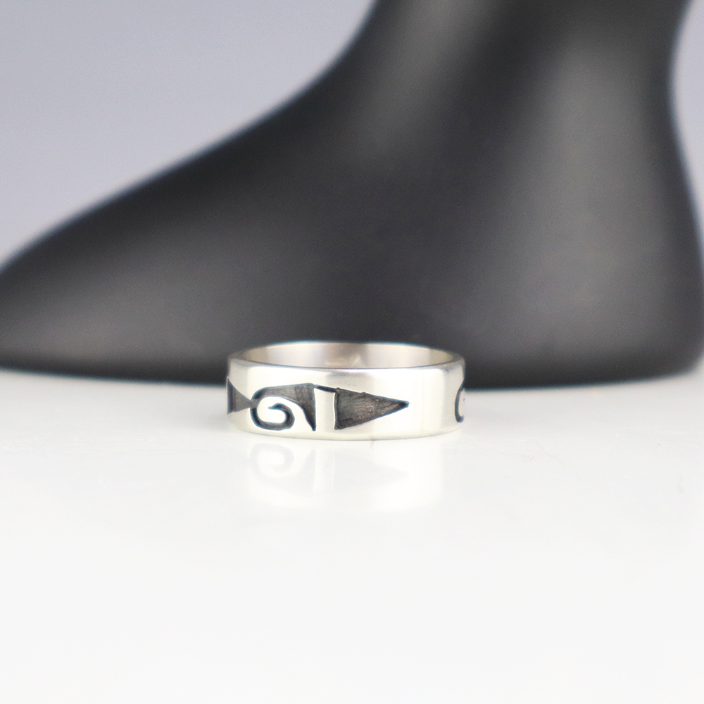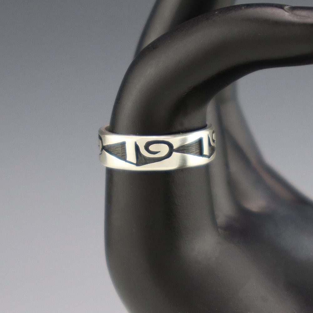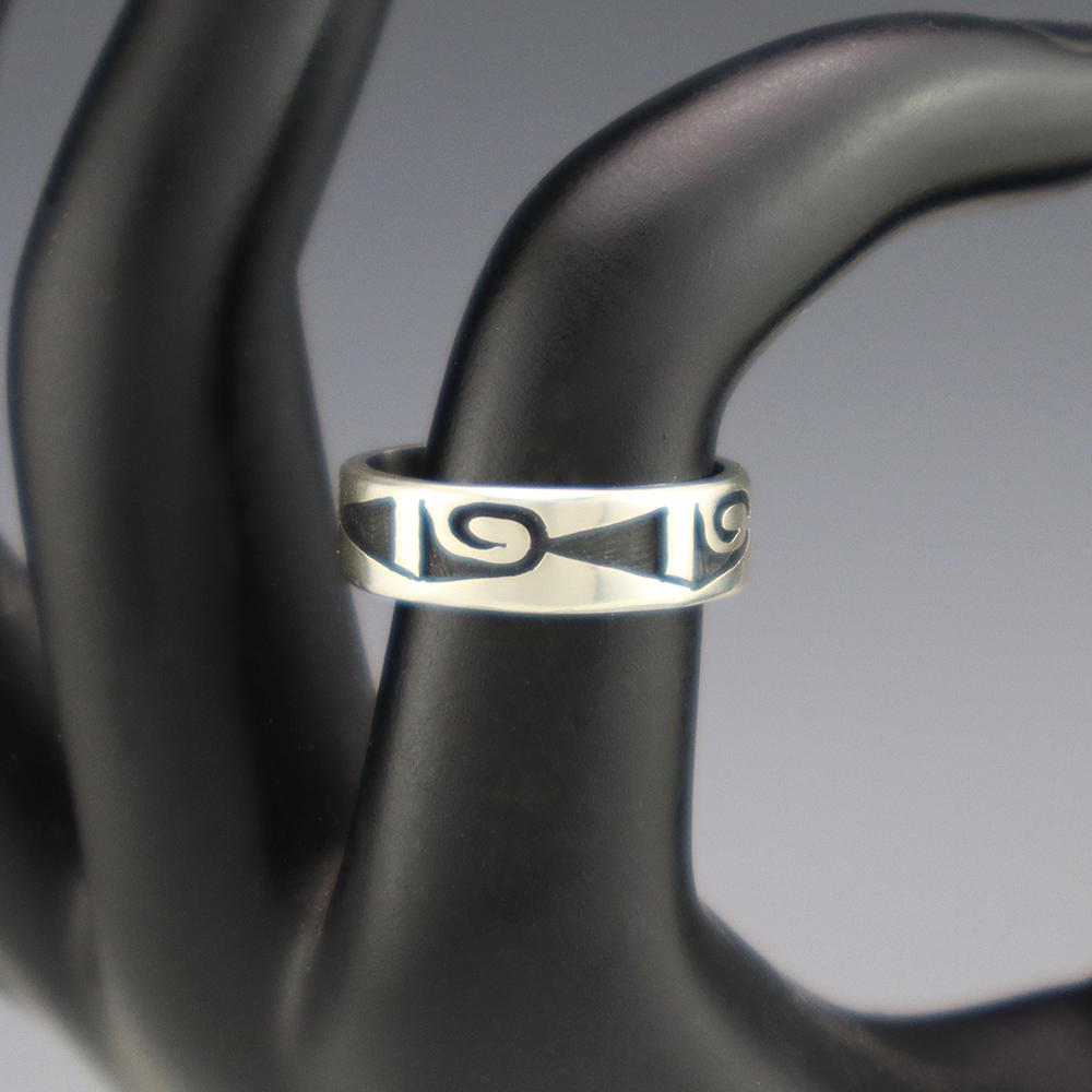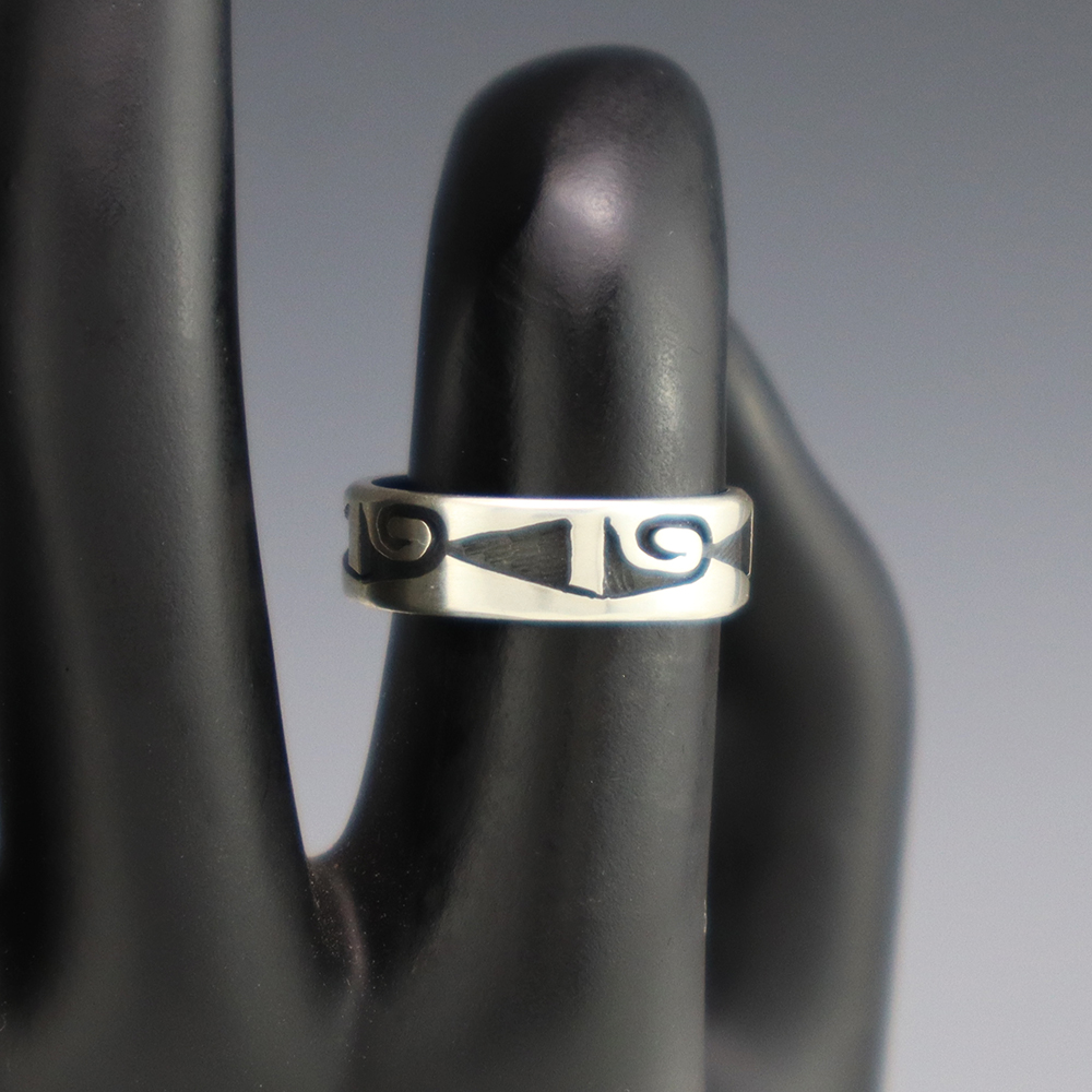 Hopi artist Darren Seweyestewa created this wonderful ring through the overlay technique. Hopi overlay is constructed from two layers of sterling silver. A design is cut out with a jeweler’s saw by hand. This top design layer is then silver soldered to another sheet, the bottom layer, of silver. Texturing is added to the bottom layer in all the open areas of the design using a hammer and a small punch. The piece is then formed to its final shape and size. The bottom layer is then oxidized to enhance the design. A unique addition of high-quality craftsmanship to your jewelry wardrobe. Weighs 4 grams. Size 7. Signed