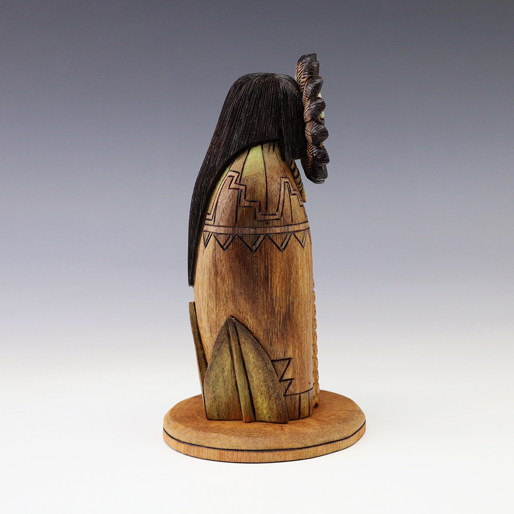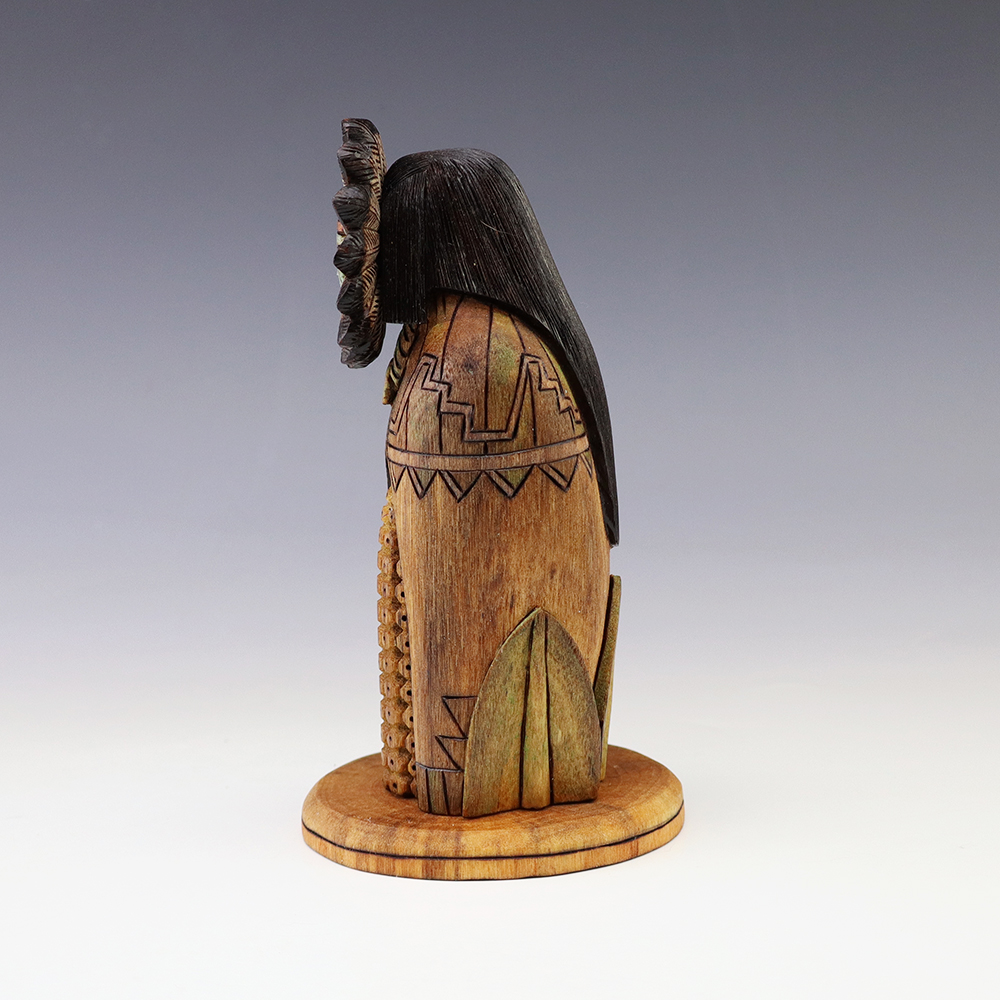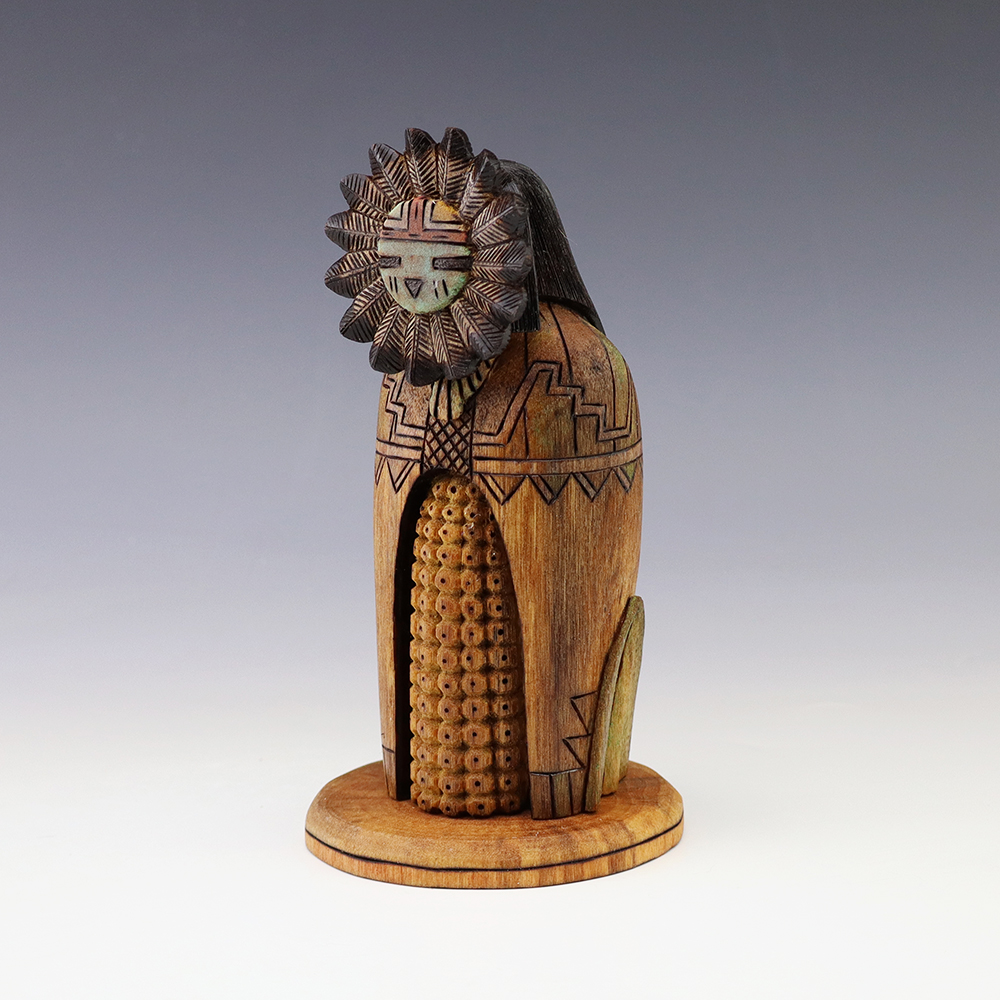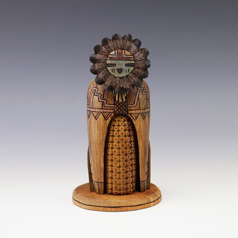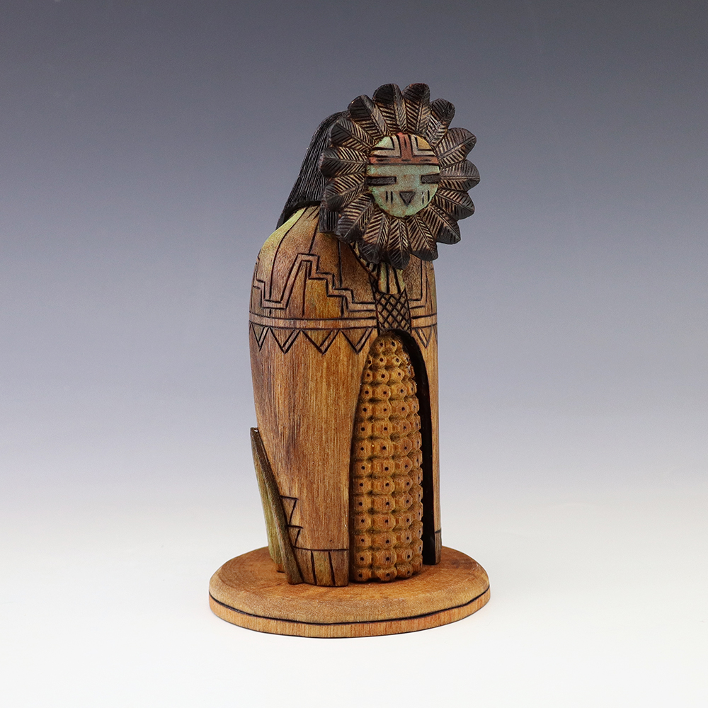 Hopi Kachina carver, Tyson Nequatewa has been creating kachinas for over 50 years. Over the years, he has won many awards for his work. Tyson expertly carves each kachina out of the root of a cottonwood tree with an amazing amount of detail and precision. Each kachina that Tyson carves, has a highly detailed corn body.