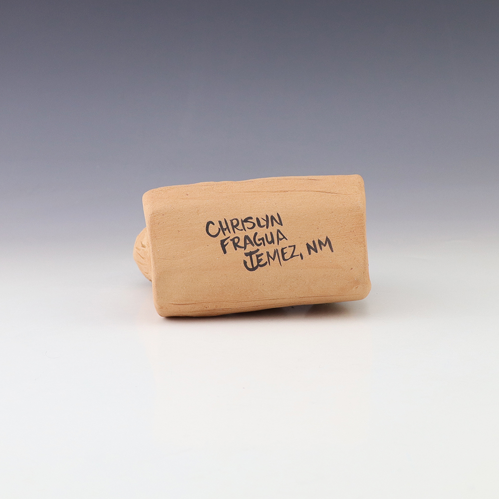 This wonderfully painted storyteller was handmade by Jemez Pueblo potter Chrislyn Fragua and depicts a woman with three children. Chrislyn uses both the coil method and pinch method to create her pottery piece and as in traditional storytellers, Chrislyn’s storytellers have their mouths open. Storytellers represent the passing down of...