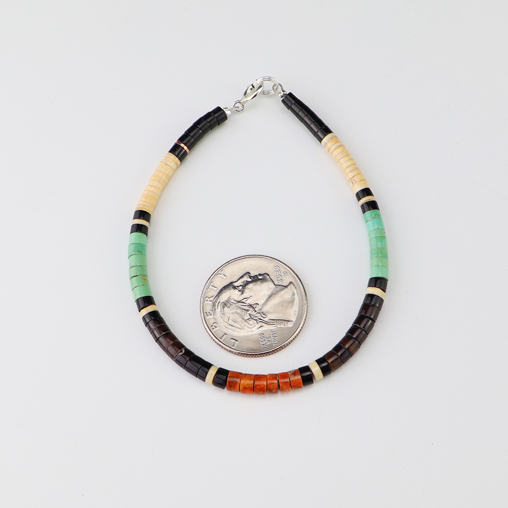 A fabulous combination of mother of pearl shell, jet, coral and turquoise stones inlaid into a sterling silver setting. Hand made by Zuni jeweler Glendis Tsadiasi This attractive bracelet would make a great addition to your Native American jewelry collection. Weighs 10 grams. Signed. The entire inner circumference is about...