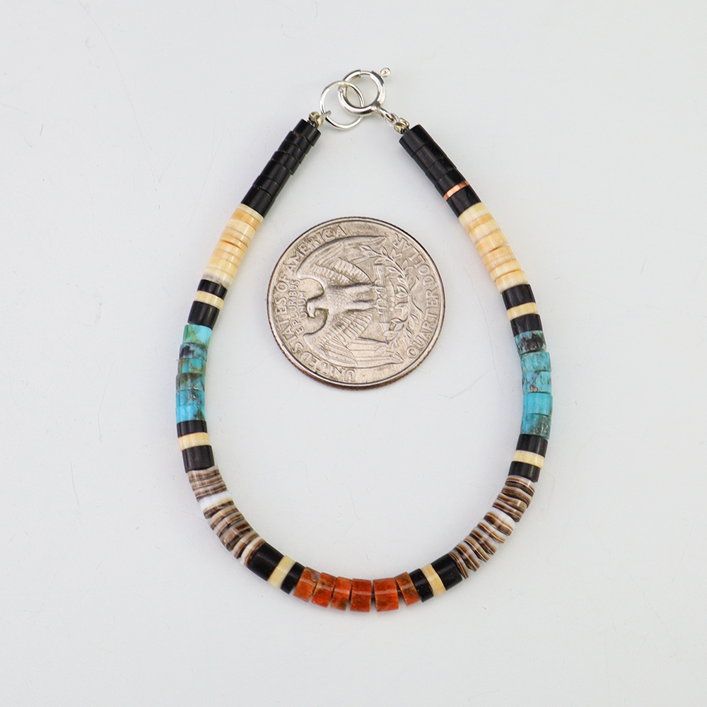A fabulous combination of mother of pearl shell, jet, coral and turquoise stones inlaid into a sterling silver setting. Hand made by Zuni jeweler Glendis Tsadiasi This attractive bracelet would make a great addition to your Native American jewelry collection. Weighs 10 grams. Signed. The entire inner circumference is about...