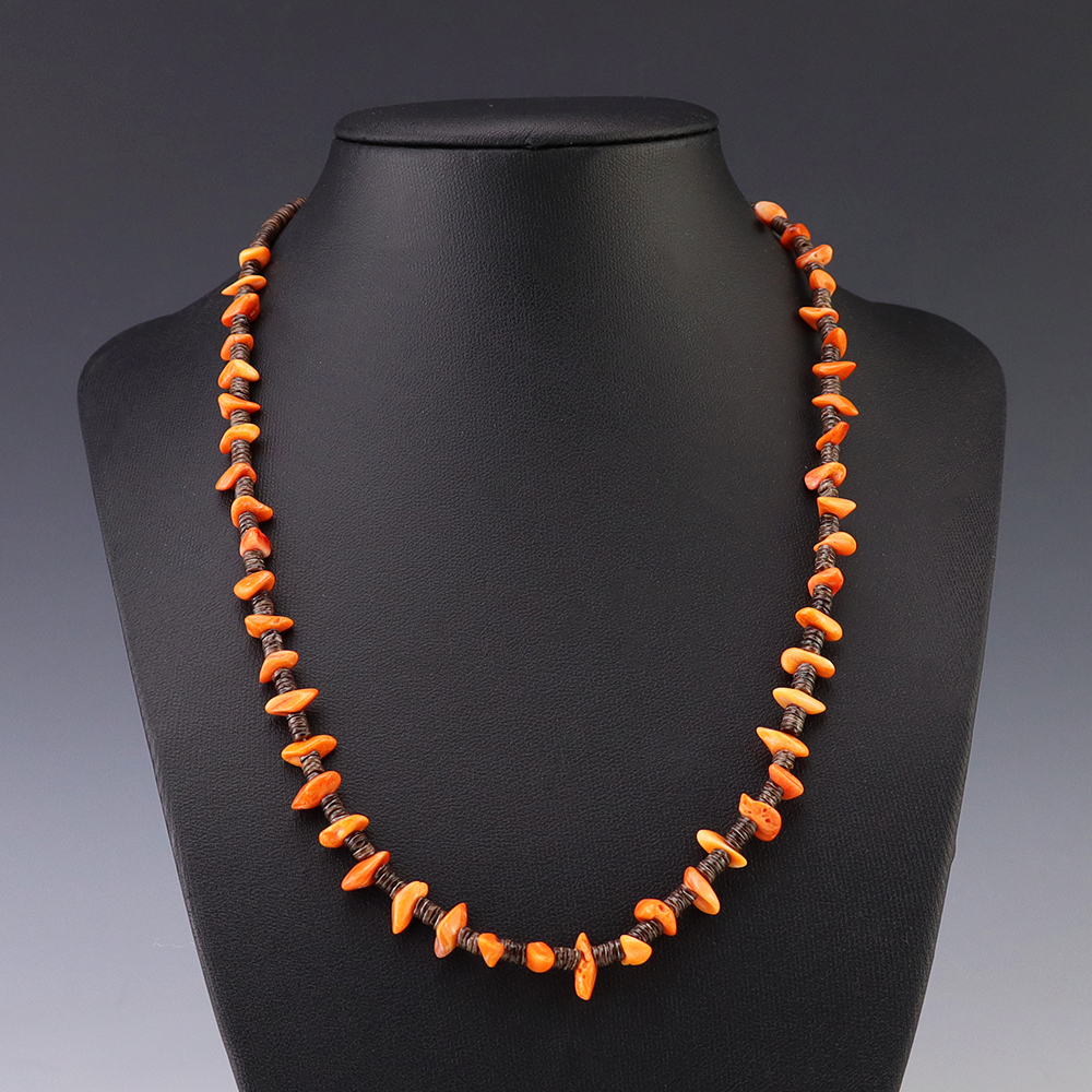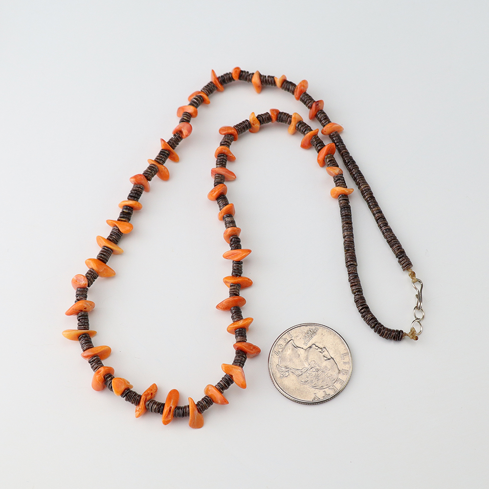 This necklace, hand made by Kewa artist Jeanette Calabaza, is a lovely statement piece. The necklace showcases fine Olive Shell and Spiny Oyster. The strand of heishi is finished off with a hook and eye. Weighs 14 grams.