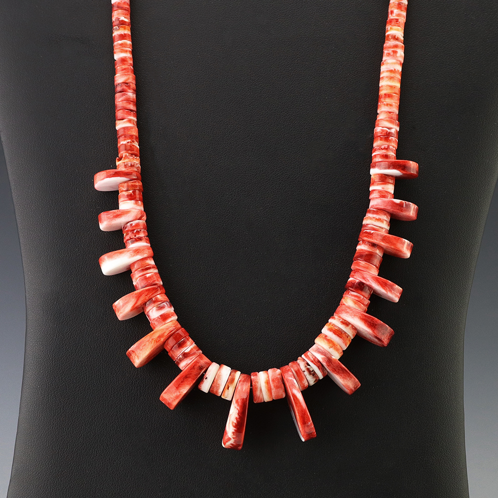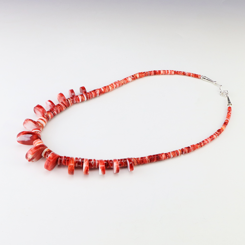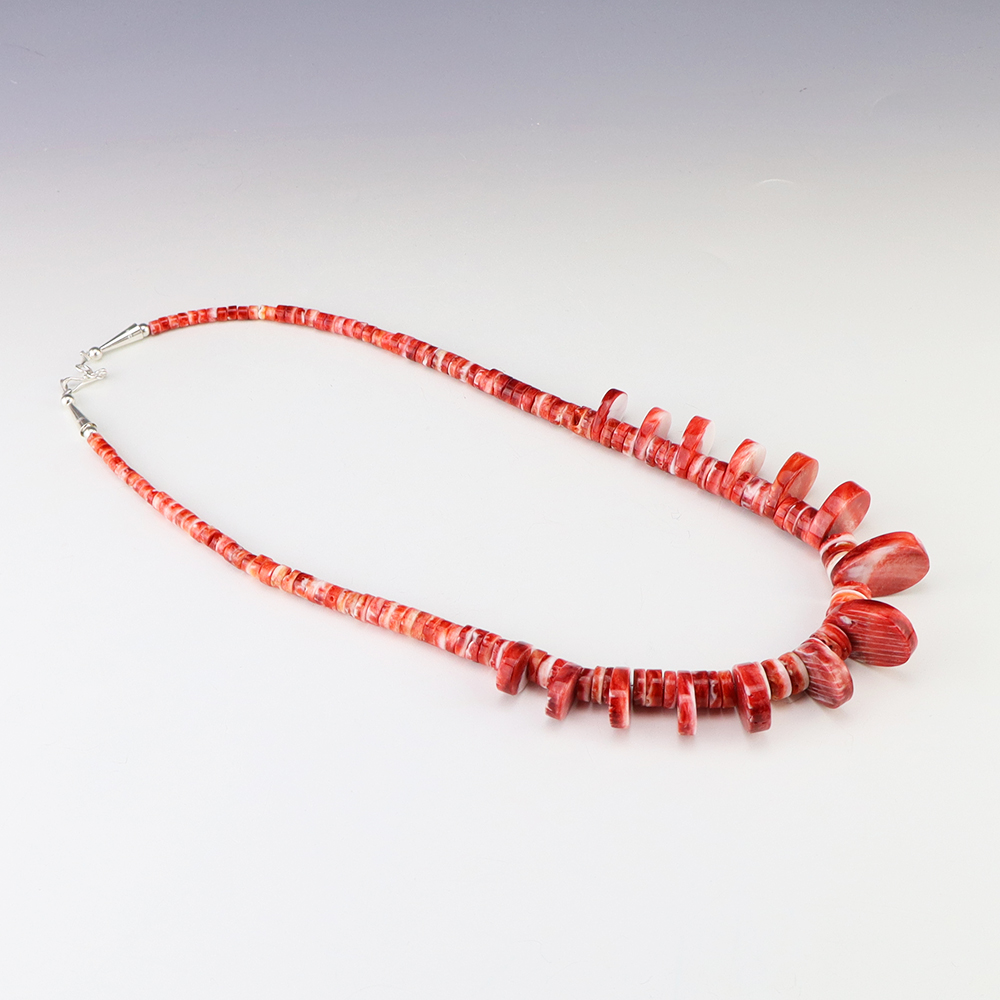 Kewa (Santo Domingo) artists are known for their heishi. The word “heishi“ means “shell” in the Keresan language. Traditionally Santo Domingo jewelry makers created their heishi jewelry out of shell. The shell is hand cut into a flat disc. Today, other stones that Santo Domingo artists cut in this manner, are also referred to as heishi. With modern tools and innovations, artists can create different styles of beads and use different gemstones like turquoise, coral, jet, serpentine, and spiny oyster.