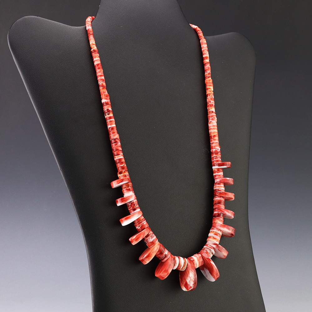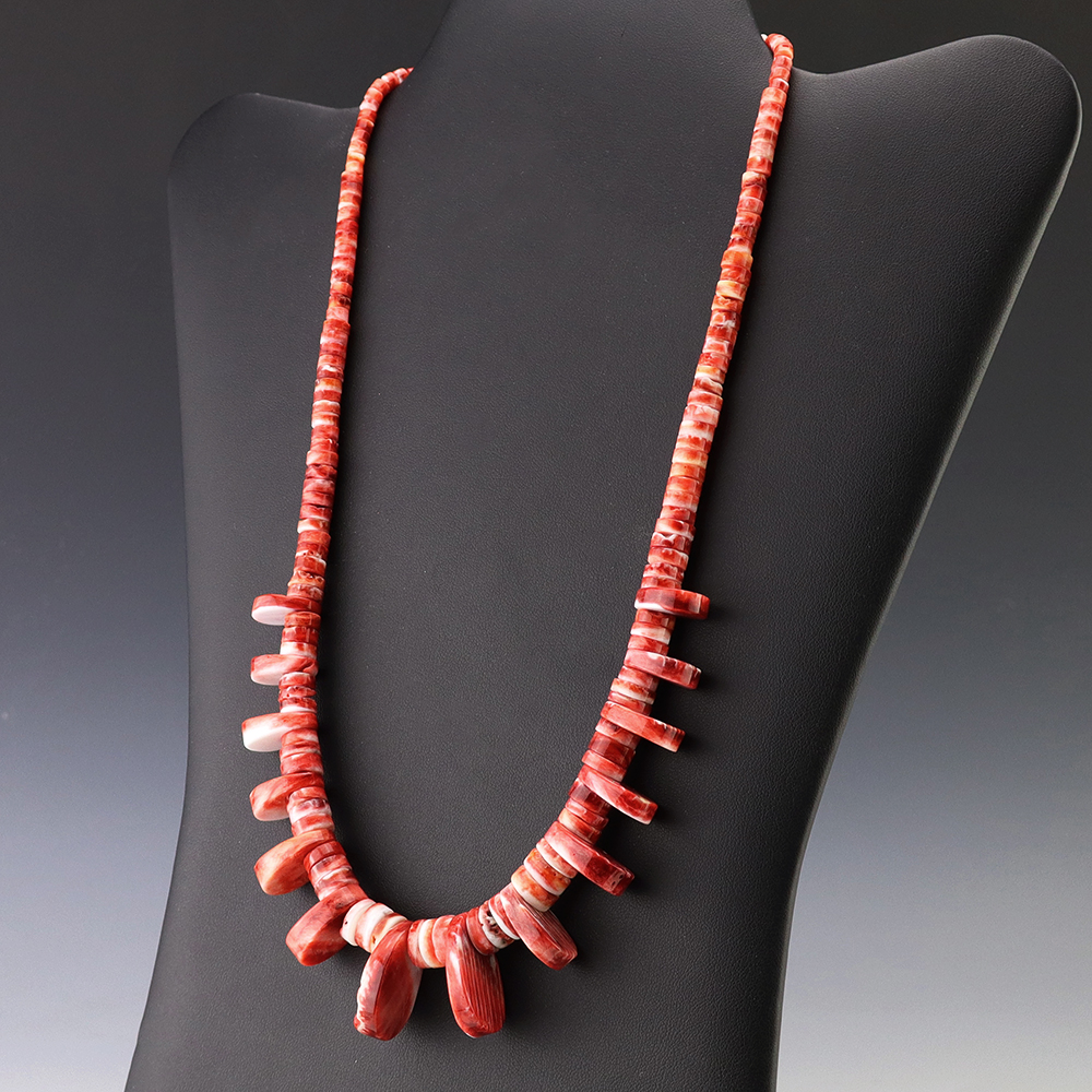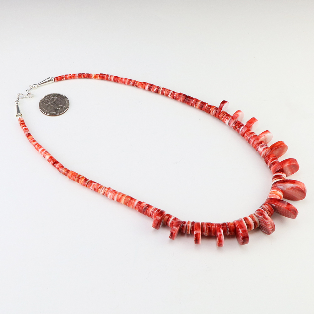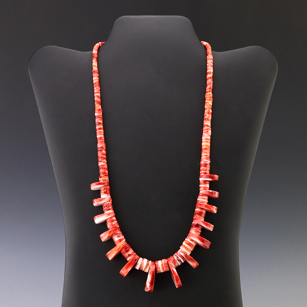 Kewa (Santo Domingo) artists are known for their heishi. The word “heishi“ means “shell” in the Keresan language. Traditionally Santo Domingo jewelry makers created their heishi jewelry out of shell. The shell is hand cut into a flat disc. Today, other stones that Santo Domingo artists cut in this manner, are also referred to as heishi. With modern tools and innovations, artists can create different styles of beads and use different gemstones like turquoise, coral, jet, serpentine, and spiny oyster.