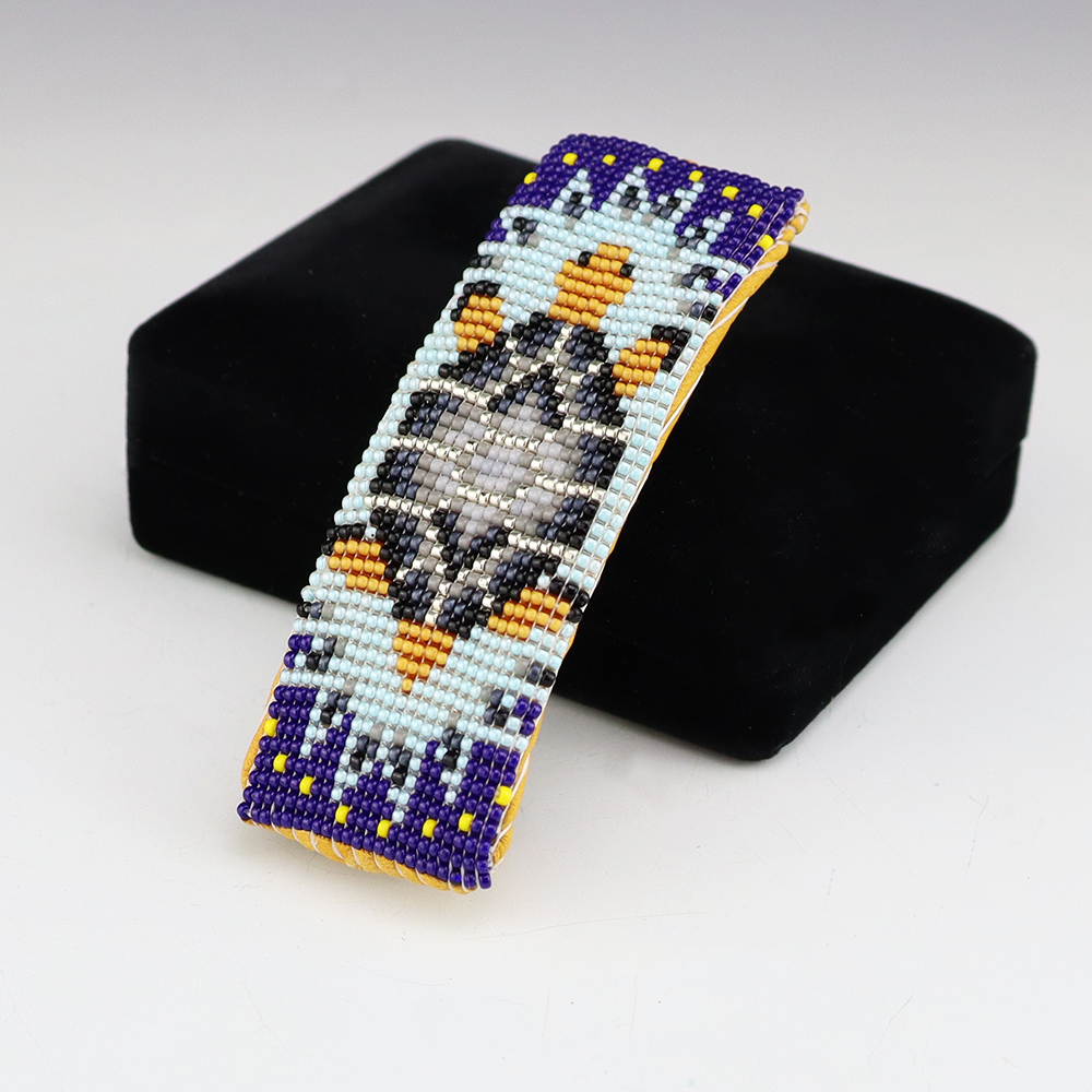 Lovely hand beaded baby bracelet with by Charlene Jackson. Great patterns and colors! The entire inner circumference is about 4 7/8″ including opening of 5/8″. The bracelet is beaded over copper, so you adjust the size. 1/2″ wide When trade beads were introduced to Native Americans, they made these colorful...