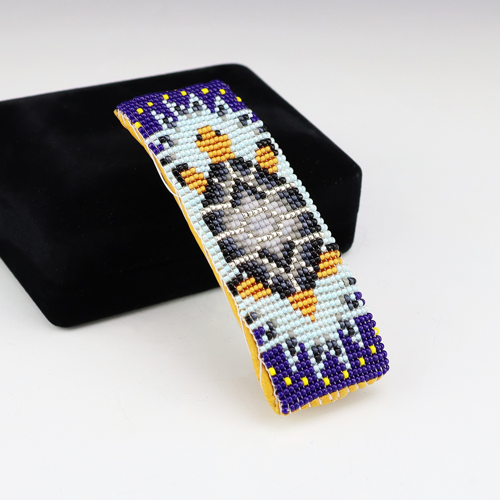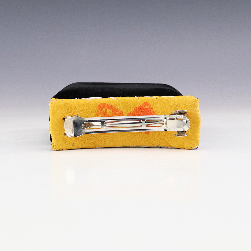 Navajo artist, Rosita Yazzie hand beaded this lovely barrette. Rosita uses tiny seed beads to create her jewelry and backs it with soft leather. Great turtle pattern that is complimented by the wonderful colors.