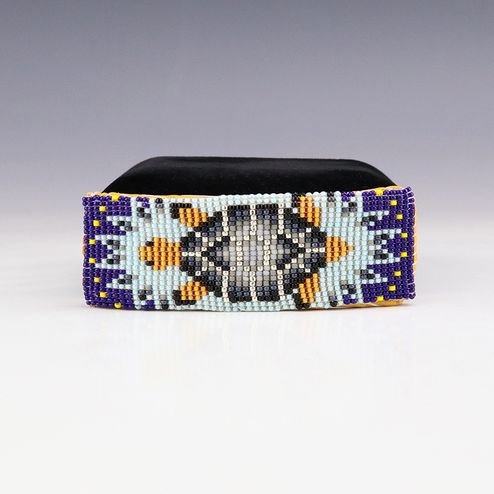 Lovely hand beaded baby bracelet with by Charlene Jackson. Great patterns and colors! The entire inner circumference is about 4 7/8″ including opening of 5/8″. The bracelet is beaded over copper, so you adjust the size. 1/2″ wide When trade beads were introduced to Native Americans, they made these colorful...