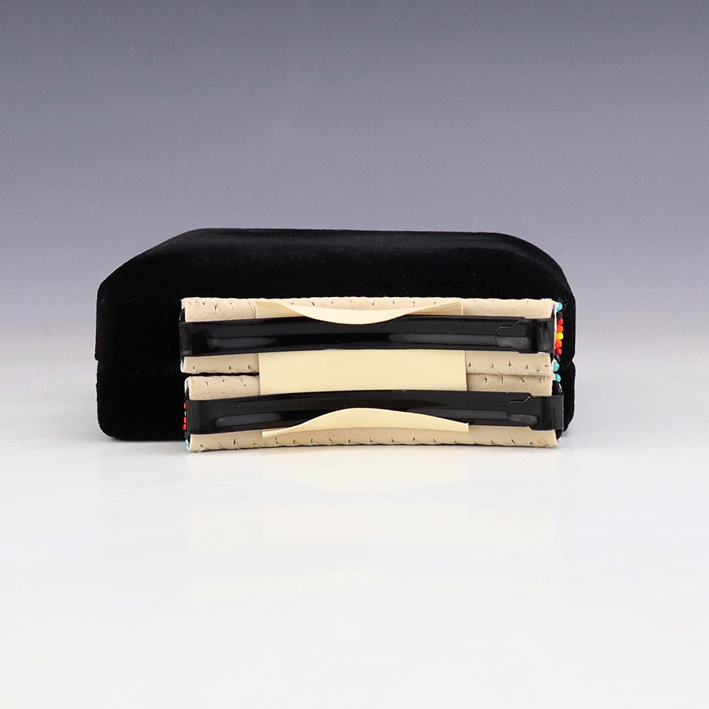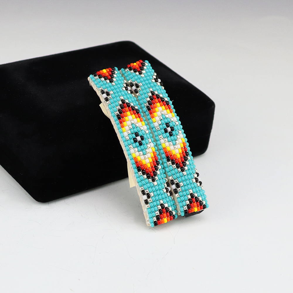 Navajo artist Sharon Hunt hand beaded these beautiful barrettes. Great colors that compliment the design. Sharon uses tiny seed beads to create his jewelry and backs it with soft leather.