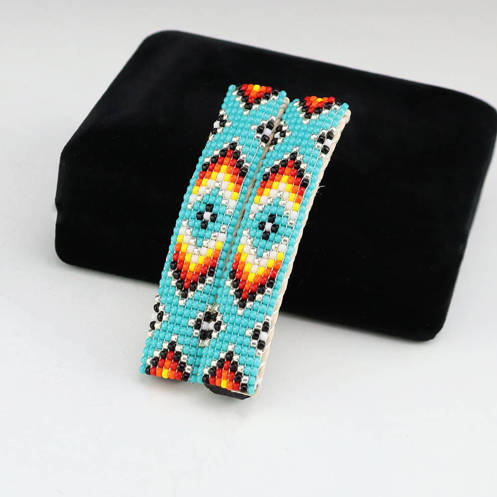 Navajo artist, Charlene Jackson made this lovely beaded bracelet. Great colors and patterns. The bracelet is backed with a soft leather and brass is on the inside, so you can adjust the size. The entire inner circumference is about 7 1/4”, including 1” opening. 1 1/4” wide When trade beads...