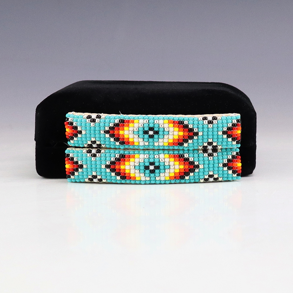 Navajo artist Sharon Hunt hand beaded these beautiful barrettes. Great colors that compliment the design. Sharon uses tiny seed beads to create his jewelry and backs it with soft leather.