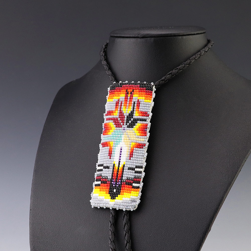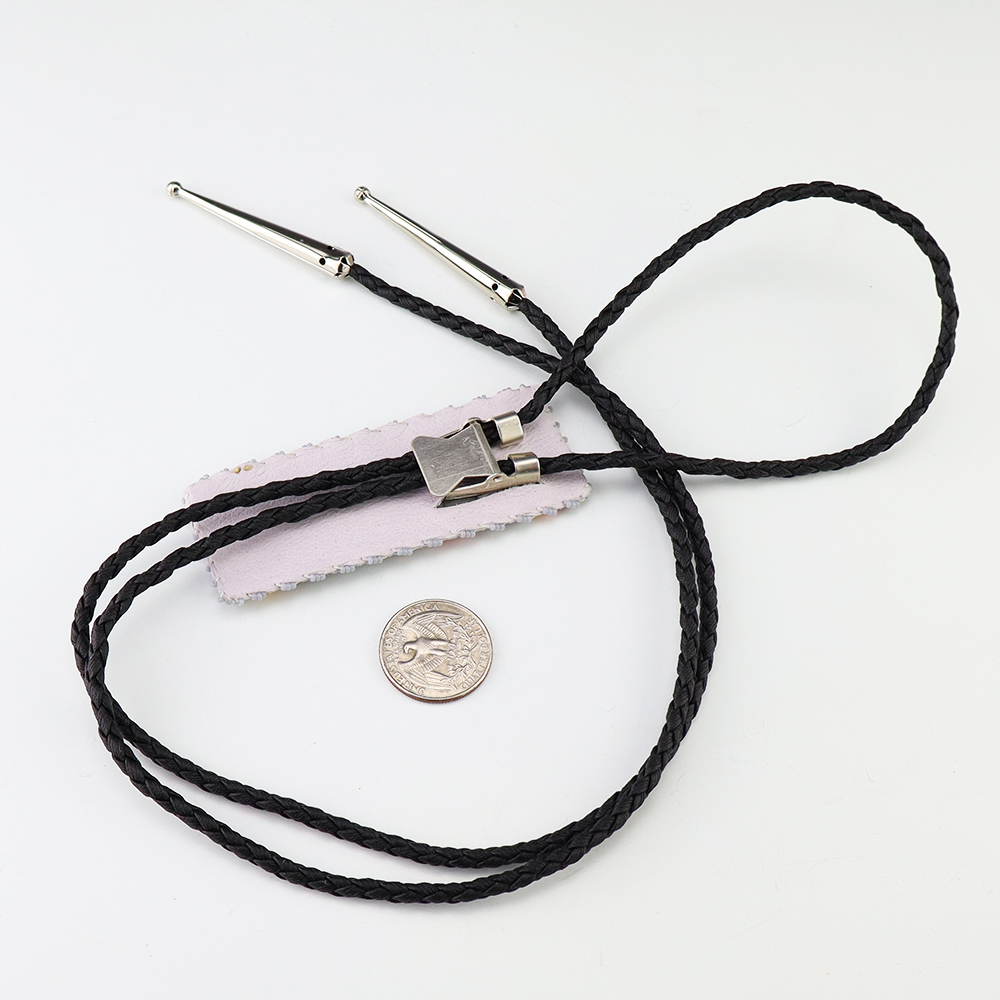 This attractive bolo tie was hand crafted by Navajo artist Helen Dinae. The detail in this bolo tie is great. Great design depicting a prayer feather down the center and geometric designs on the top and sides. Backed with a soft leather.