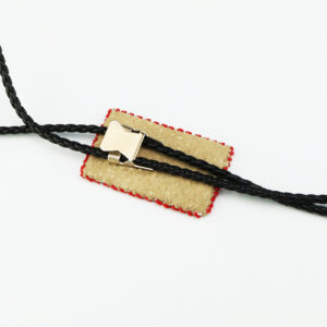 Navajo artist Charlene Jackson made this marvelous bolo tie. The detail in this bolo tie is amazing. Great design depicting a rug pattern down the center. Backed with a soft leather. 1 3/8” wide x 3 1/4” long 36 1/2″ long with bolo strap & tips When trade beads were...