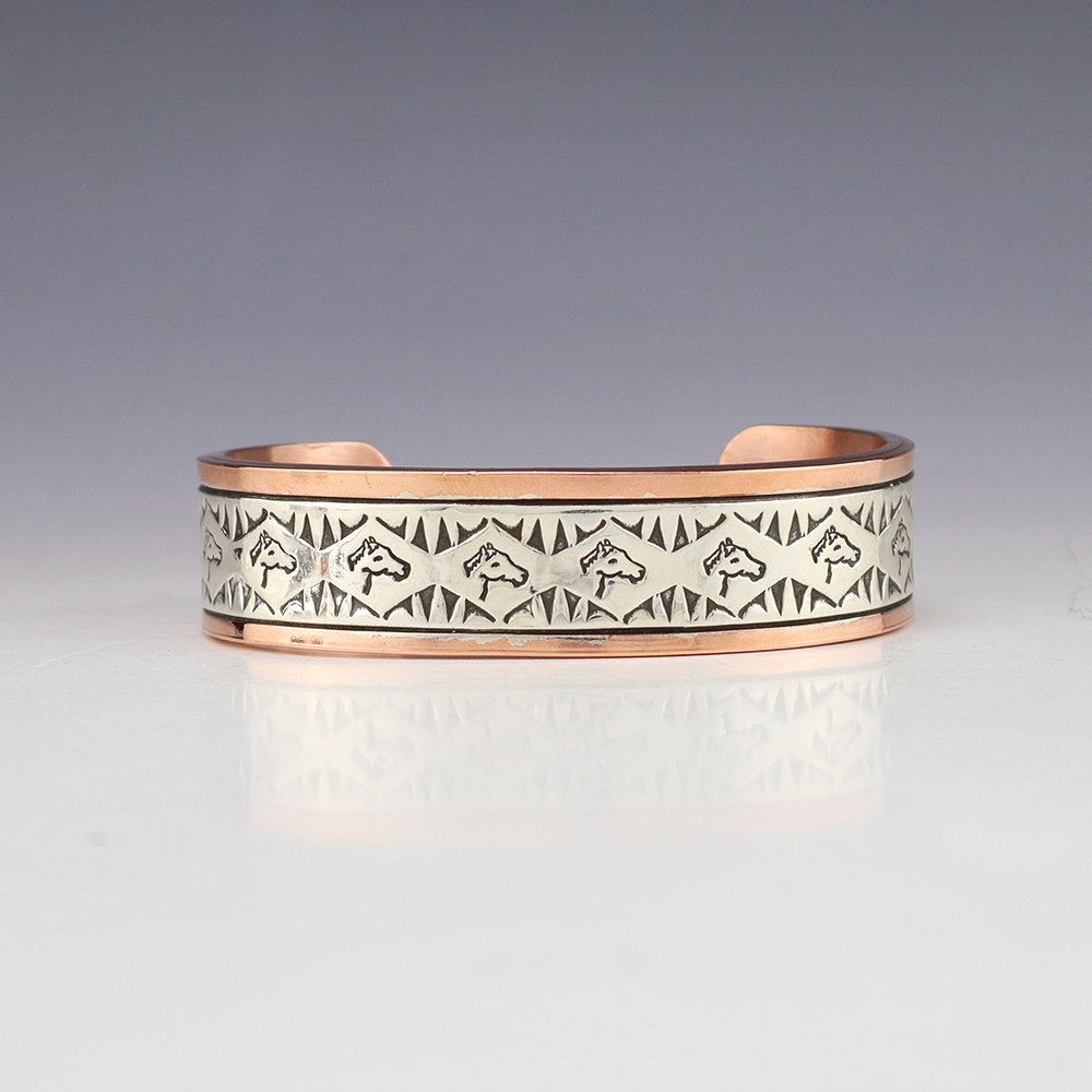 Navajo artist Wylie Secatero made this marvelous bracelet. Sterling silver and Copper with a traditional hand stamped design. Weighs 94 grams. The entire inner circumference is about 8”, including 1 1/2” opening. (Fits a 8″ wrist). Signed