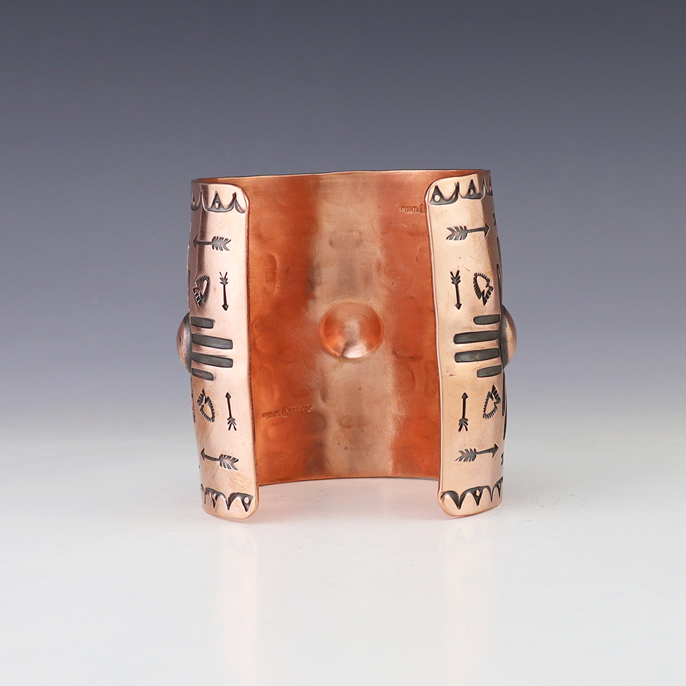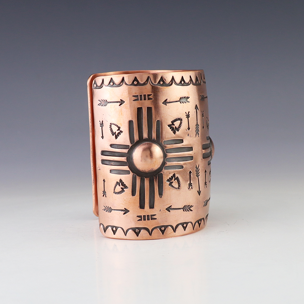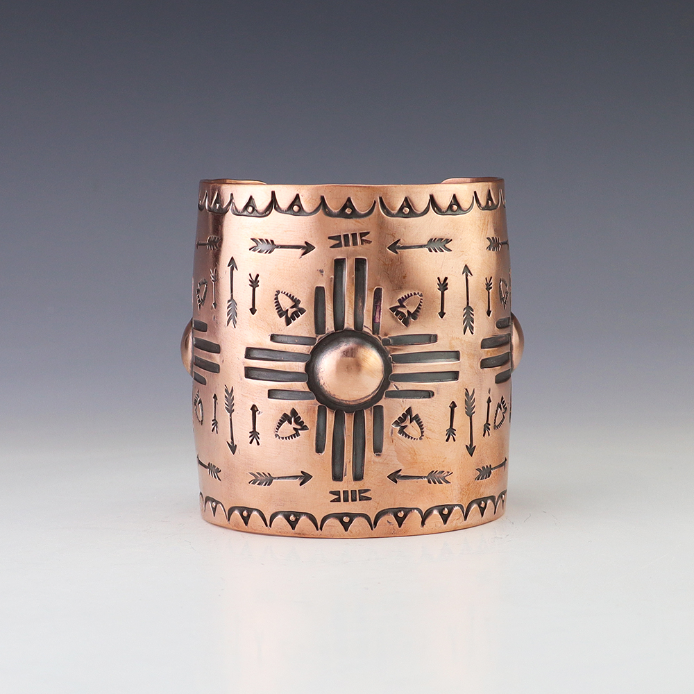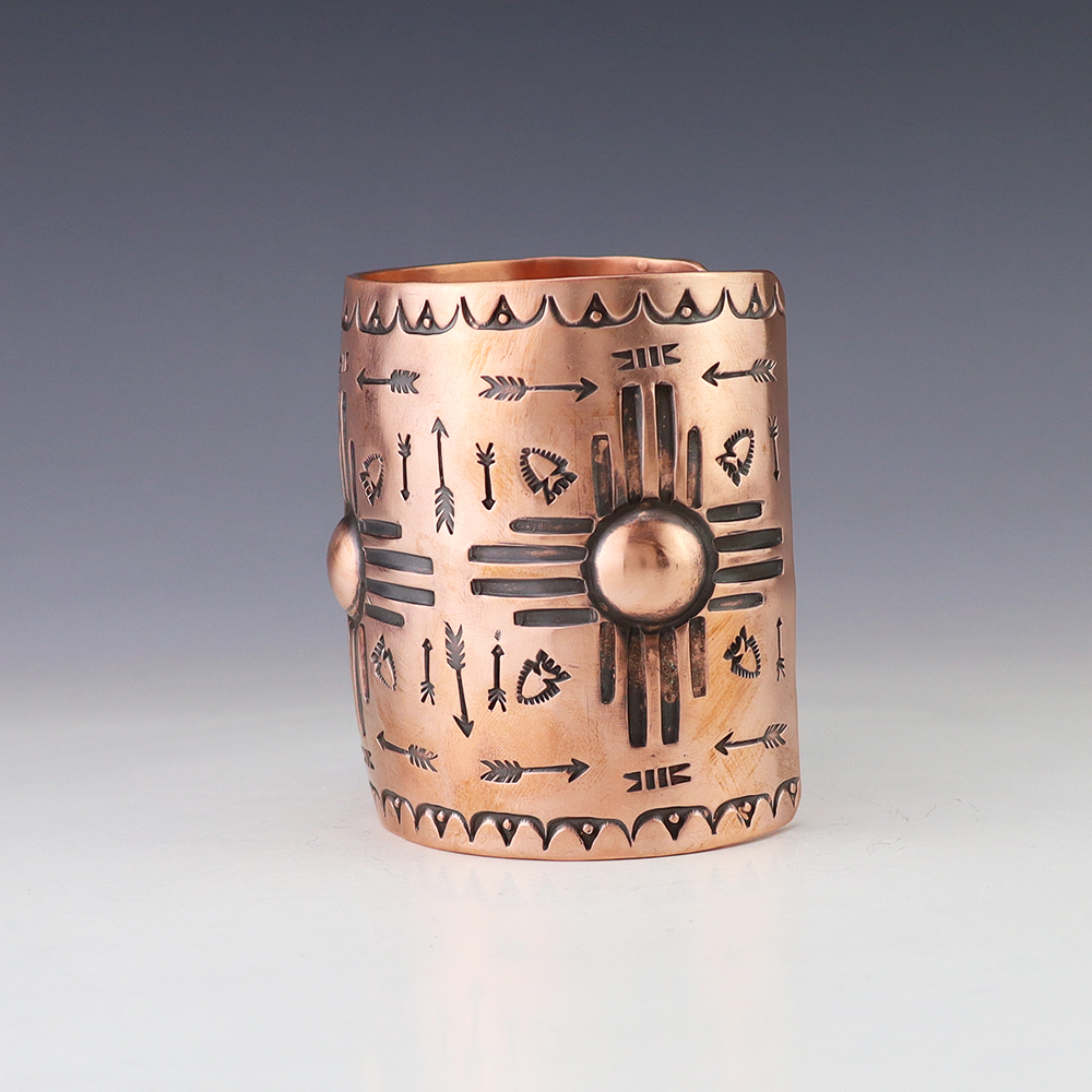 The Navajos began working with silver in the 19th century, and began making things like buckles, bridles, buttons, rings, canteens, hollow beads, earrings, crescent-shaped pendants (called “najas”), bracelets, crosses, powder chargers, tobacco canteens, and conchos (for belts). Their silversmithing skills has evolved and changed throughout the years, and in about 1880 Navajo silversmiths started to set turquoise in their silver work. Traditionally, Navajo artists worked with jewelry techniques like repousee and stamp work, but today they explored in other Native American jewelry making techniques like Zuni inlay work and Hopi overlay work