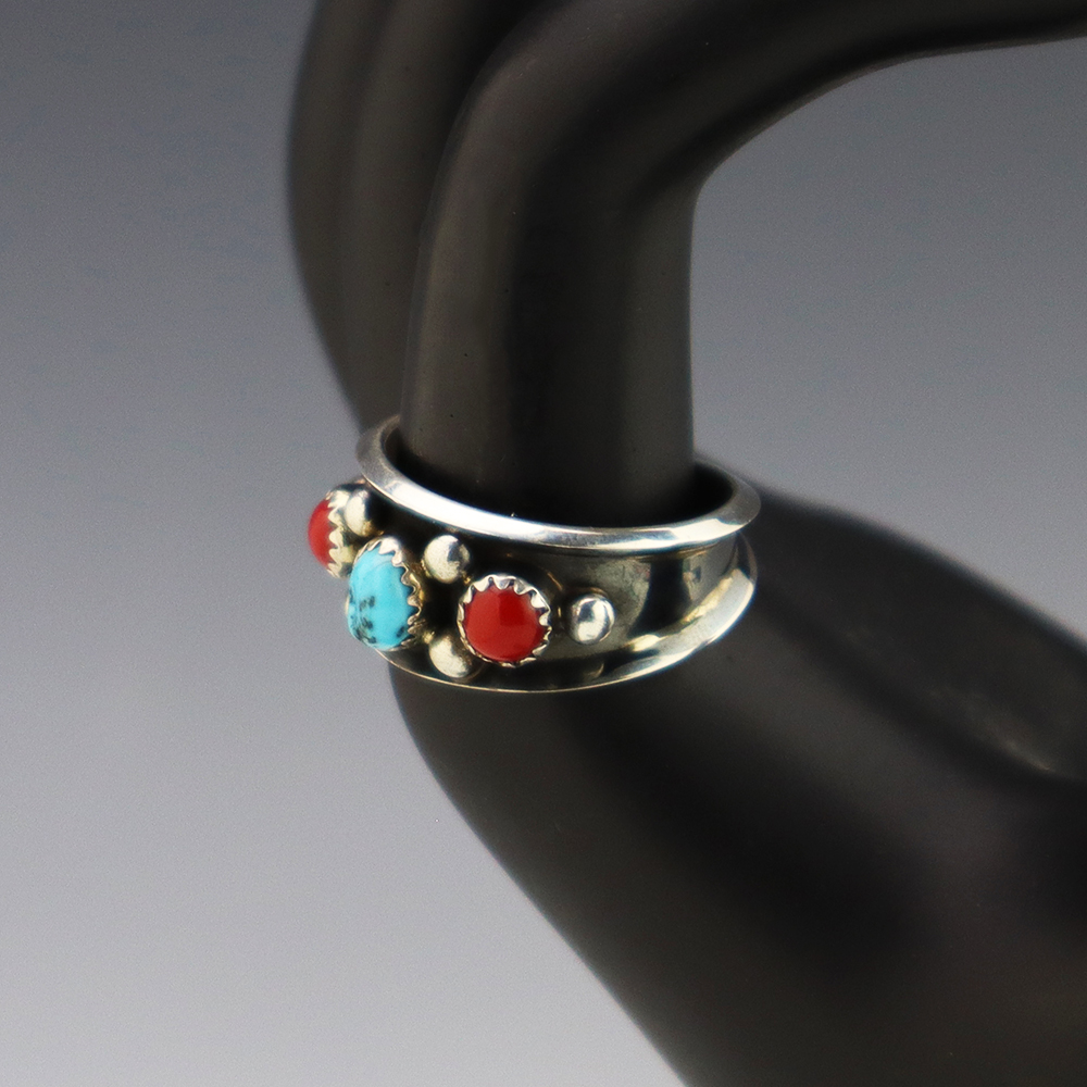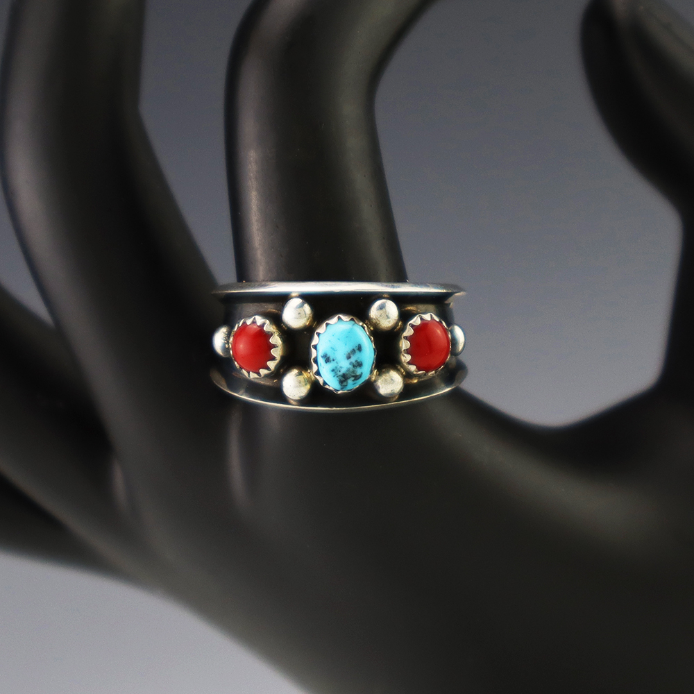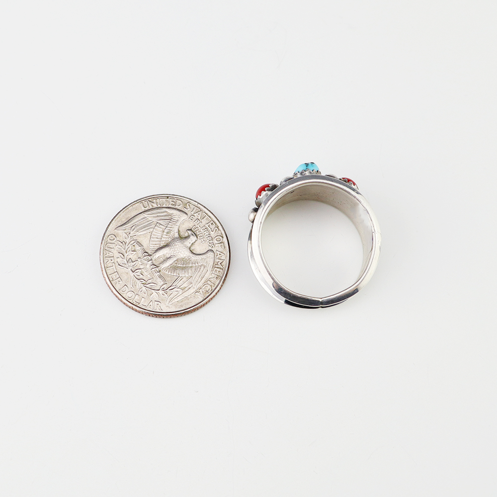 This ring is a great representation of hand made Navajo jewelry and will make a statement on your hand. Beautiful pieces of Turquoise and Coral are set into a sterling silver setting. Hand made by Navajo artist Paul Largo. Weighs 6 grams. Size 10.