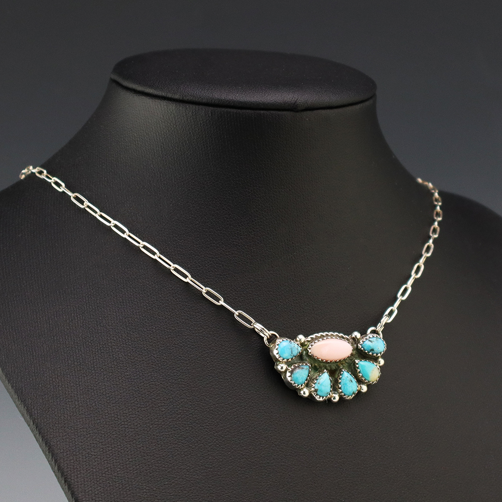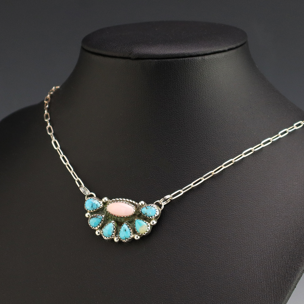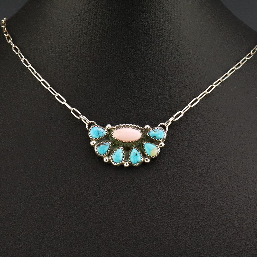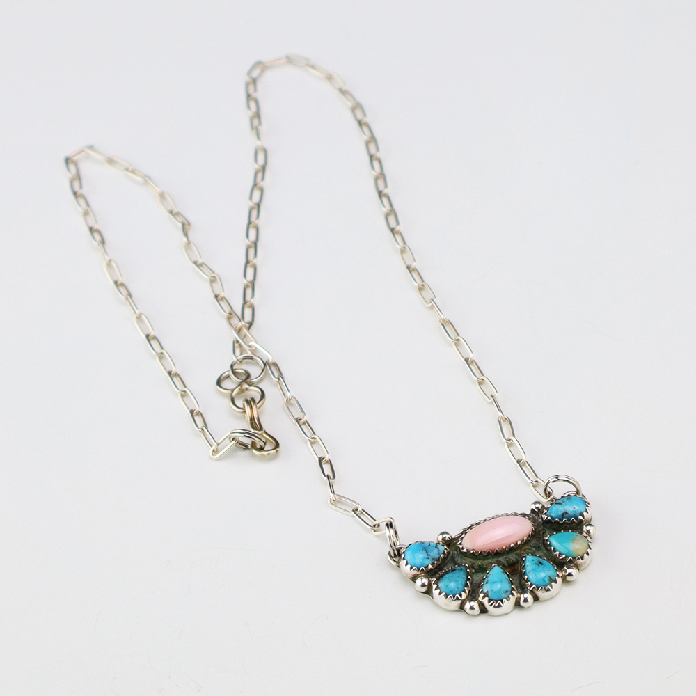 Navajo artist Geraldine James made this beautiful necklace. Sterling silver with Pink Conch and Turquoise stones. This necklace will elevate your jewelry collection and is so versatile, it will look great with any outfit. Weighs 8 grams. Signed