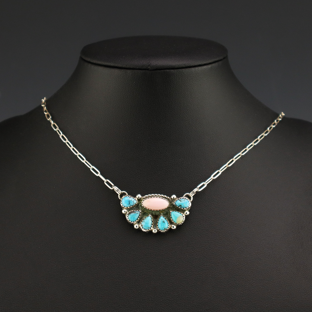 Navajo artist Geraldine James made this beautiful necklace. Sterling silver with Pink Conch and Turquoise stones. This necklace will elevate your jewelry collection and is so versatile, it will look great with any outfit. Weighs 8 grams. Signed