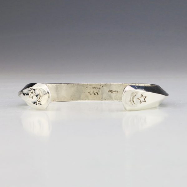 Always in style, triangle bracelets look fabulous alone or stacked with other bracelets. Navajo jeweler Wylie Secatero made this marvelous sterling silver bracelet. Weighs 26 grams. The entire inner circumference is about 6 7/8”, including 1” opening. (Fits a 6 7/8″ wrist). Signed.