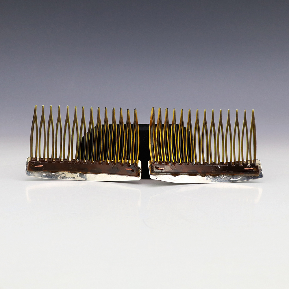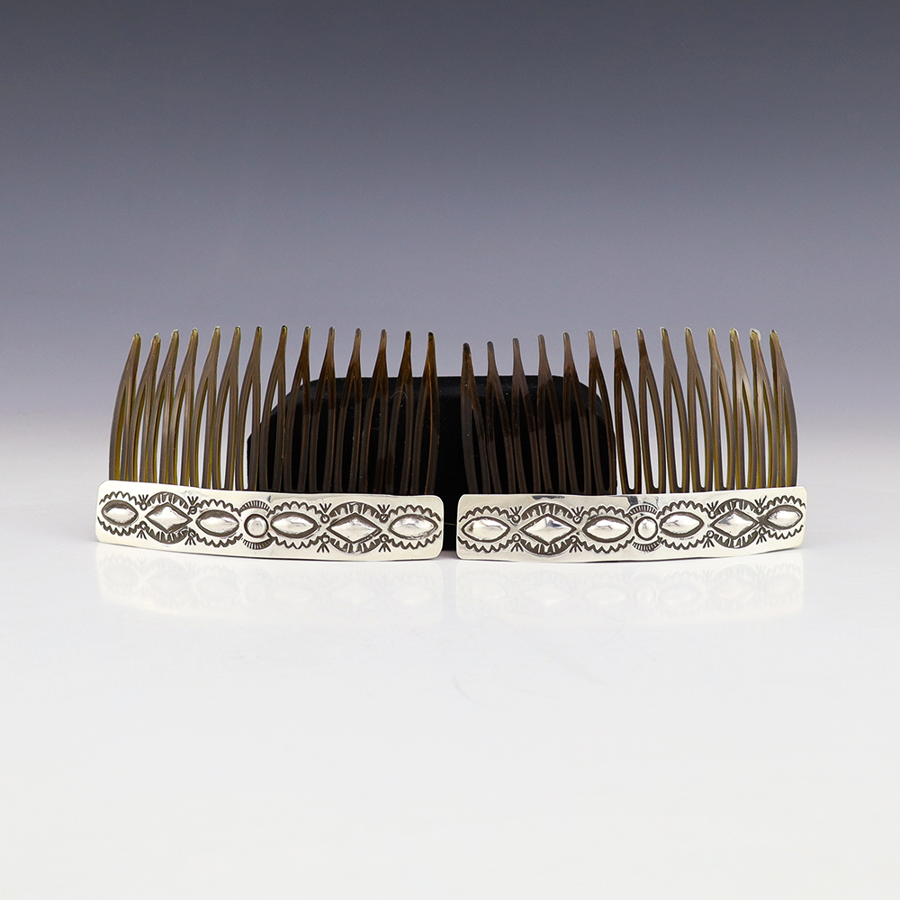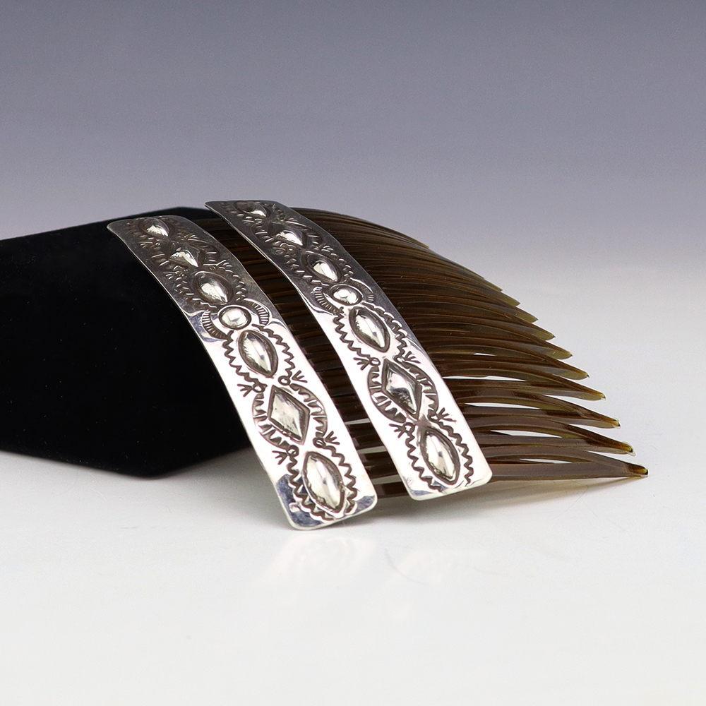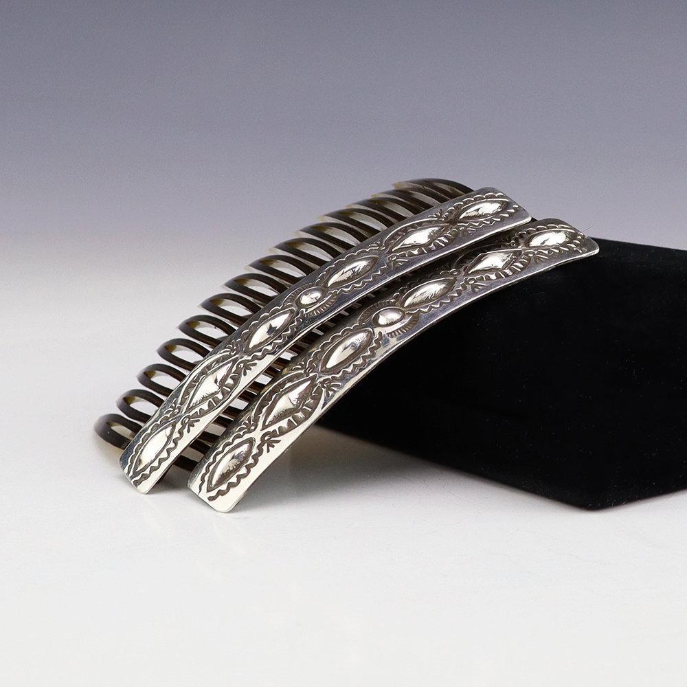Great stamp work! Lovely combs made out of sterling silver by Navajo artist Jennie Blackgoat. Great representation of Navajo silver work. Weighs 20 grams.
