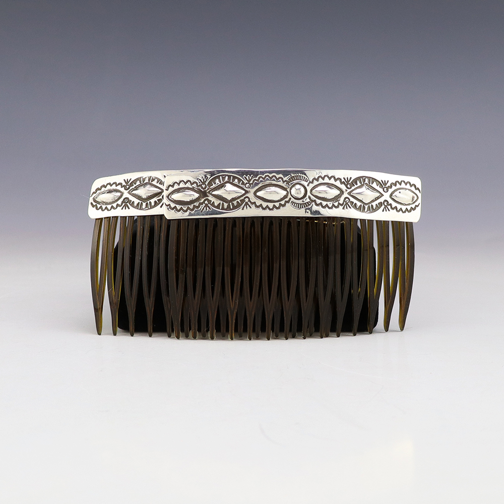 Great stamp work! Lovely combs made out of sterling silver by Navajo artist Jennie Blackgoat. Great representation of Navajo silver work. Weighs 20 grams.