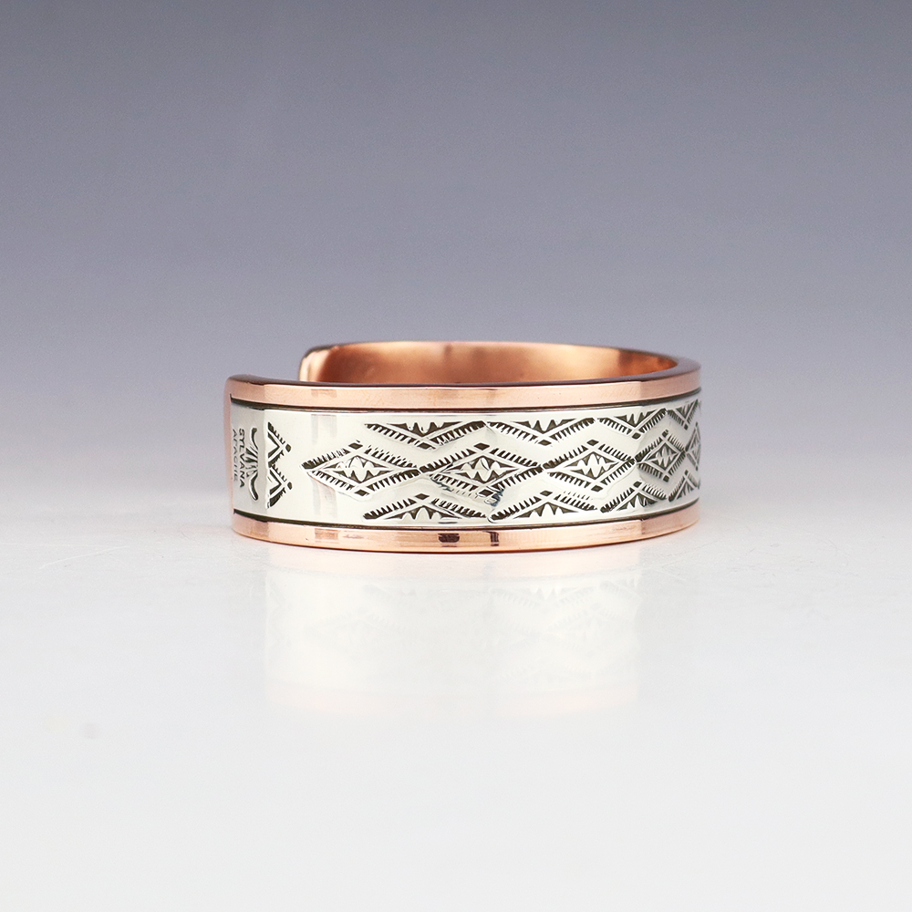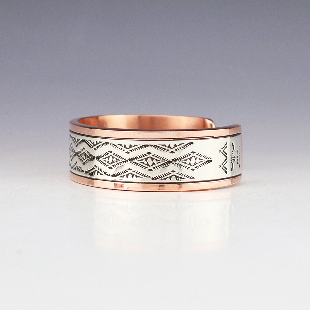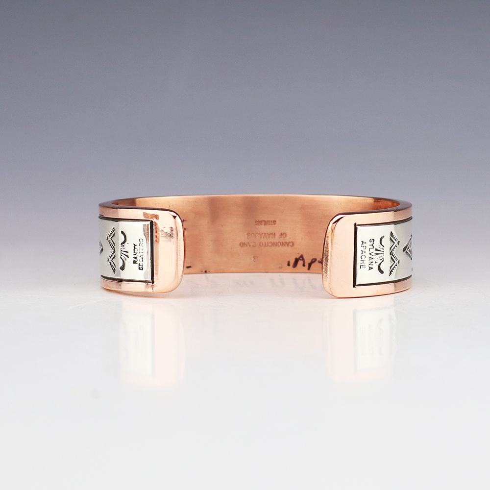 Navajo artists Randy Secatero and Sylvana Apache hand crafted this stellar bracelet. Sterling silver and Copper with a traditional hand stamped design. Weighs 92 grams. The entire inner circumference is about 7 1/2”, including 1 1/8” opening. (Fits a 7 1/2″ wrist) Signed
