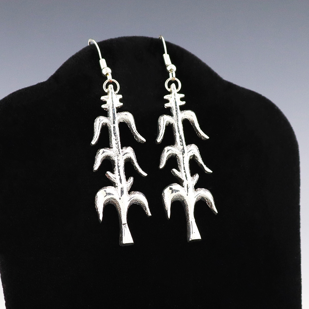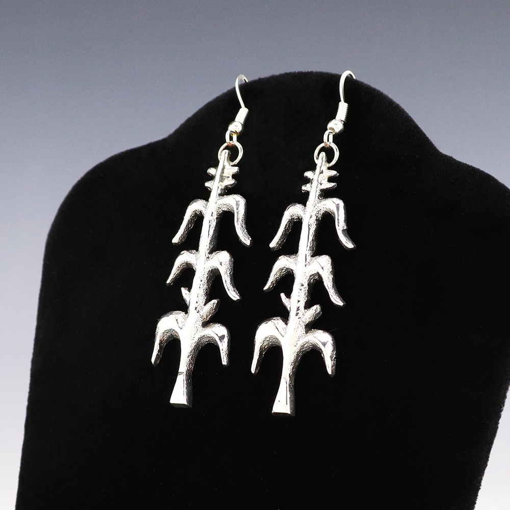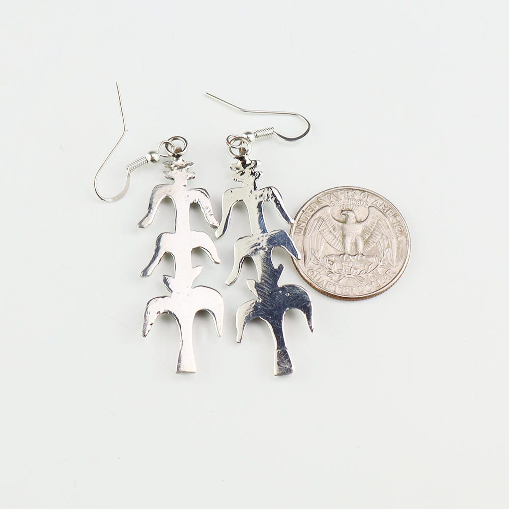 In the mid 1800s, Navajo silversmiths started to use sand casting as one of their silversmithing techniques. Today, silversmiths still use this technique by carving a design in tufa stone (a porous limestone) and then placing another stone against it. The two pieces are fastened together and molten silver is poured in. Once it has cooled, the artist takes the piece out and finishes it. Navajo artist Gary Custer hand crafted these gorgeous earrings in this manner. These earrings are oxidized to give it a vintage look. Gary has accomplished many silversmithing techniques, learning the traditions from his family of silversmiths. Weighs 12 grams.