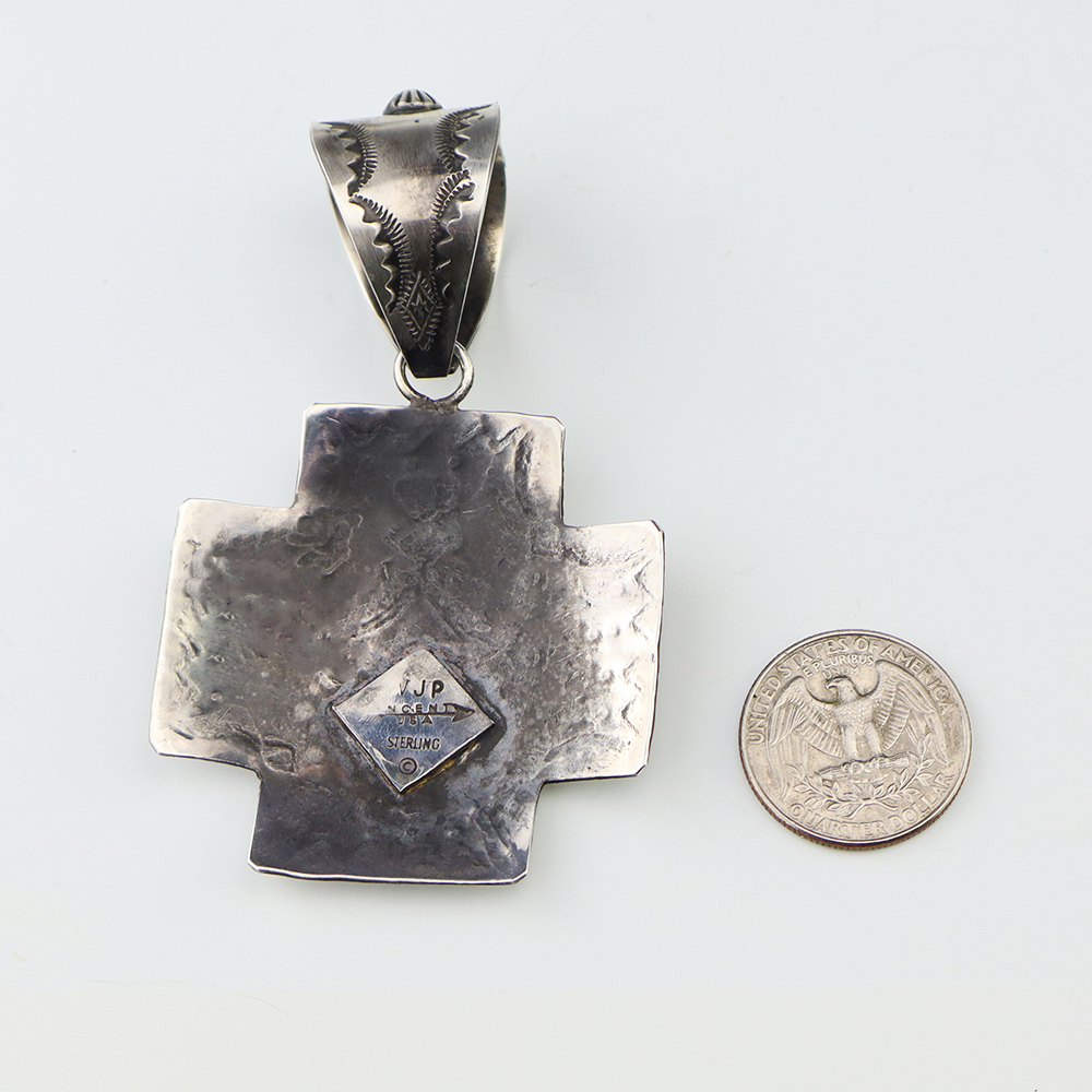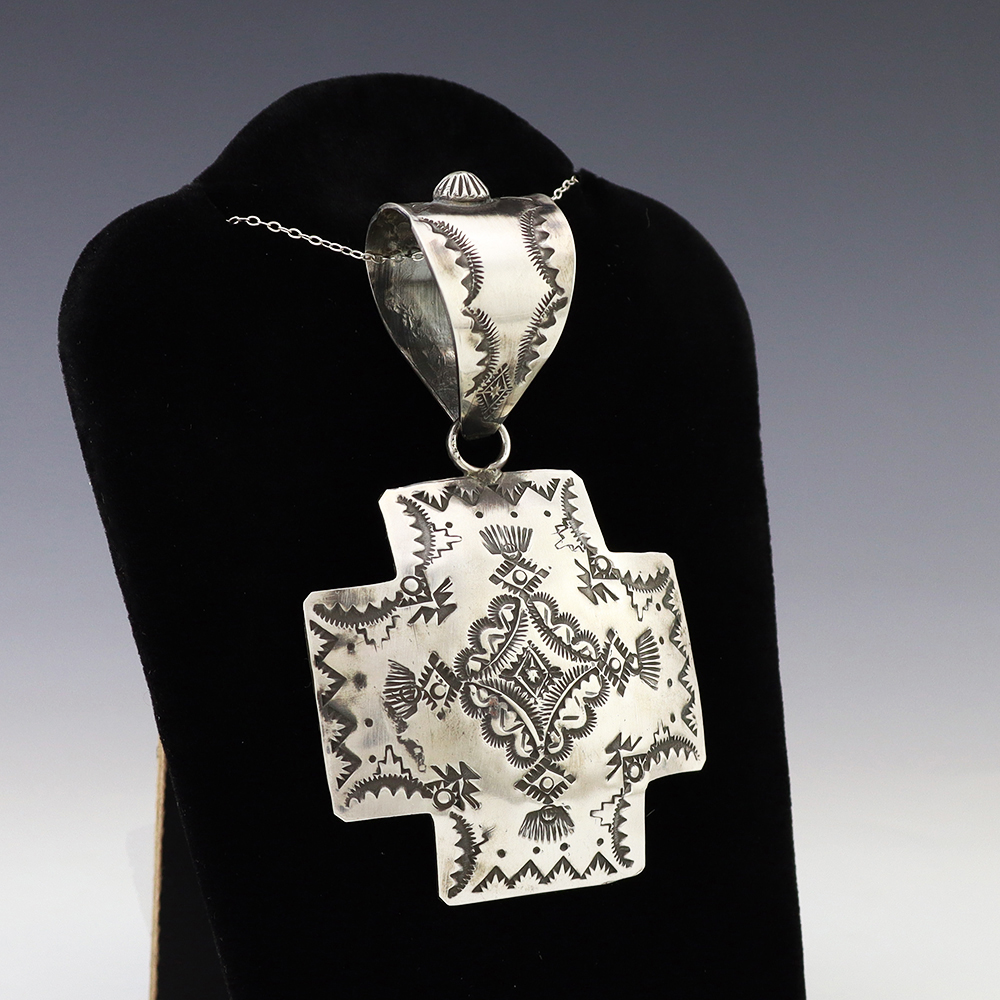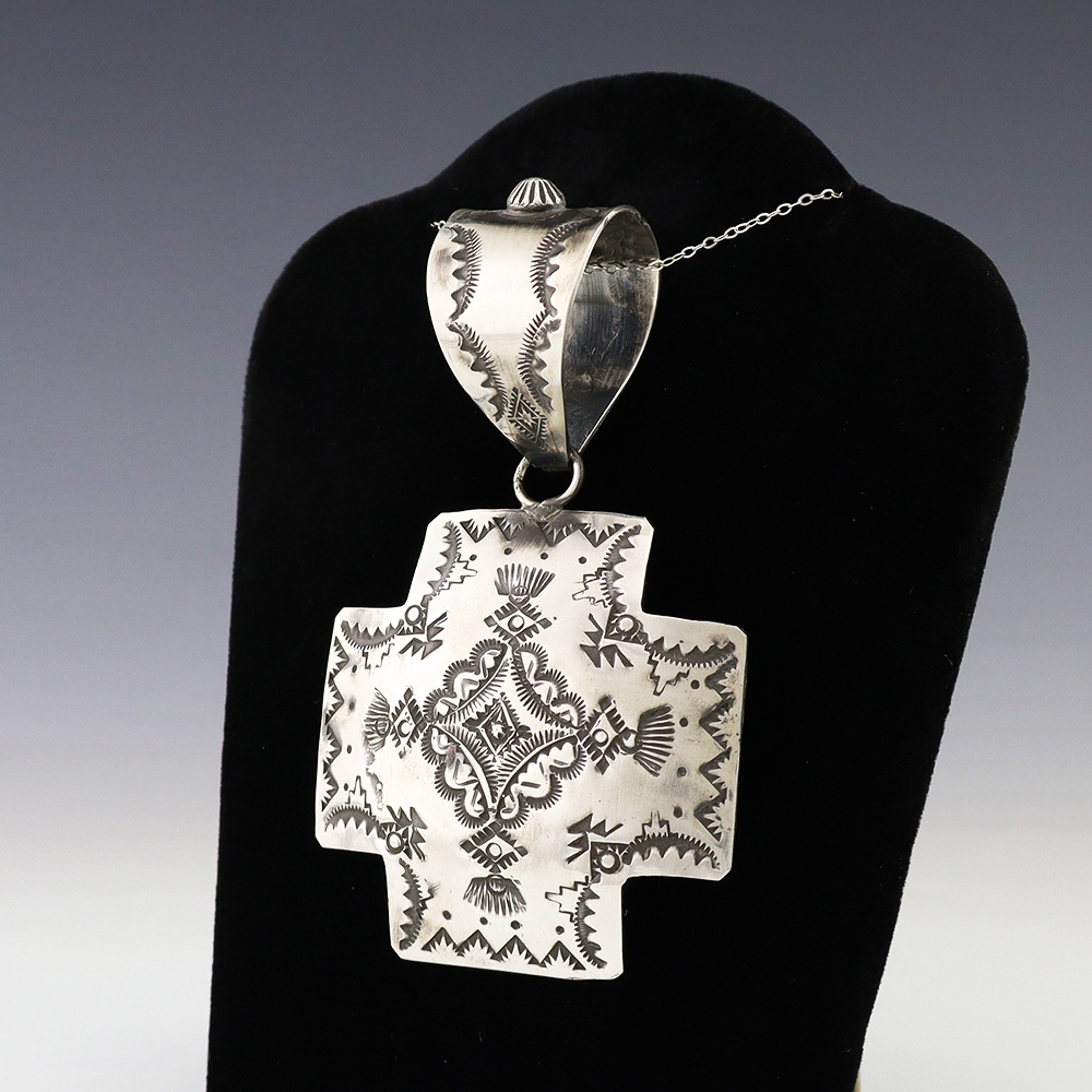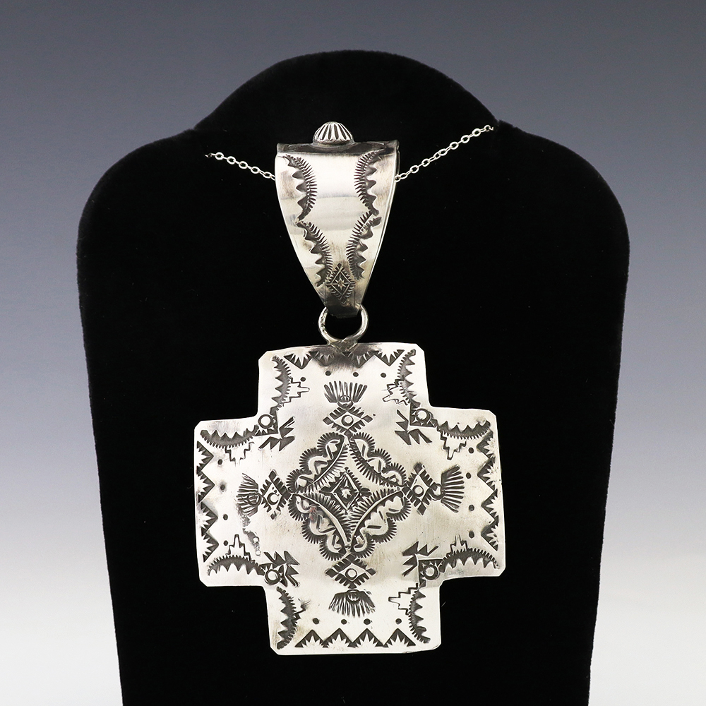 Navajo silversmith Vincent Platero handcrafted this beautiful cross pendant out of sterling silver. The pendant is hand stamped and has a satin finish. A timeless beauty that you will enjoy for years to come. Weighs 28 grams. Signed. (Chain not included)