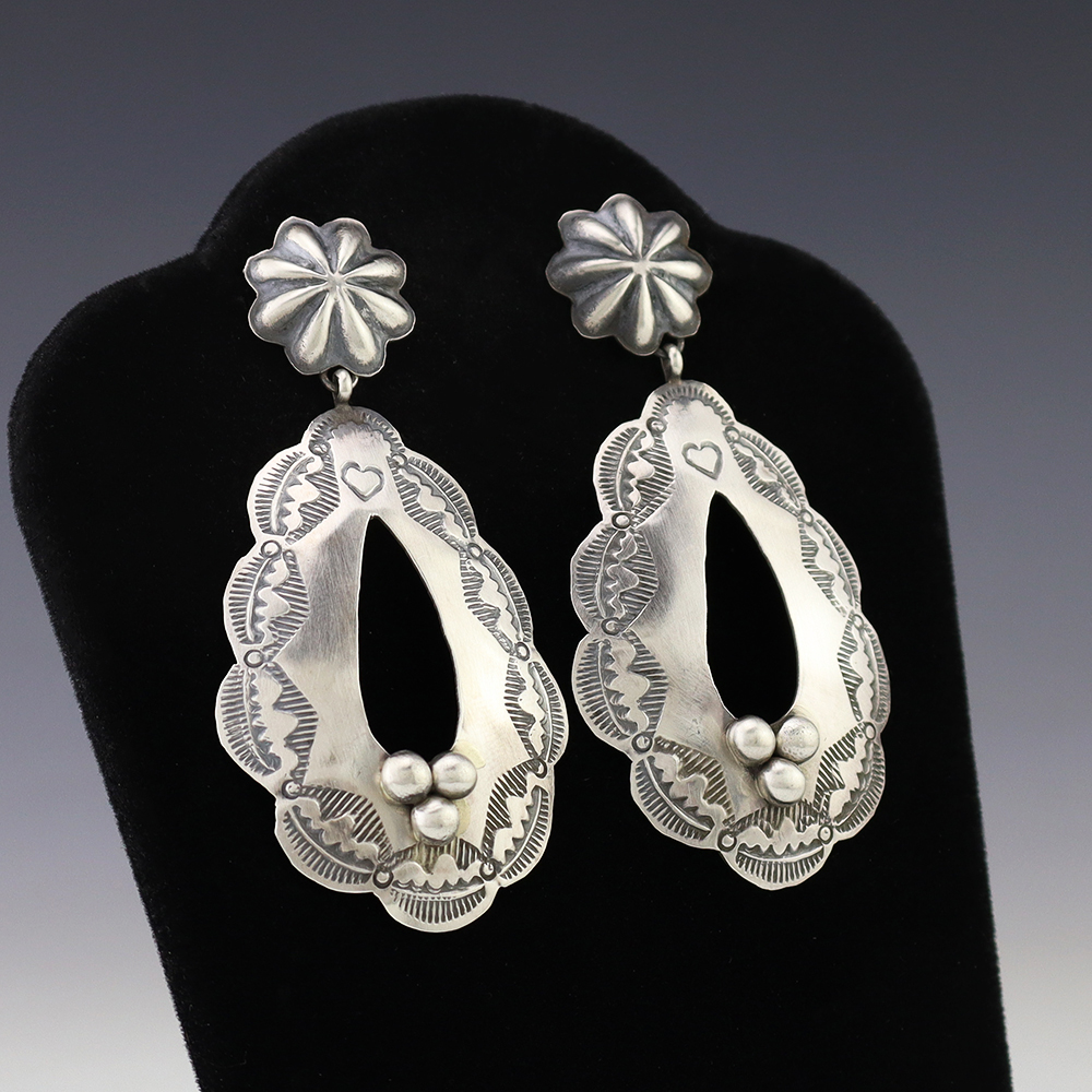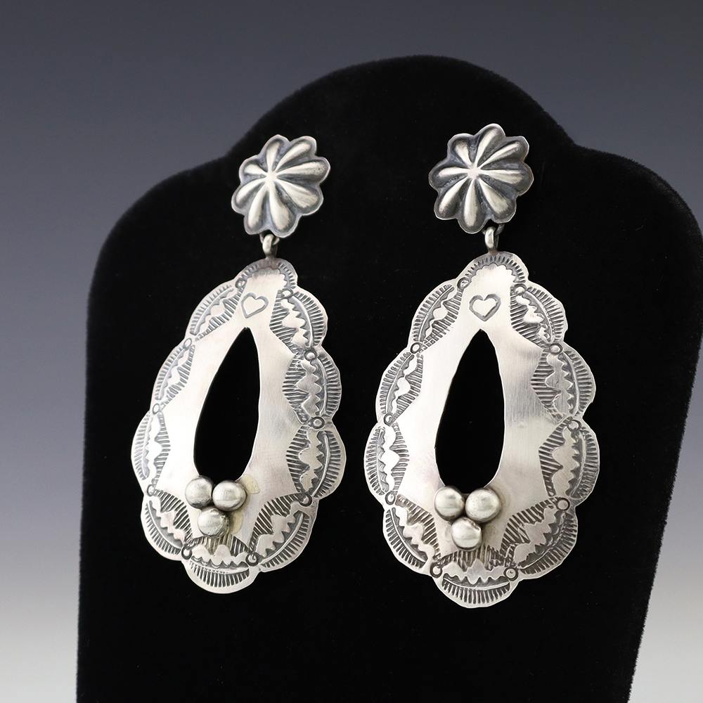 The Navajos began working with silver in the 19th century, and began making things like buckles, bridles, buttons, rings, canteens, hollow beads, earrings, crescent-shaped pendants (called “najas”), bracelets, crosses, powder chargers, tobacco canteens, and conchos (for belts). Their silversmithing skills has evolved and changed throughout the years, and in about 1880 Navajo silversmiths started to set turquoise in their silver work. Traditionally, Navajo artists worked with jewelry techniques like repousee and stamp work, but today they explored in other Native American jewelry making techniques like Zuni inlay work and Hopi overlay work.