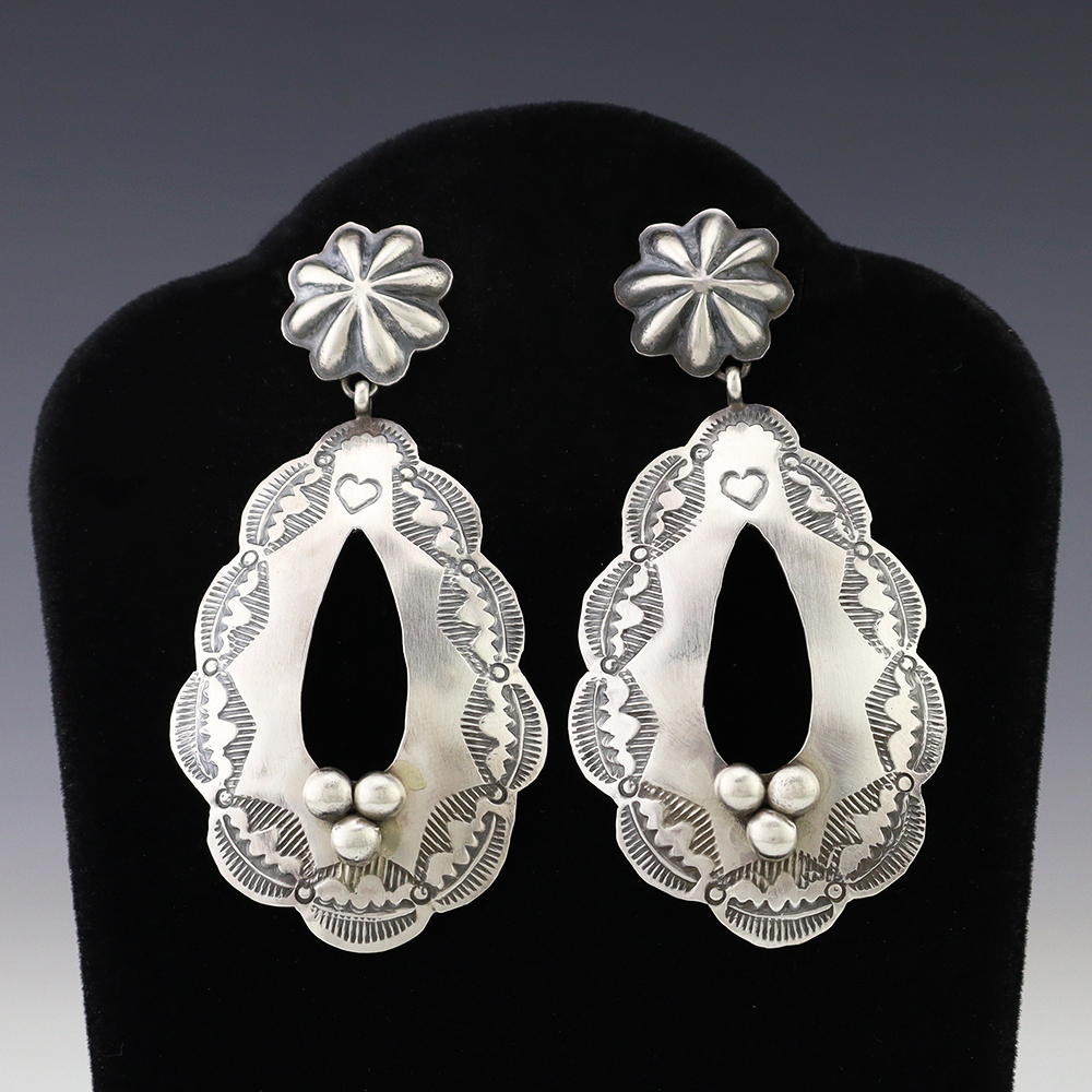 The Navajos began working with silver in the 19th century, and began making things like buckles, bridles, buttons, rings, canteens, hollow beads, earrings, crescent-shaped pendants (called “najas”), bracelets, crosses, powder chargers, tobacco canteens, and conchos (for belts). Their silversmithing skills has evolved and changed throughout the years, and in about 1880 Navajo silversmiths started to set turquoise in their silver work. Traditionally, Navajo artists worked with jewelry techniques like repousee and stamp work, but today they explored in other Native American jewelry making techniques like Zuni inlay work and Hopi overlay work.