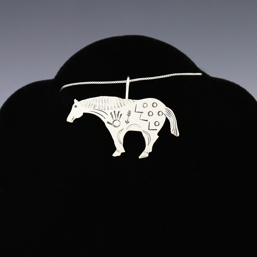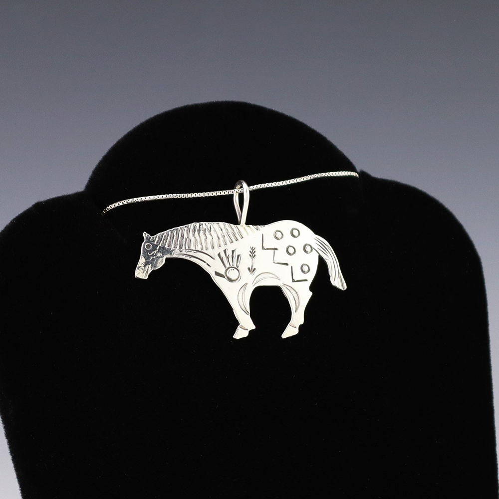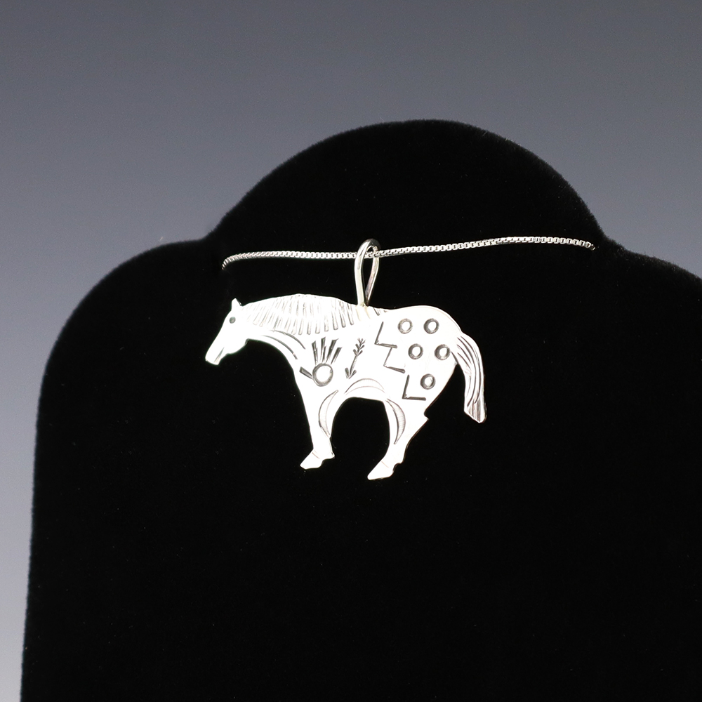 Navajo silversmith Lucille Platero made this lovely horse pendant out of sterling silver. A timeless beauty that you will enjoy for years to come. Weighs 2 grams. (chain not included)