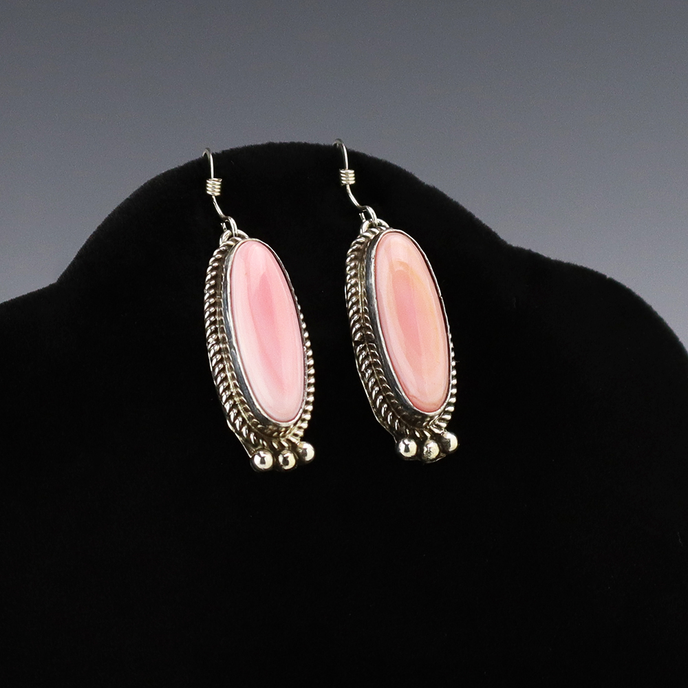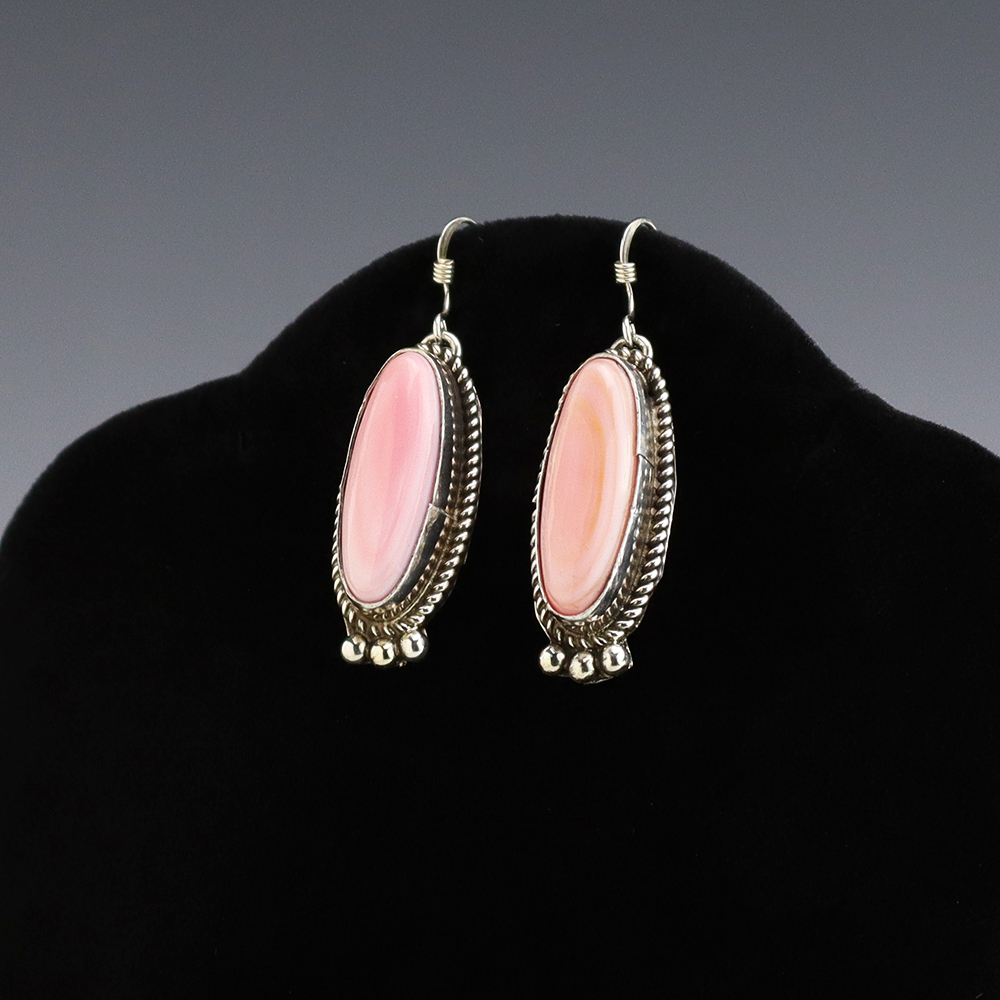 Beautiful earrings hand made out of sterling silver and Pink Conch by Navajo silversmith Priscilla Smith. These wonderful earrings will become a versatile accessory in your jewelry collection. Weighs 8 grams. Signed